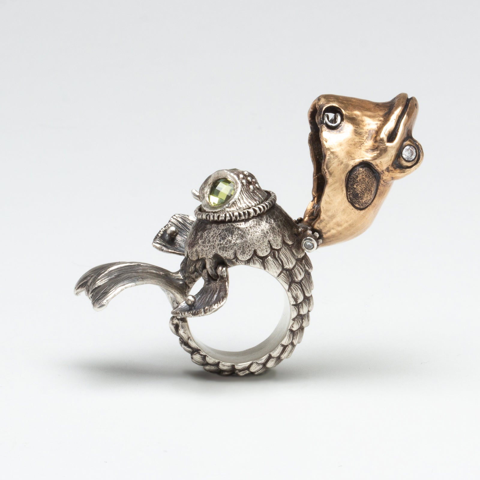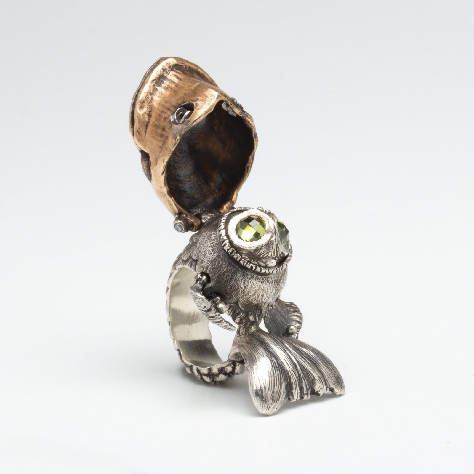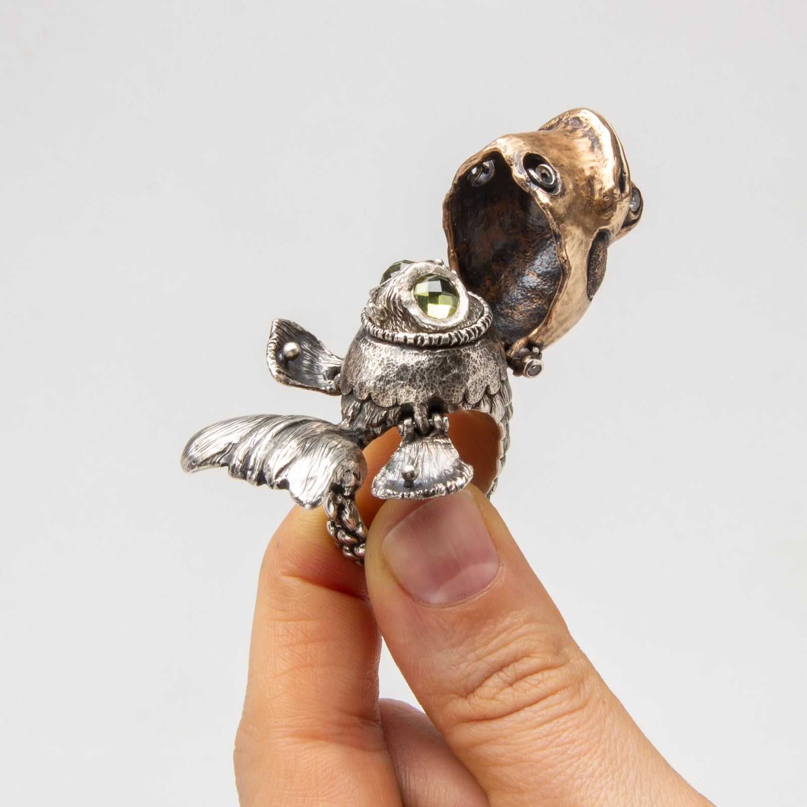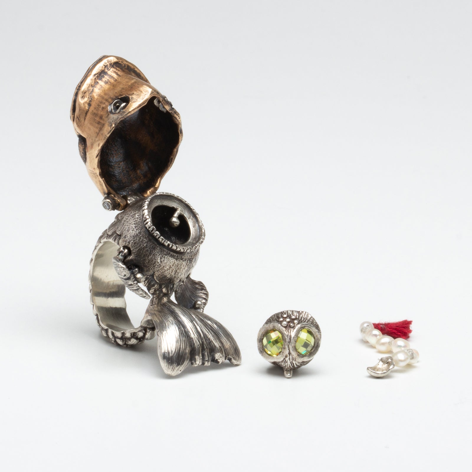 Artist Bio: Based in Western New York State, Kate Caswell specializes in wax carving and lost wax casting. Graduating with a BFA in metals at RIT’s School for American Crafts, she spent many years traveling and working in the production jewelry industry. Kate has made a name for herself with her unique forms, crafting “wearable art” with a tongue-in-cheek attitude and a focus on nature themes.