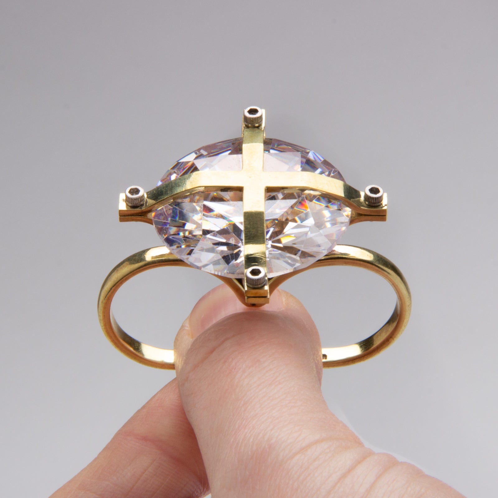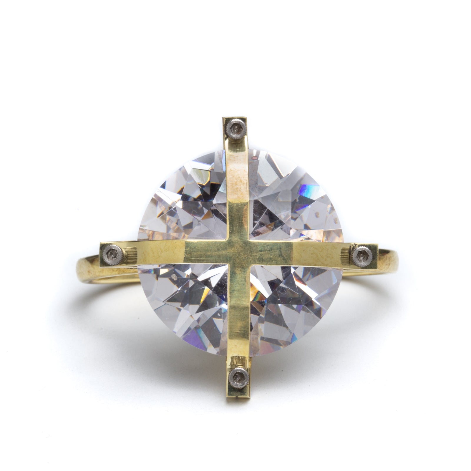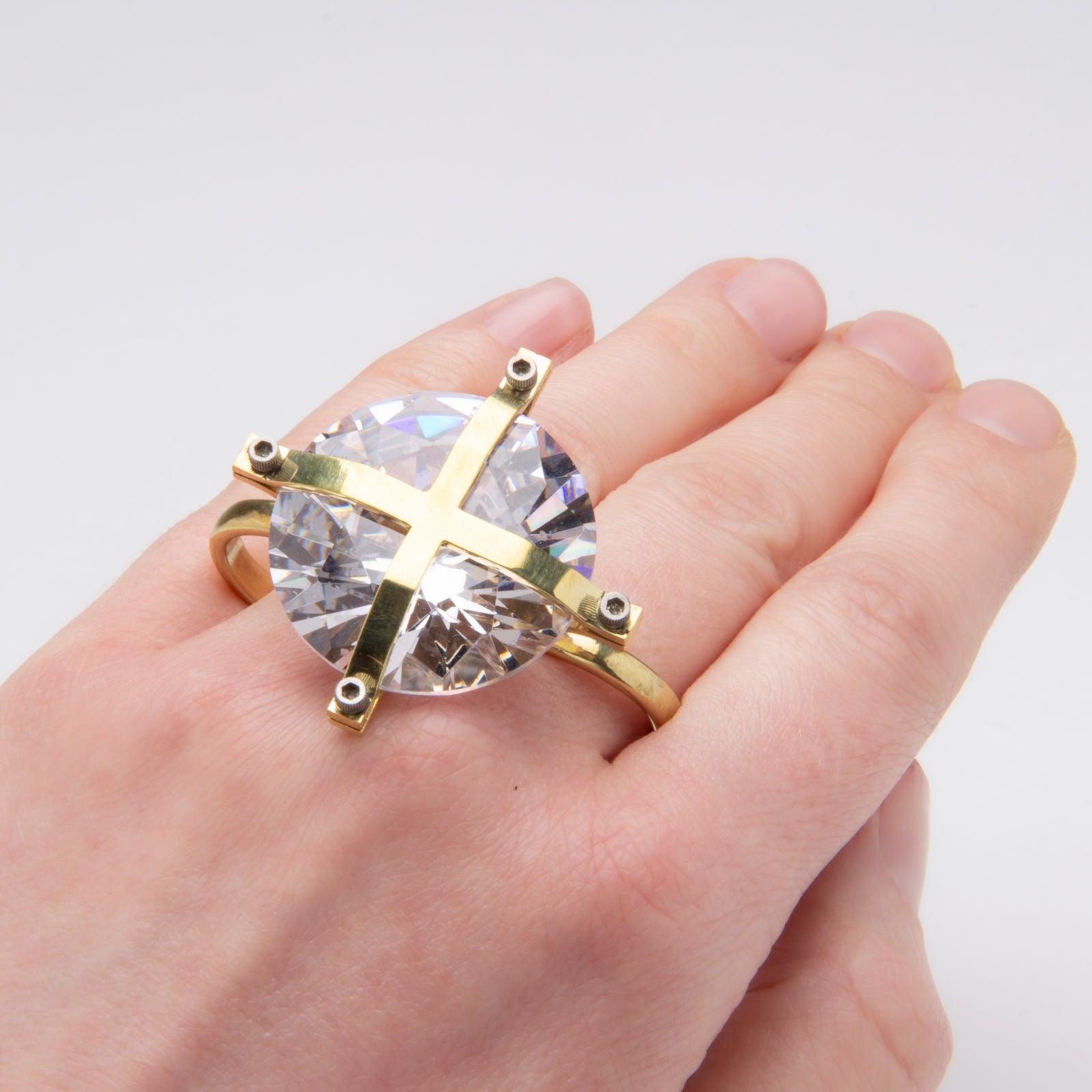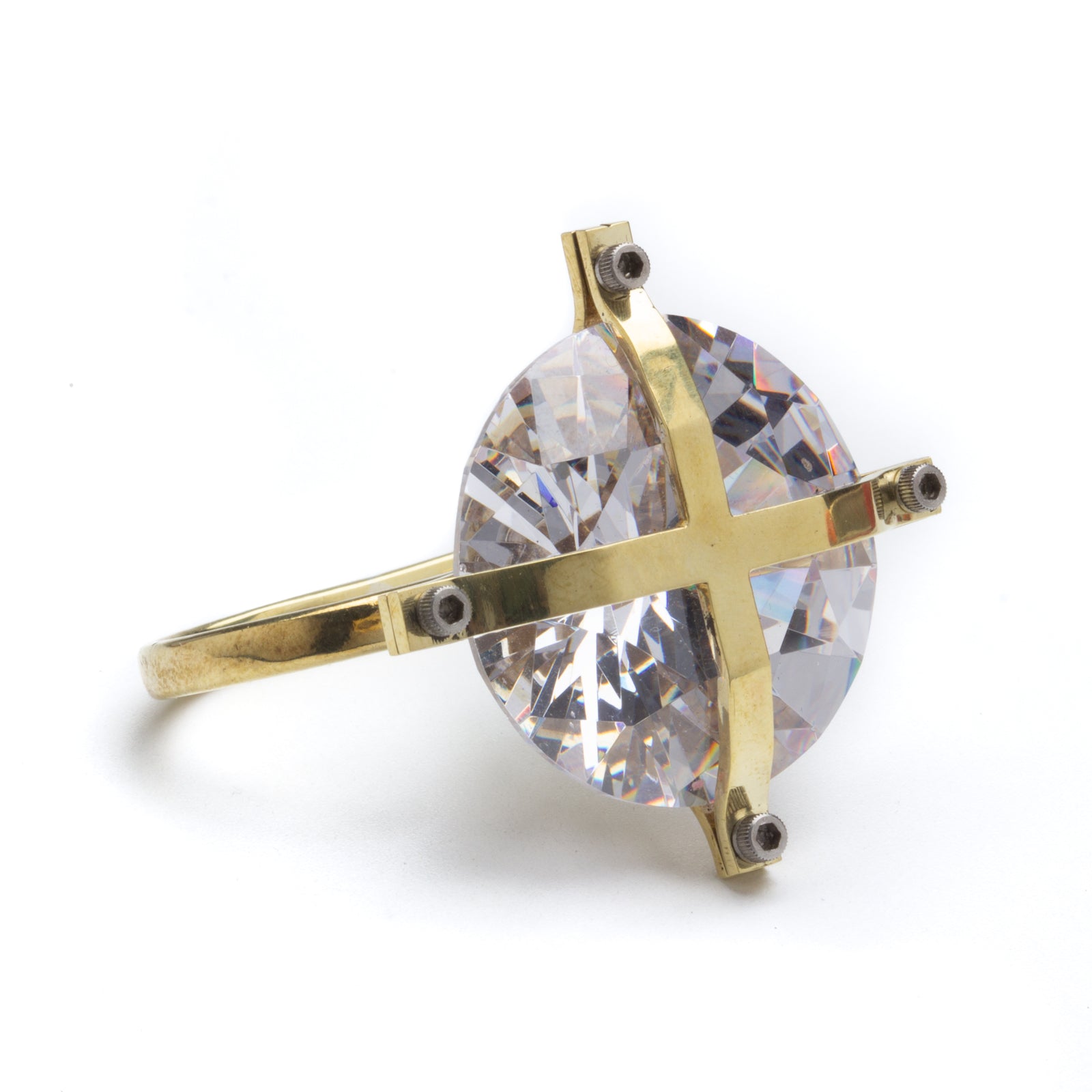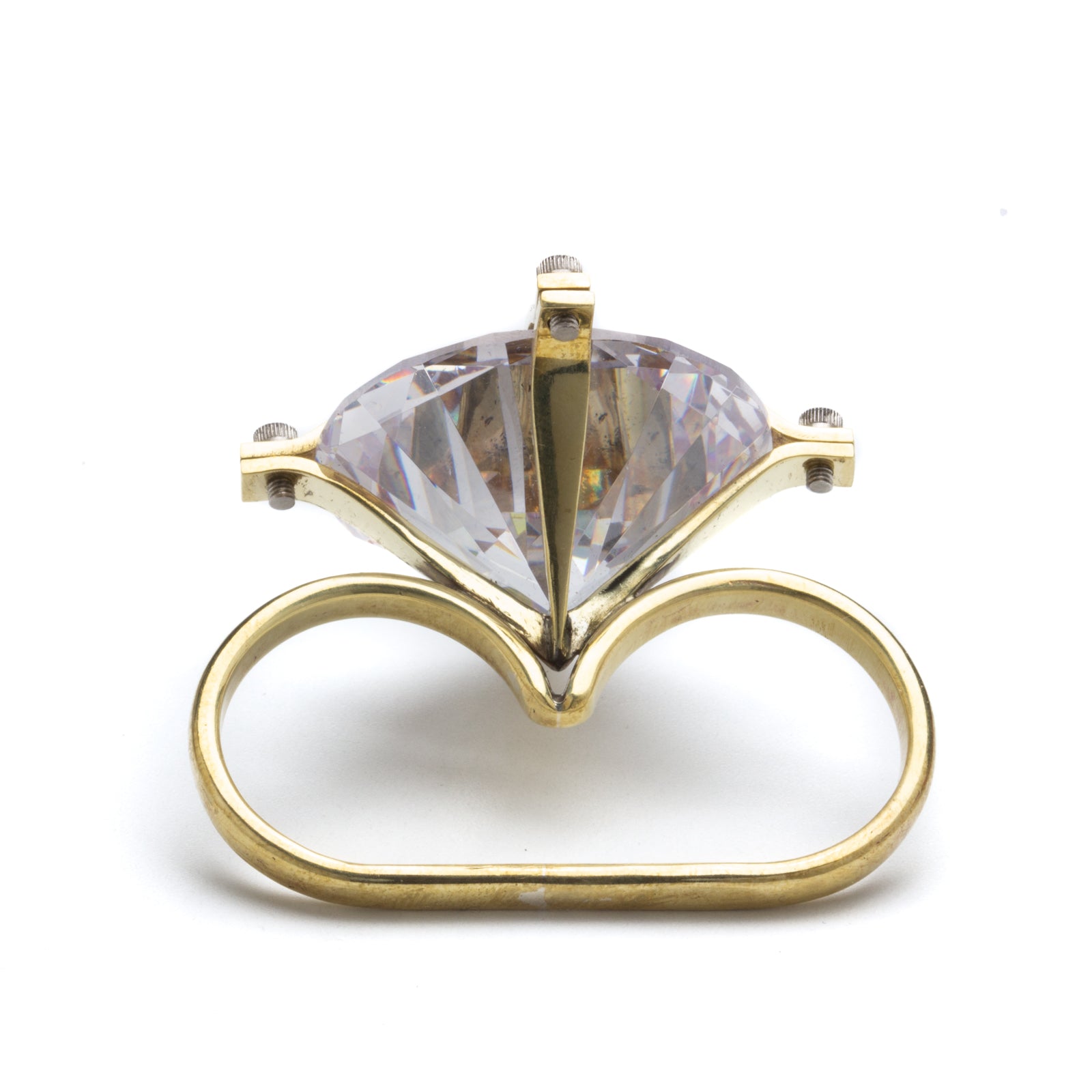 Artist Statement: This ring focuses on the enormous size of the cubic zirconia and how we perceive value within our society. It is two finger ring constructed with brass and steel.
