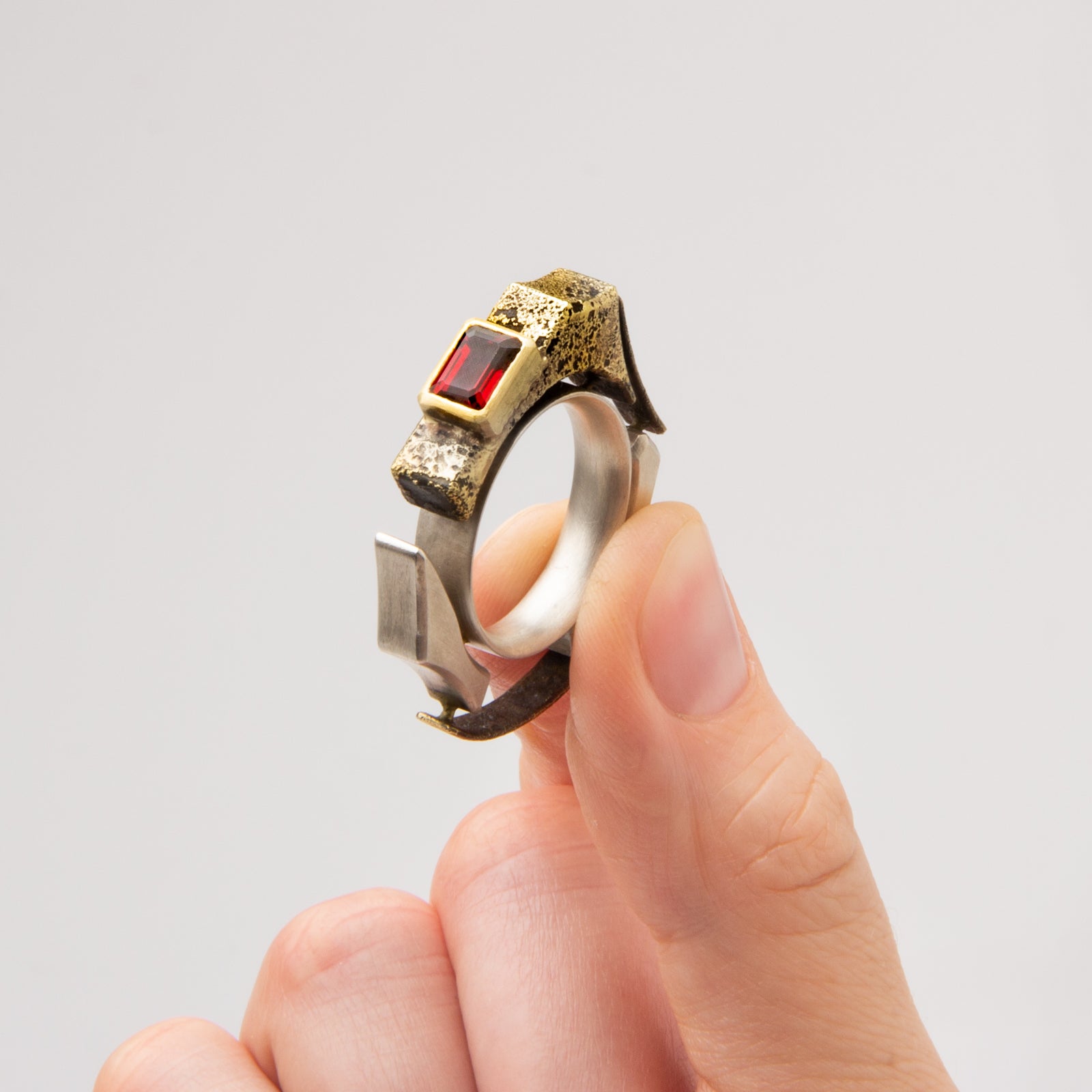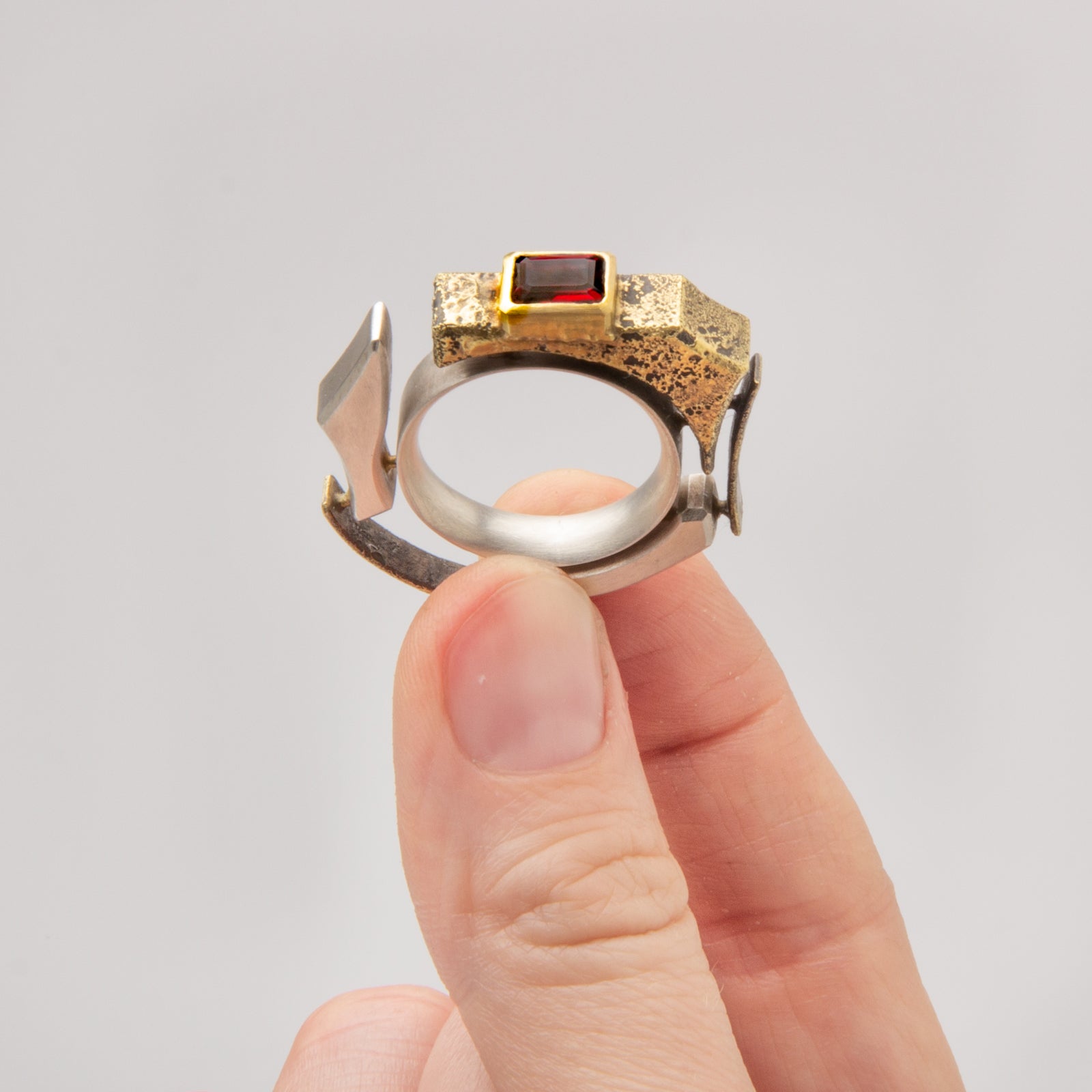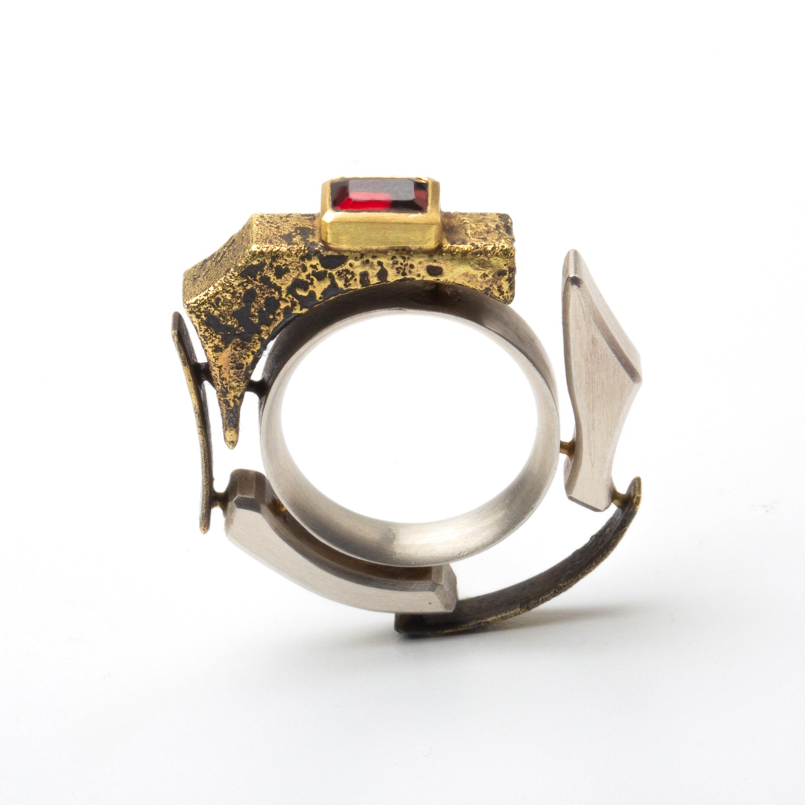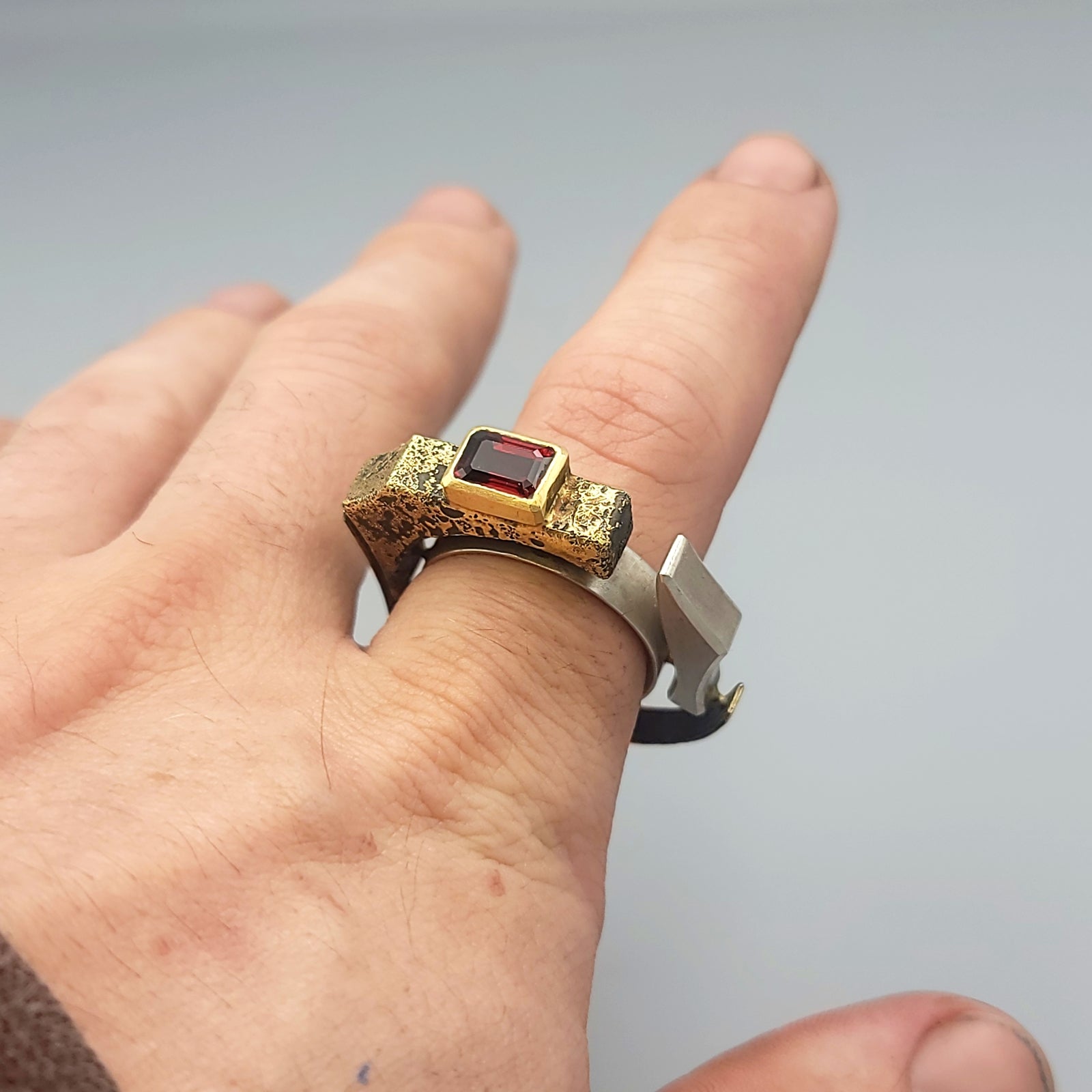 Artist Statement: This statement ring is constructed from nearly 100% recycled materials. While the steel is not explicitly recycled, it is a highly recycled material in general. The other materials including the 18k gold solder are all 100% recycled and sourced from Stuller. It combines forged and filed steel components with 18k gold fused to the surfaces and hand shaped sterling silver forms. Atop the ring sits an AA quality Mozambique garnet in a hand made 18k gold bezel. The negative space, implied line, and combination of organic motion and fused metal alongside strong geometry and forms creates a ring full of interest, motion, and a presence full of untold history.