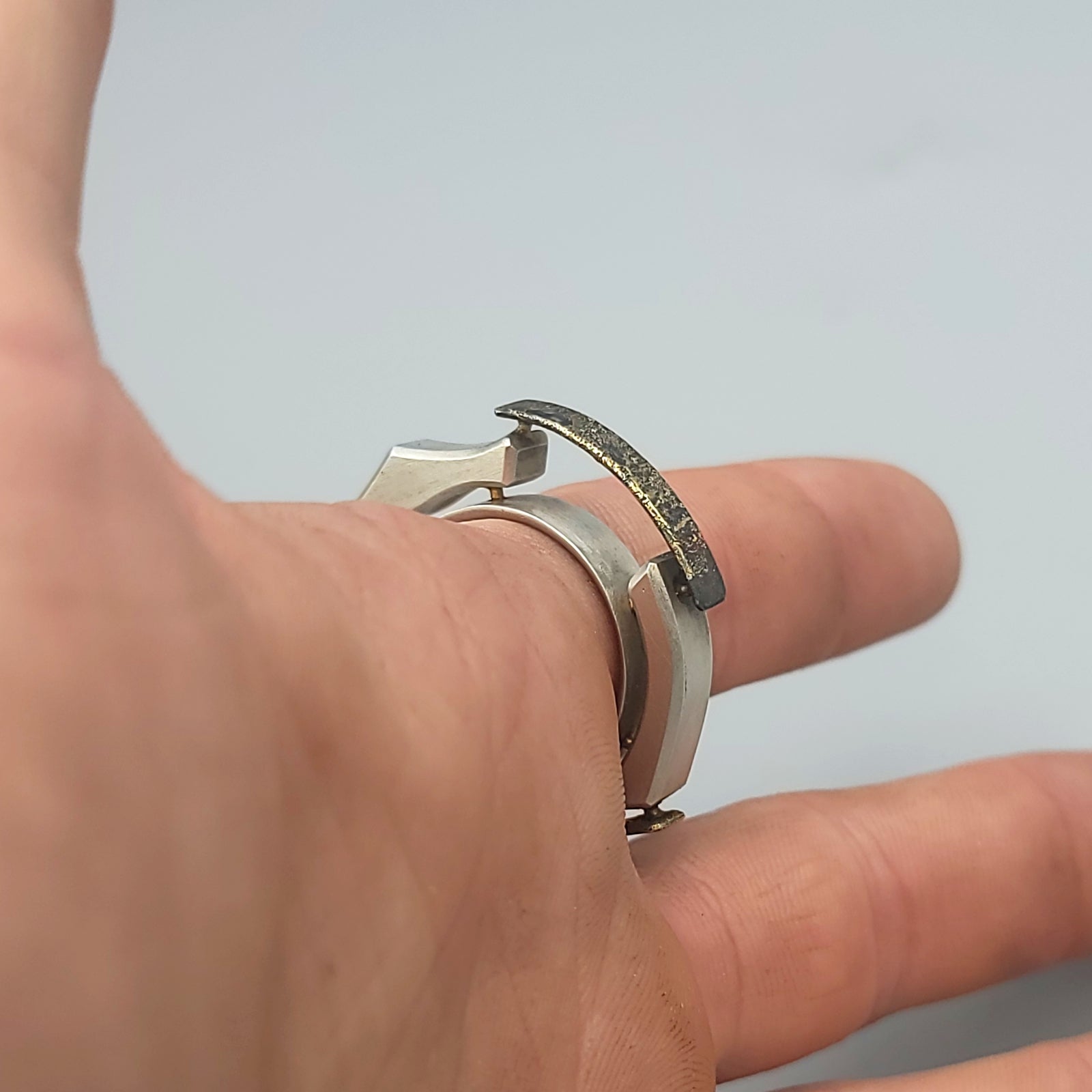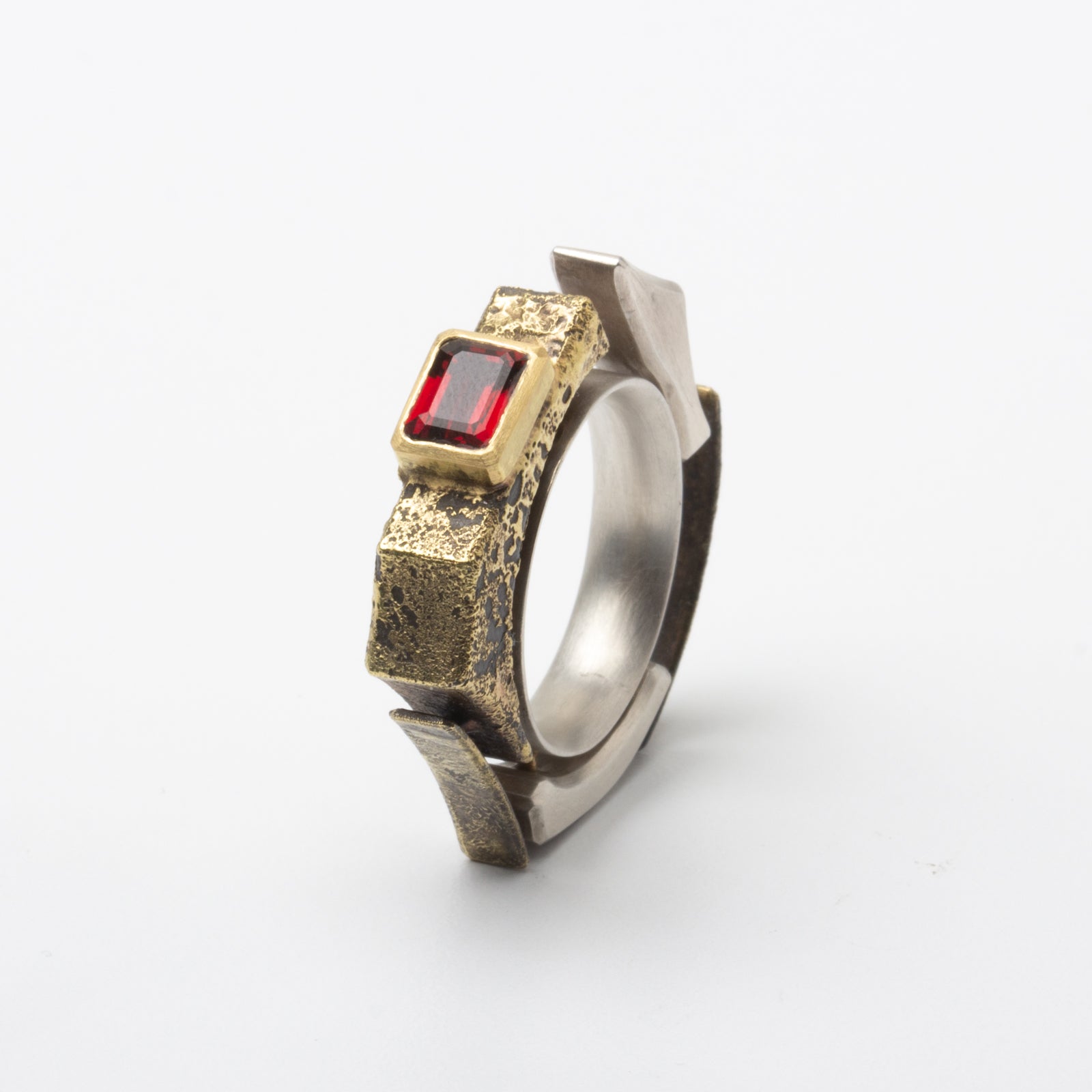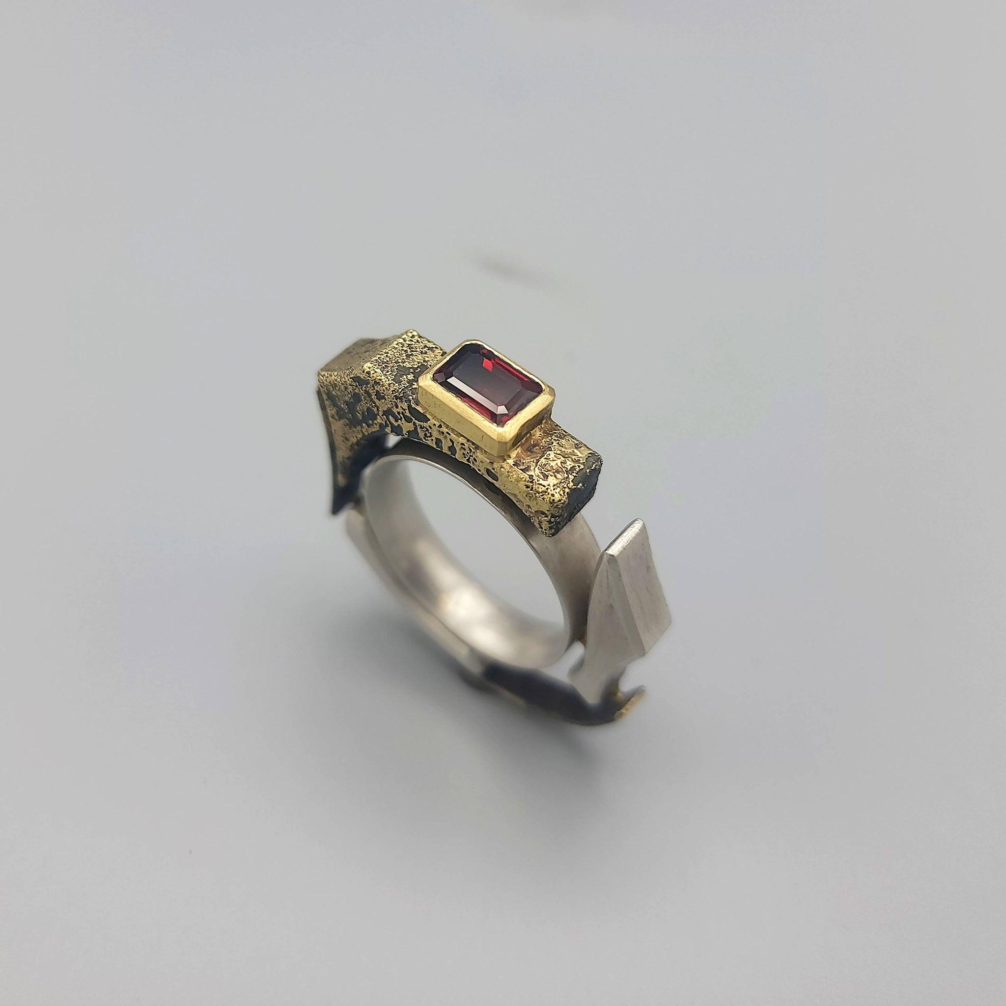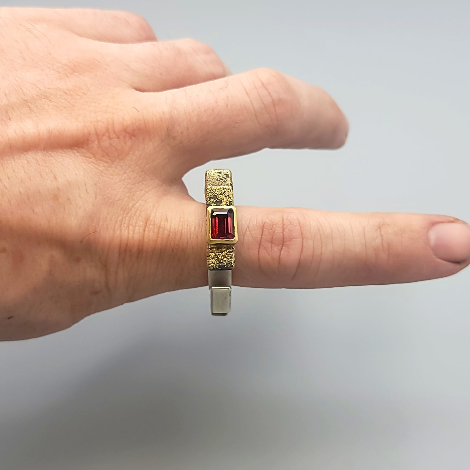 Artist Statement: This statement ring is constructed from nearly 100% recycled materials. While the steel is not explicitly recycled, it is a highly recycled material in general. The other materials including the 18k gold solder are all 100% recycled and sourced from Stuller. It combines forged and filed steel components with 18k gold fused to the surfaces and hand shaped sterling silver forms. Atop the ring sits an AA quality Mozambique garnet in a hand made 18k gold bezel. The negative space, implied line, and combination of organic motion and fused metal alongside strong geometry and forms creates a ring full of interest, motion, and a presence full of untold history.