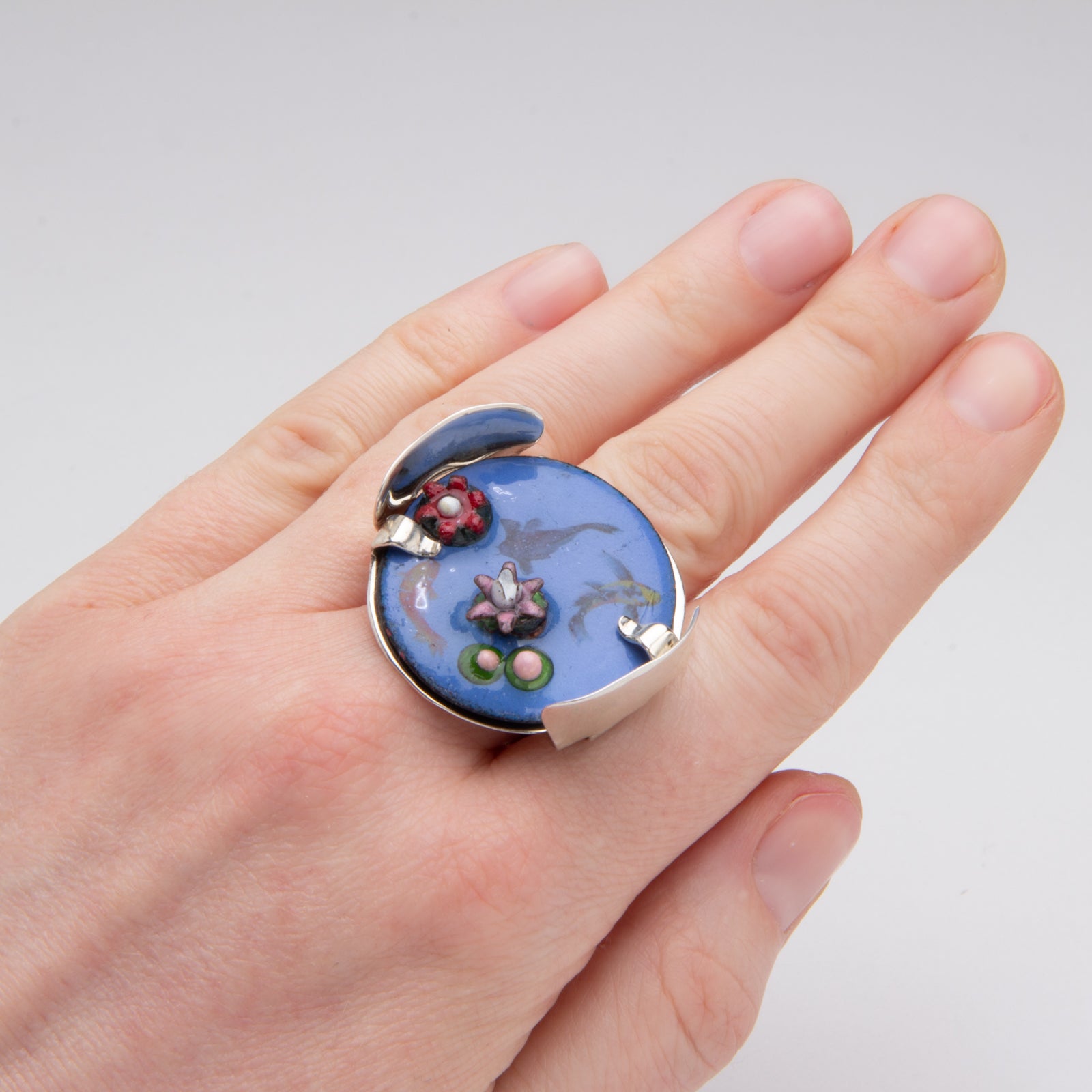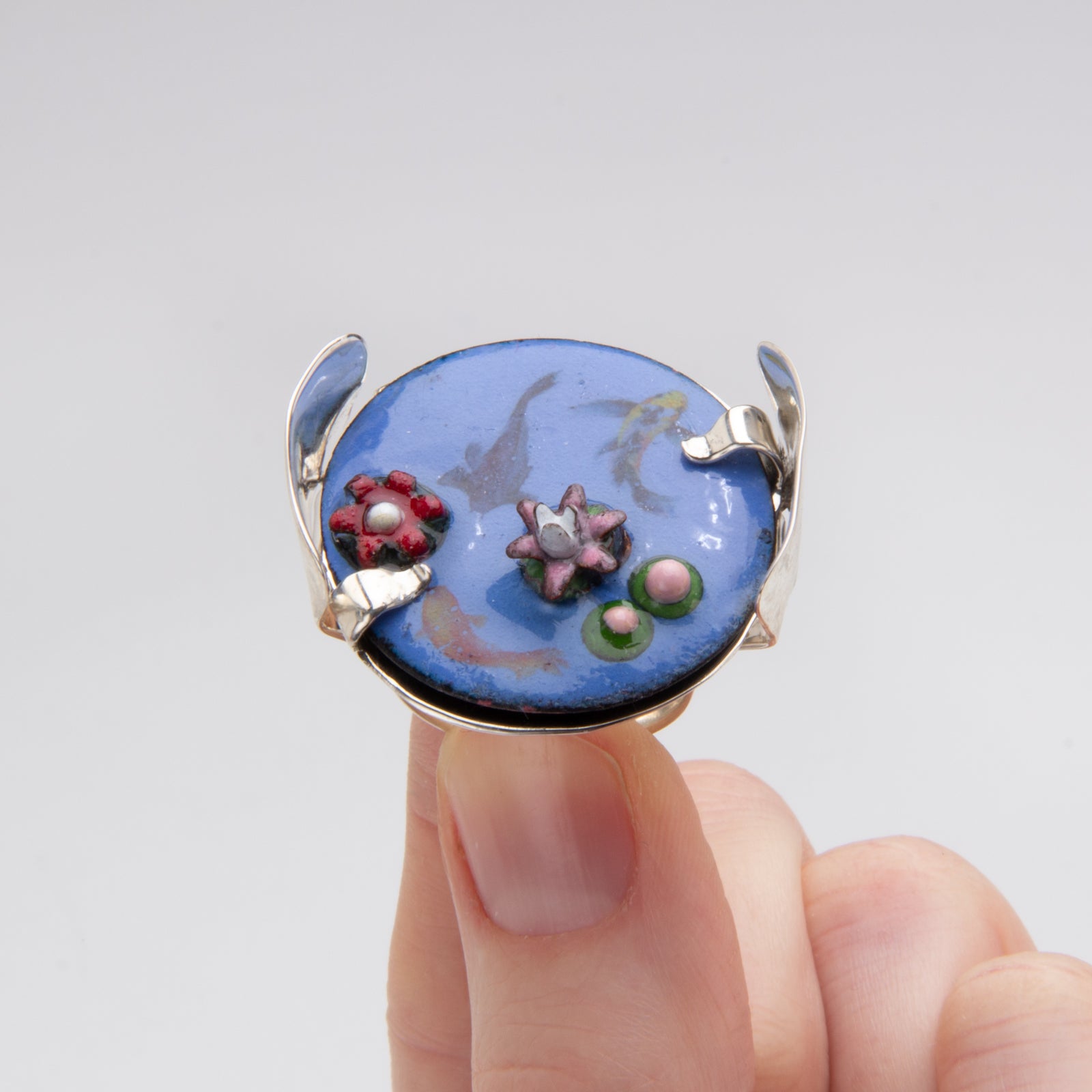 Artist Statement: I relax into the calm, reflective waters of a koi pond. Tiny, 3-D, colorful, enameled water lilies float peacefully on an enameled pond. Wise, ancient koi glide gracefully just under the surface. Have a little moment of serenity at your finger (tips). Ring is light-weight. The enamel is powdered glass that has been melted and fused to metal. It is susceptible to cracking or breaking as any glass would be and should be worn gently. The sterling band reaches past the height of the water lilies to provide some protection, but please understand the ring is fragile and not for everyday wear.