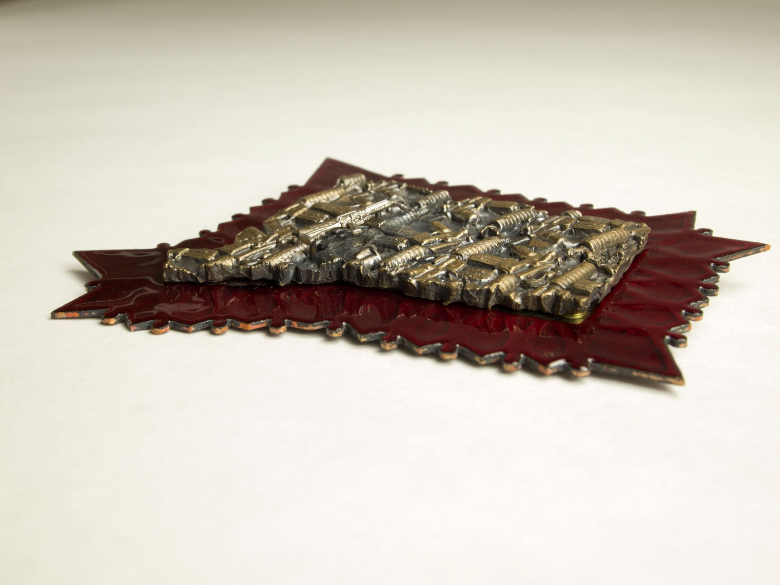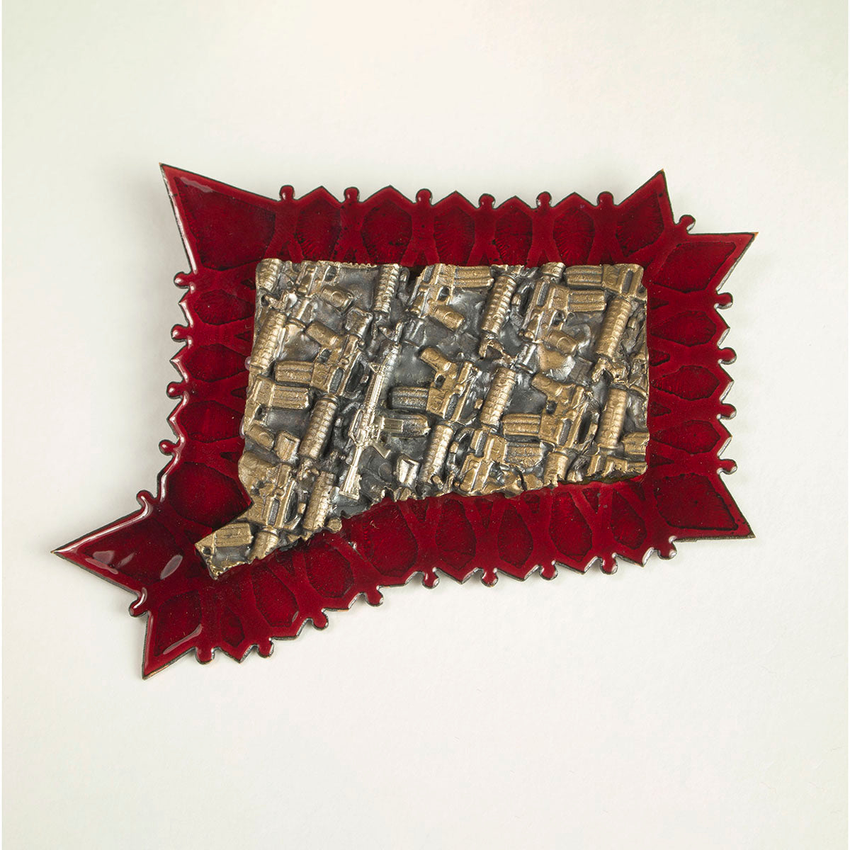 Artist Statement: A brooch that analyzes gun control in the Unites States, specifically surrounding the Sandy Hook Elementary School tragedy. The piece depicts the Connecticut landscape made of AR15 rifles, the rifle used in the tragedy, recast in bronze from plastic Lego AR15 rifles. The landscape is surrounded by the 26 hand-holding victims designed as paper-cut people, then enameled. A Sterling AR15 is placed over the area of Newtown where the tragedy occurred. Artist proceeds will be donated to Sandy Hook Community Foundation.