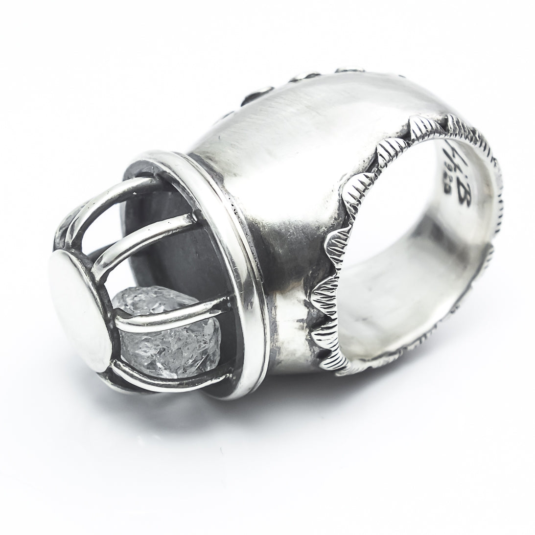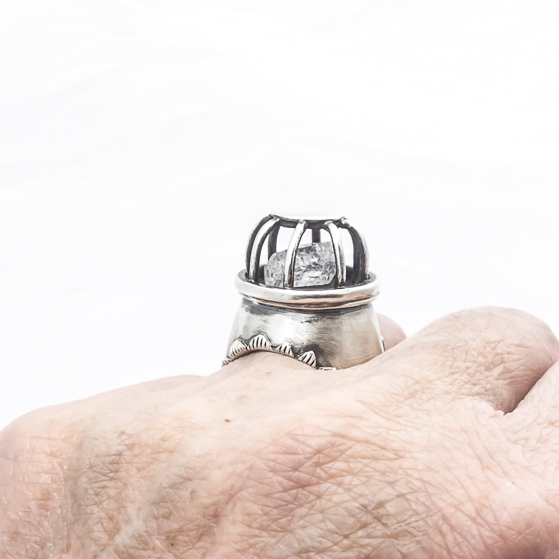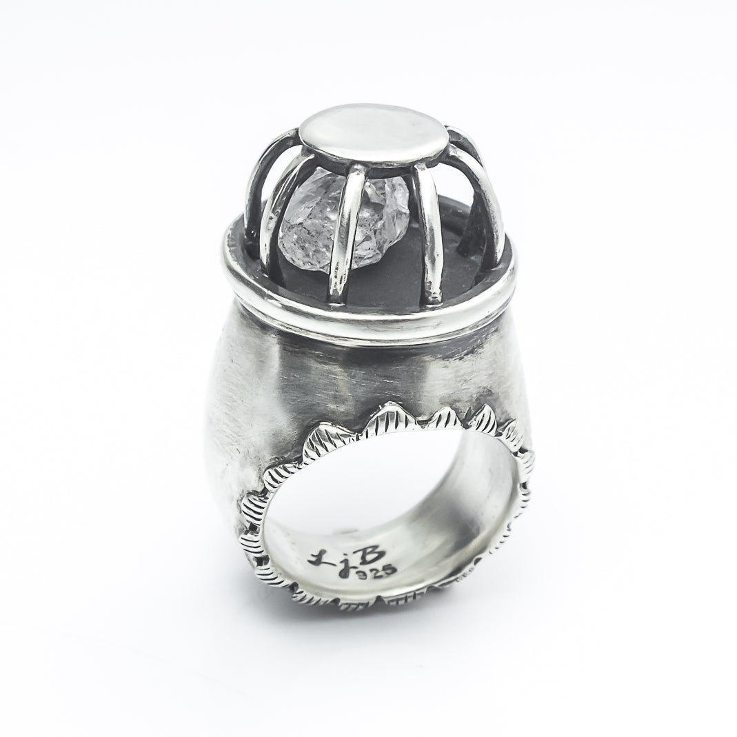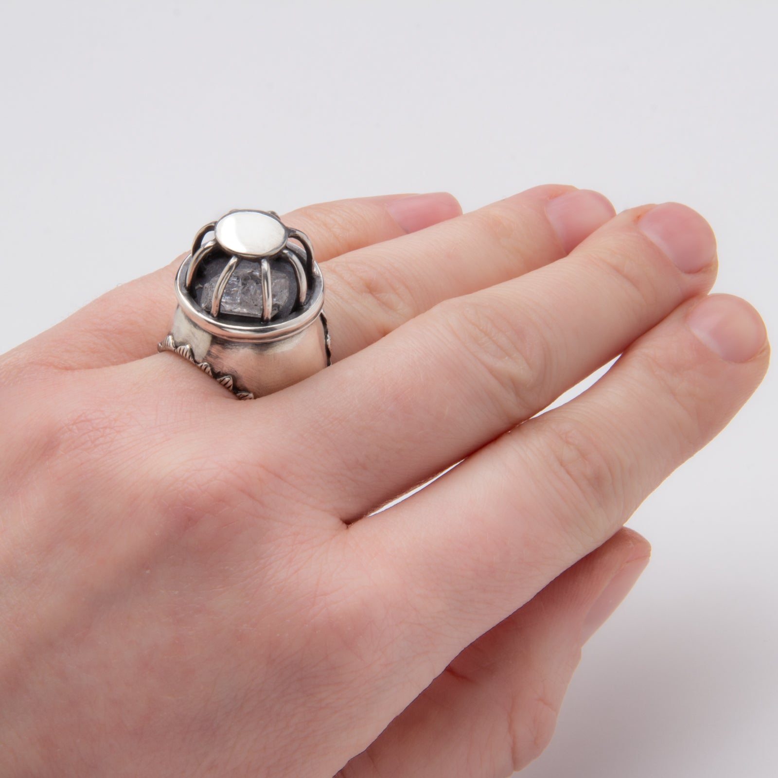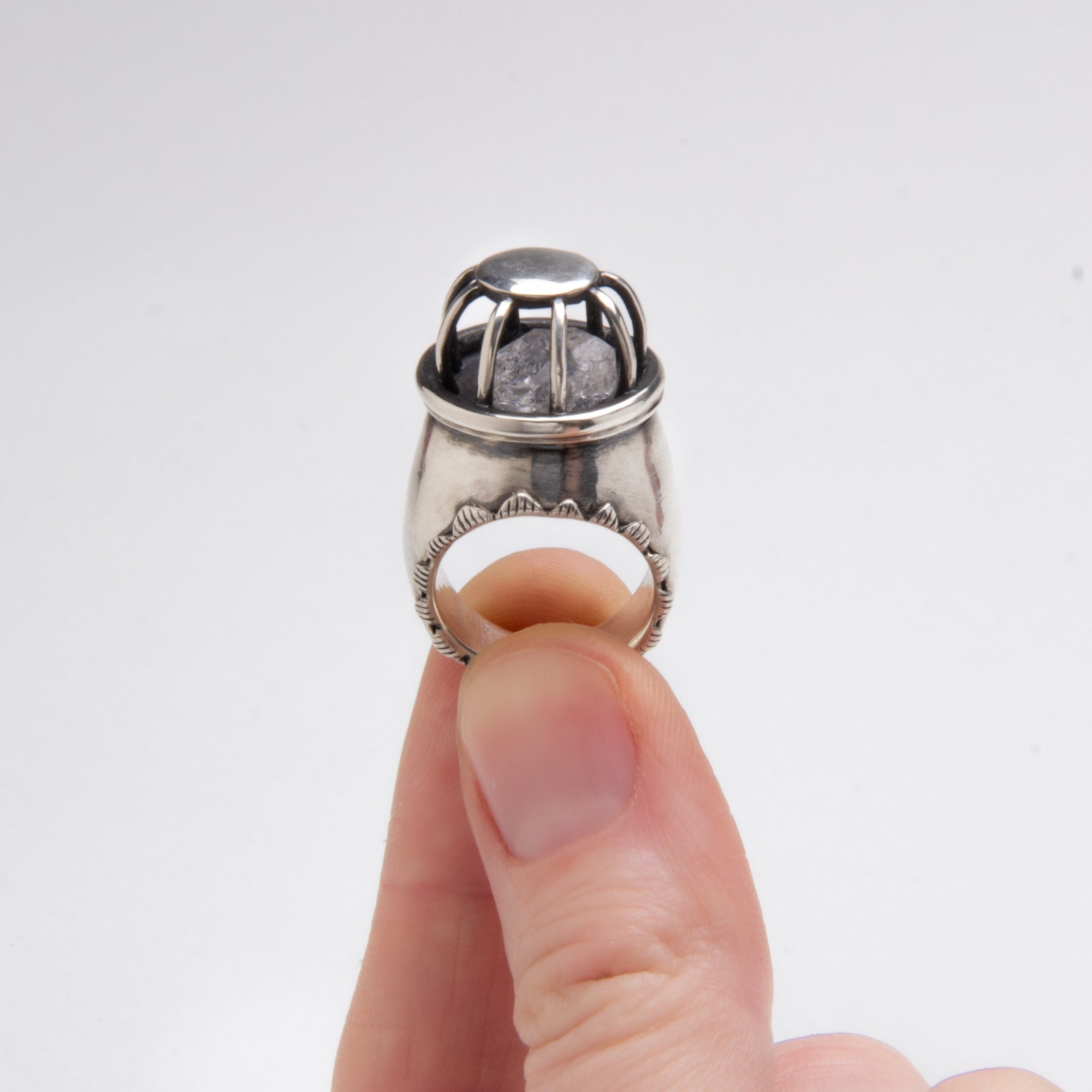 Artist Statement: Every time I create a new jewelry piece it is more about challenging myself and learning a new fabrication skill. Rarely, there is a deep meaning behind the design. However, looking at my finished cage ring I realized this is probably how we all have felt at some point in these past pandemic years.