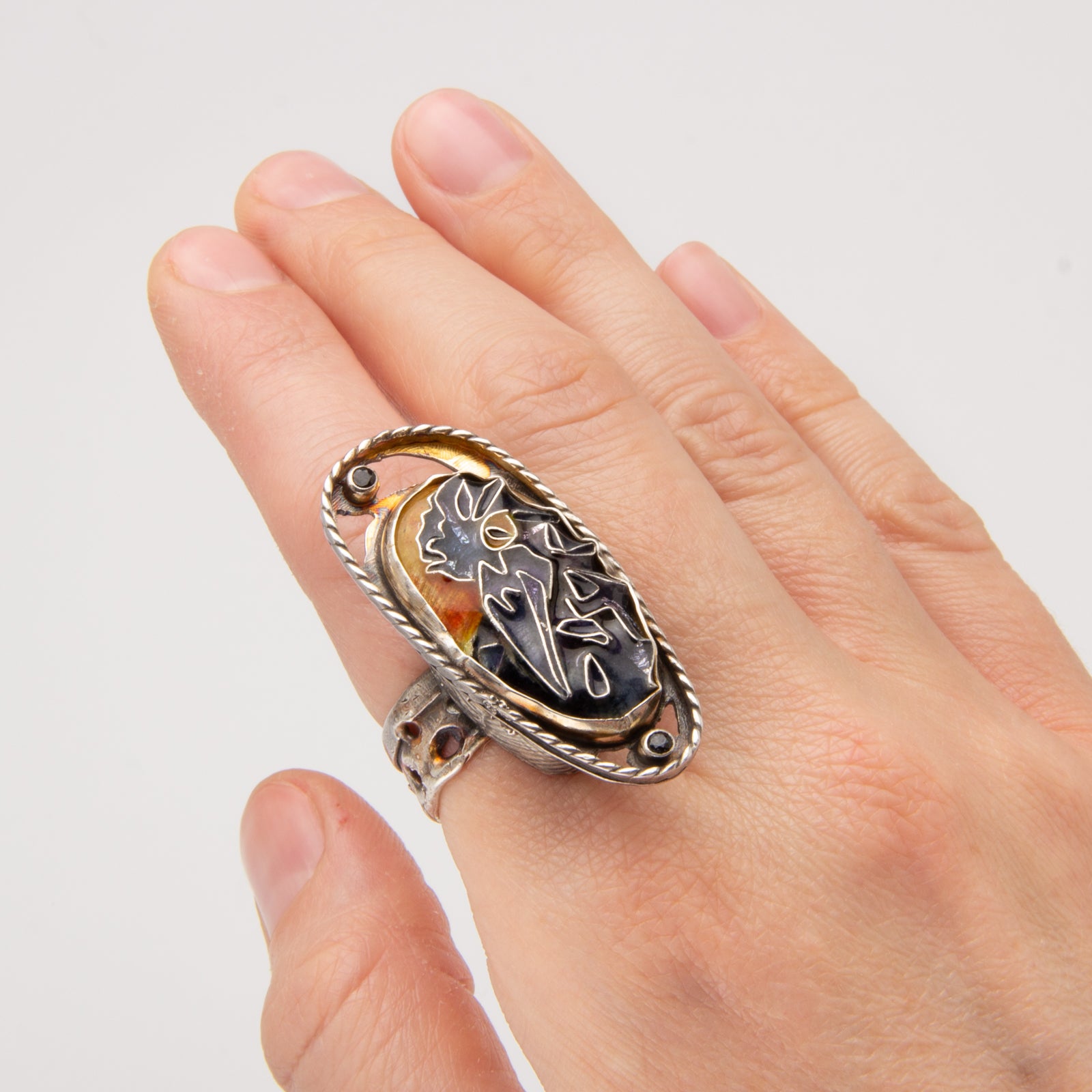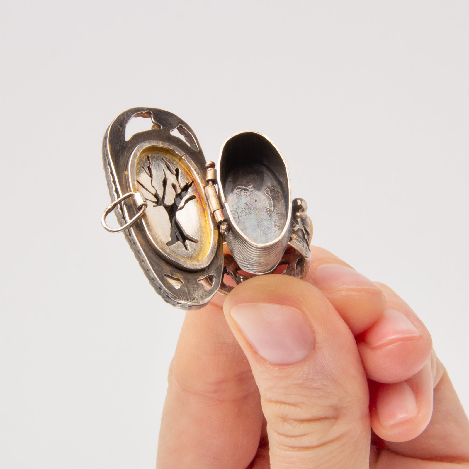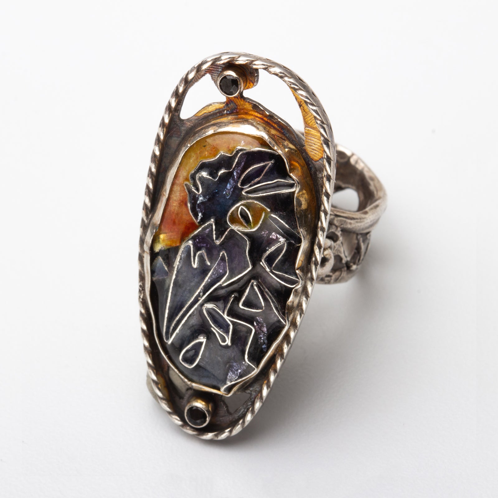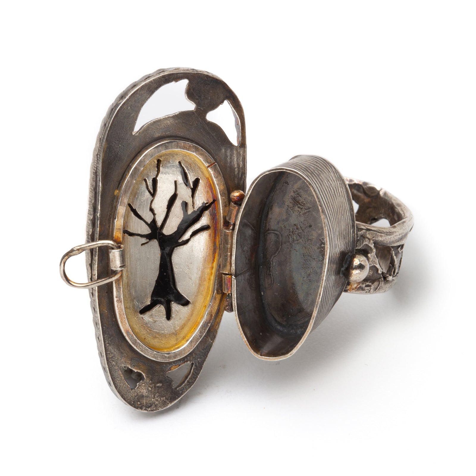 Artist Statement: One of a kind poison ring with Cloisonné Raven on the front. Black spinel accent stones set in sterling silver, with cut outs and frame. The inside of the poison ring has a cut out showing a tree. It latches securely.