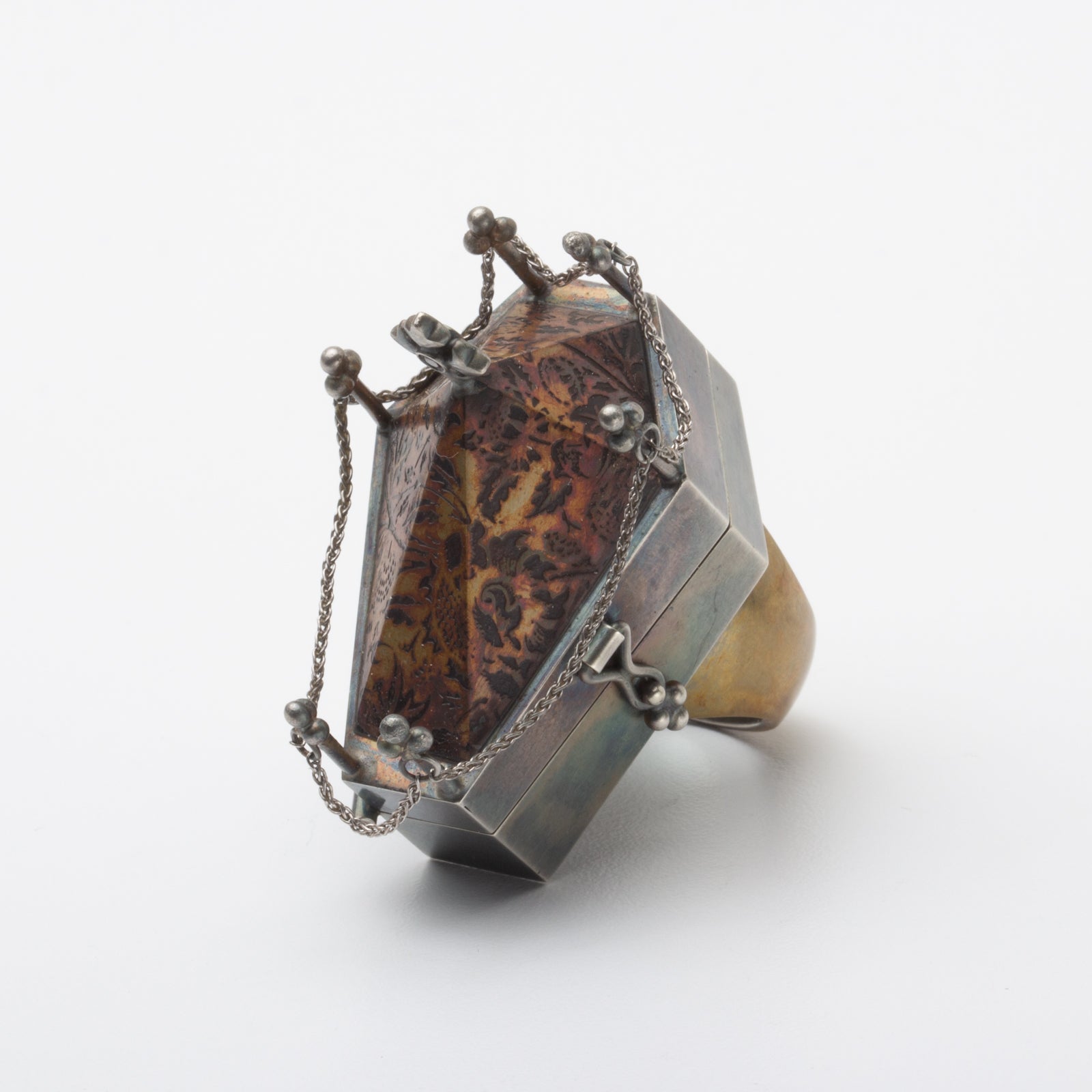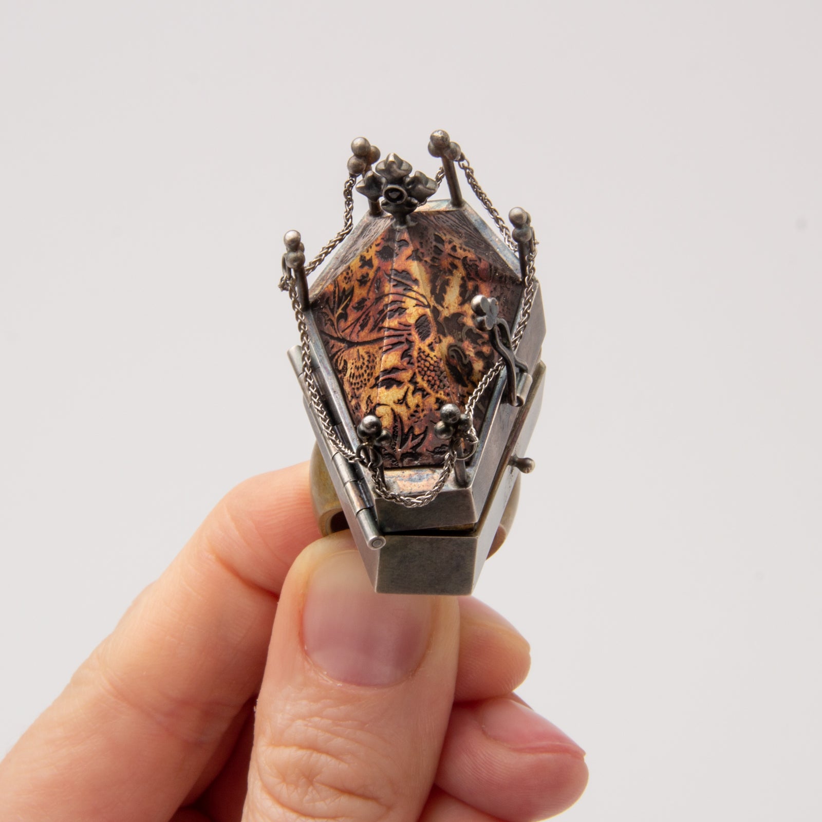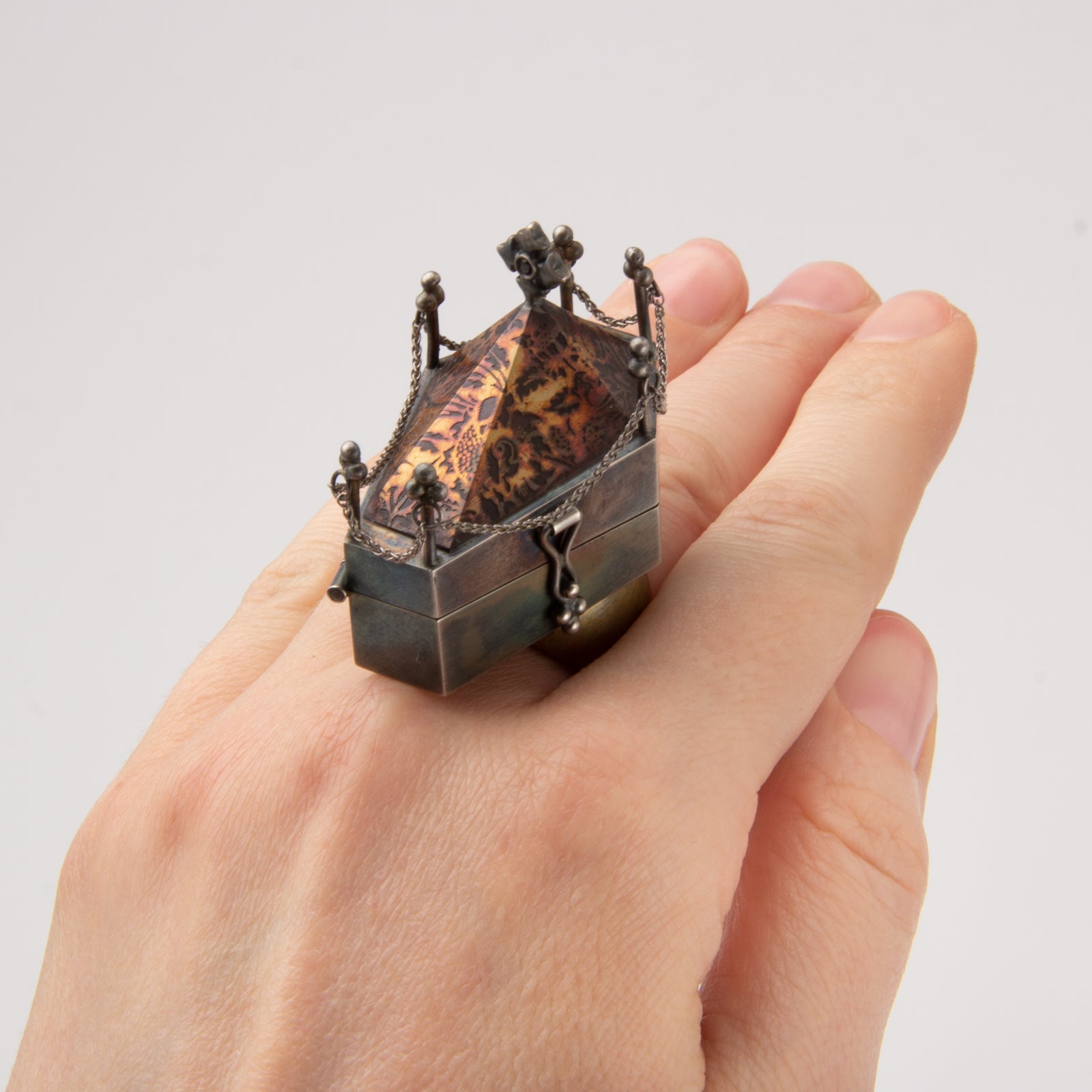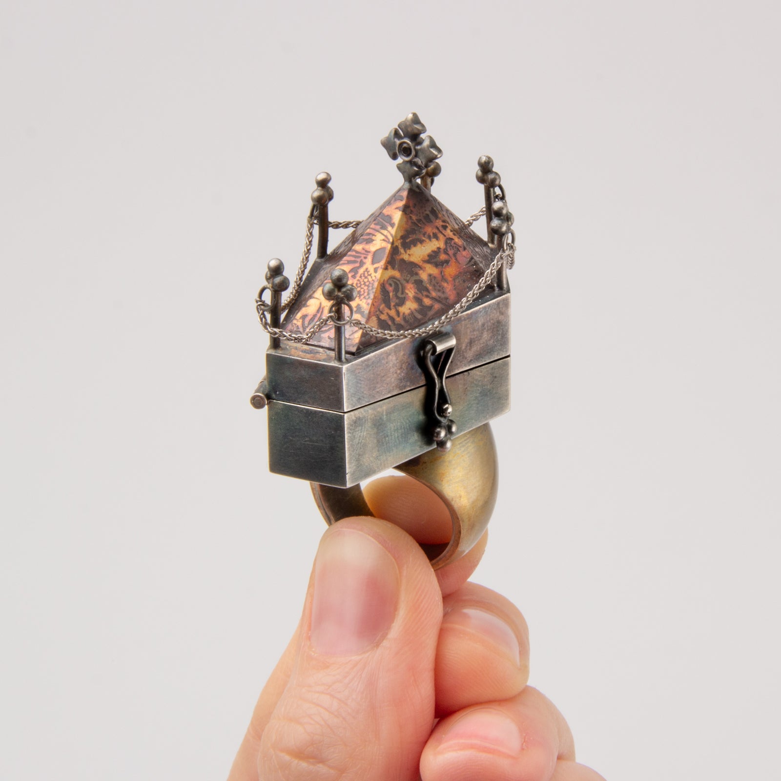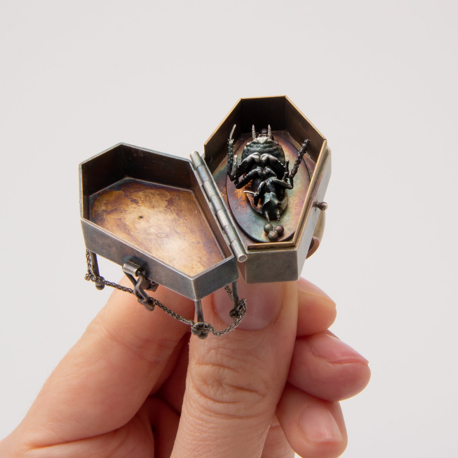 Artist Statement: This "coffin study" takes the form of a ring, and hosts a once living cockroach within its tomb. The original insect was found dead within the halls of the building I teach at. In preparation for casting, I dipped the insect in shellac, invested the model, and proceeded with the lost wax casting process. Once the cockroach was prepared and casted into solid sterling silver, I could begin building the ring around the object. The entire ring is formed and fabricated from bronze and sterling silver sheet with functional 7 knuckles hinge and catch. The roof of the coffin was etched using ferric chloride acid.