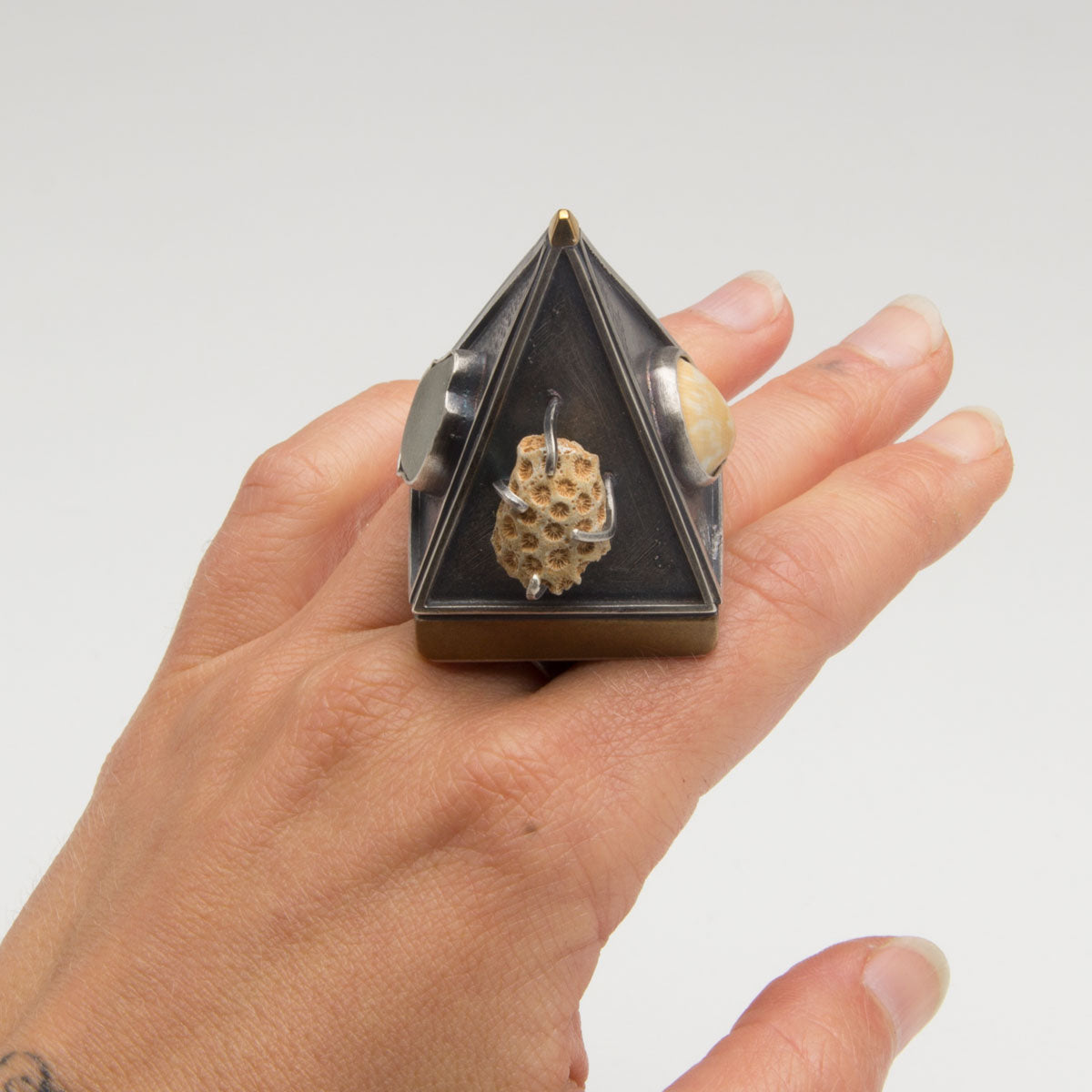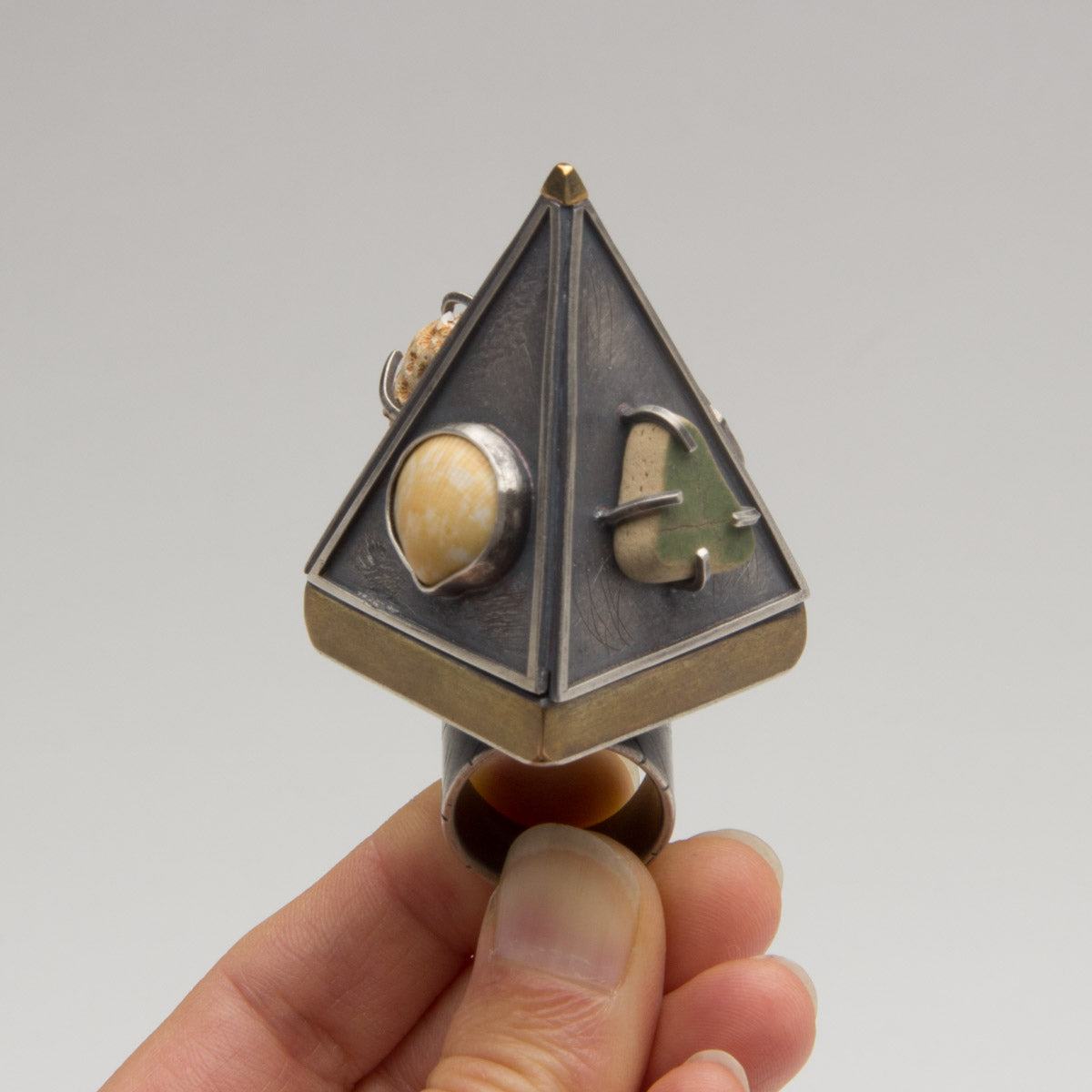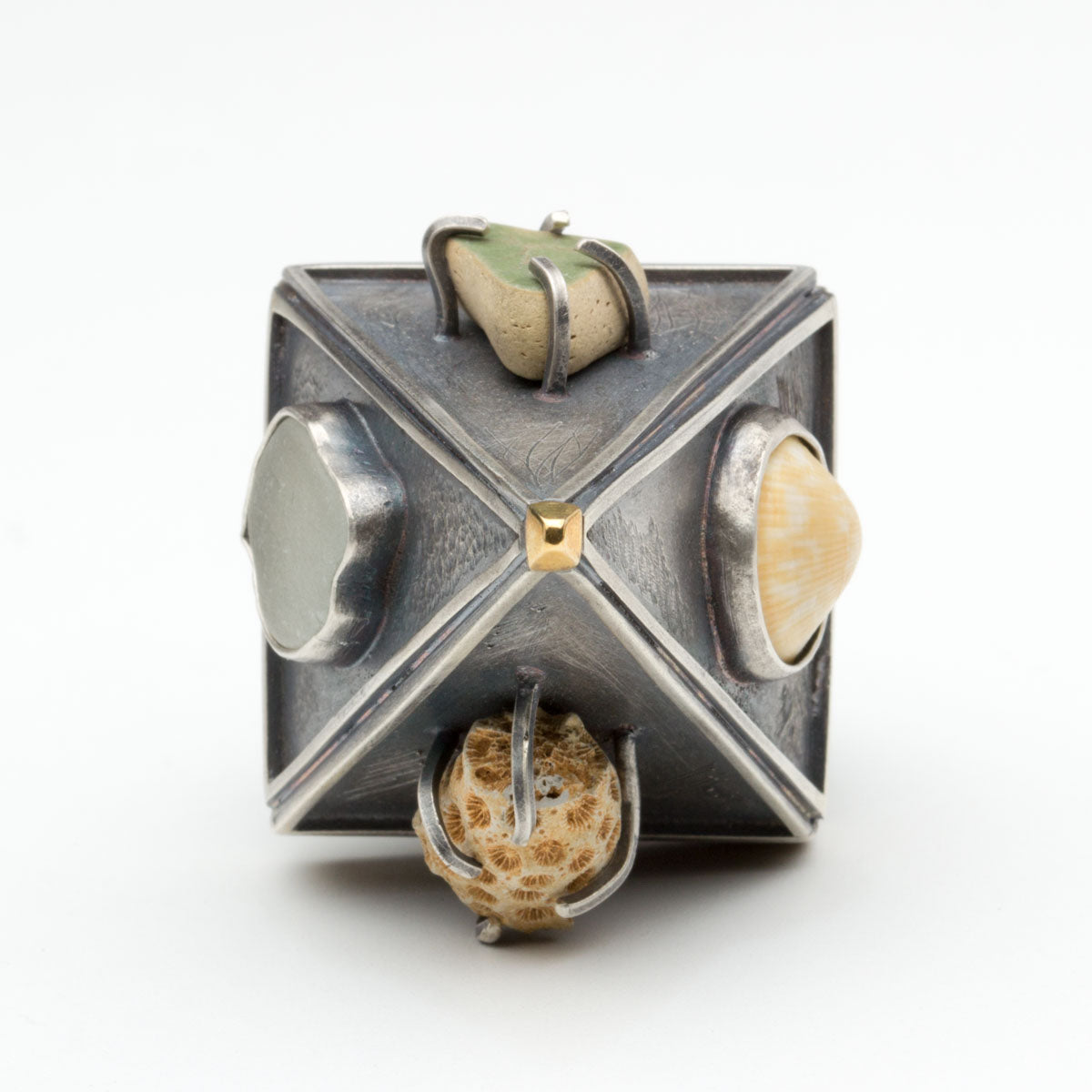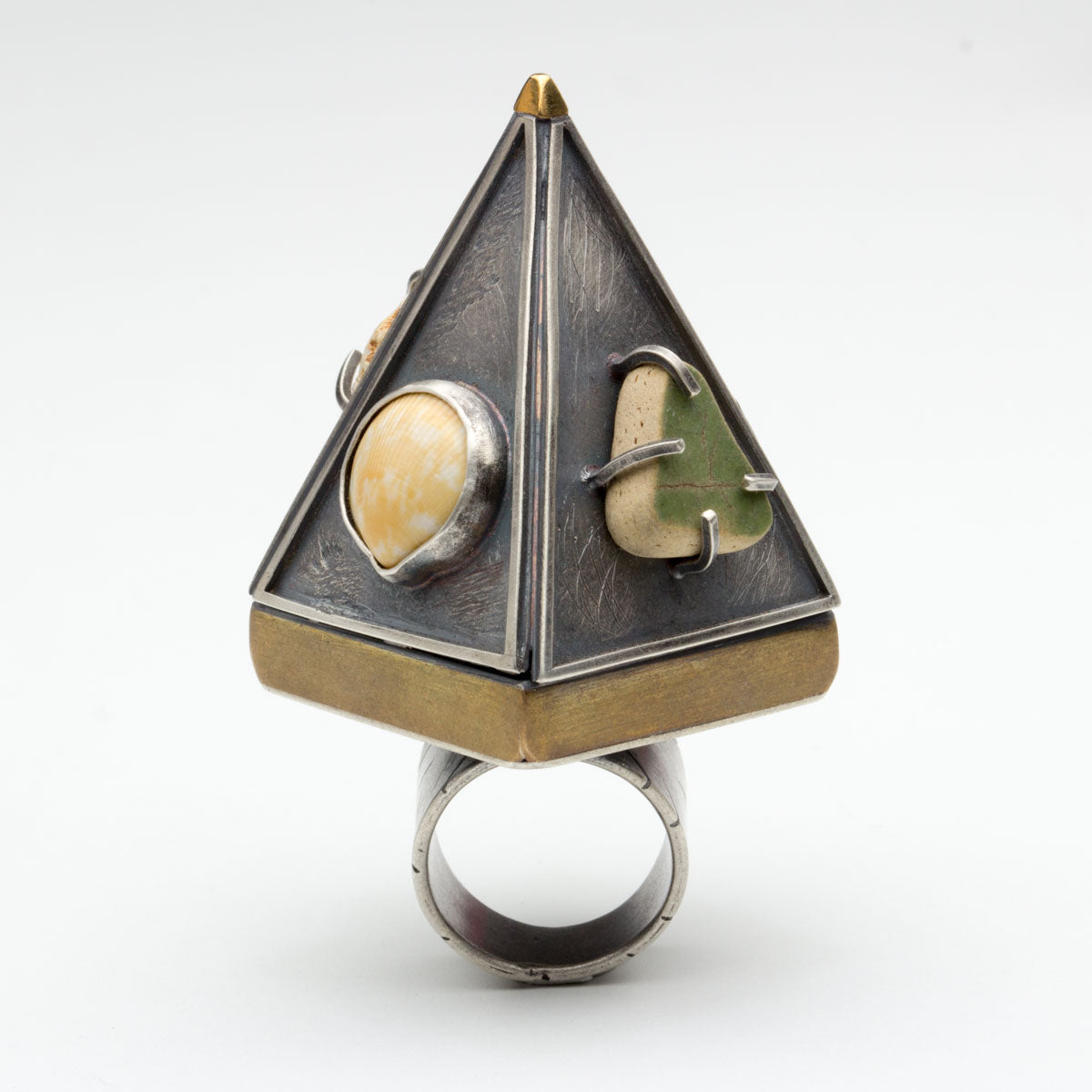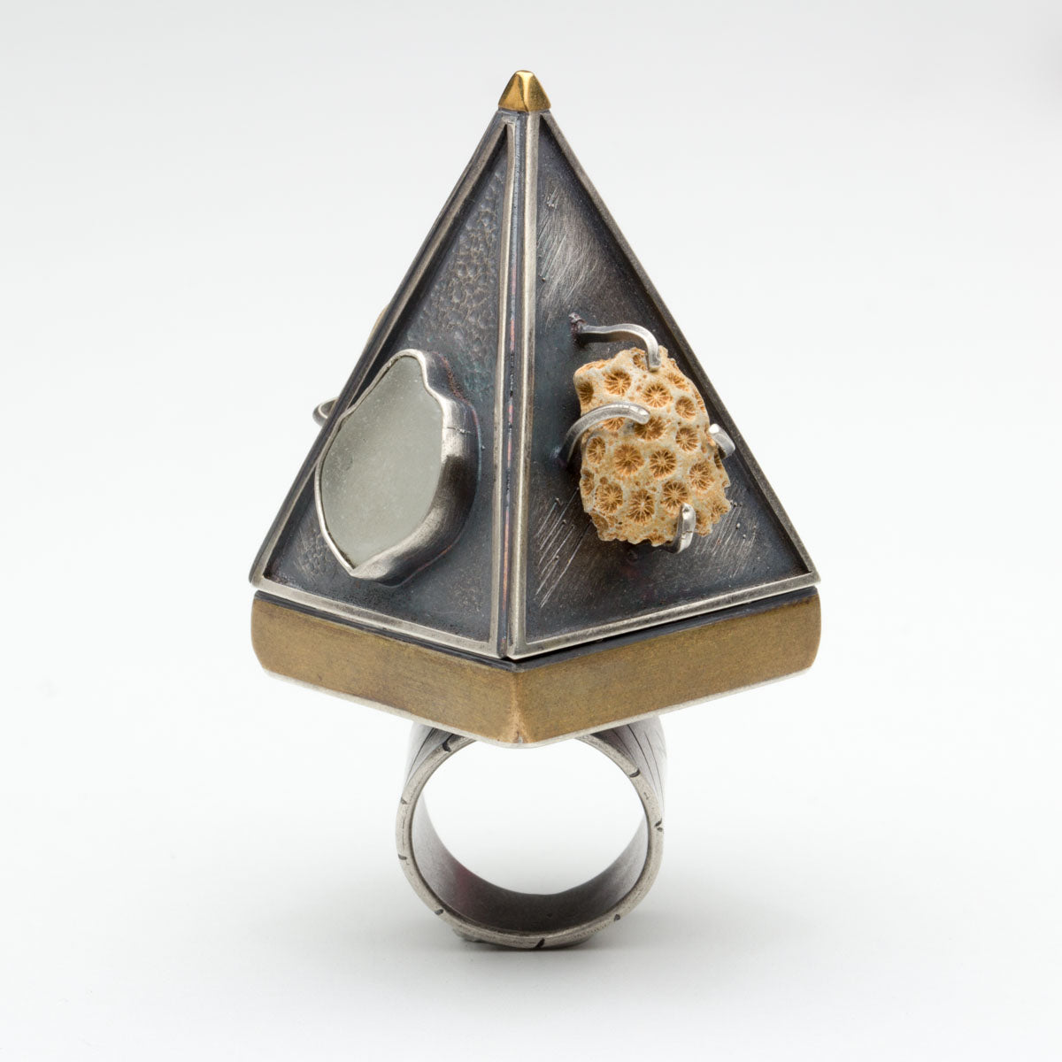 The Mermaid Armor ring was created for this challenge as an exercise to push myself to create up. I have been incorporating found objects in my more experimental work lately, especially shells, sea glass,rocks and wood. Some say this ring was washed ashore from an ancient civilization deep beneath the ocean…
