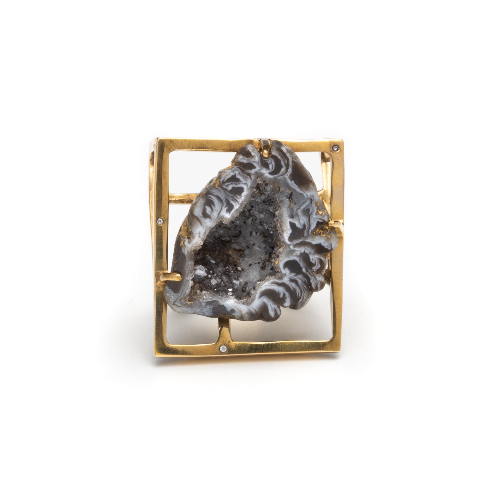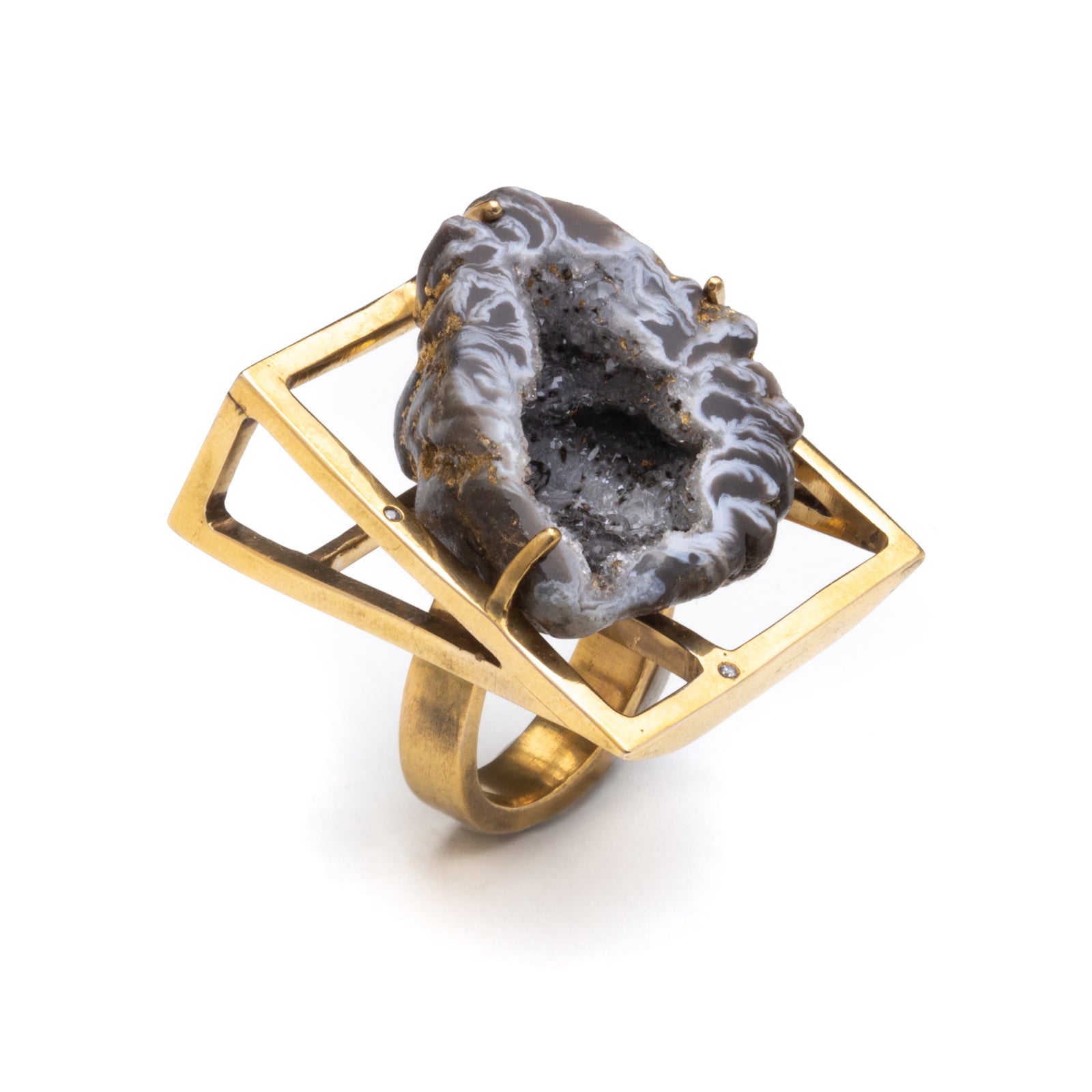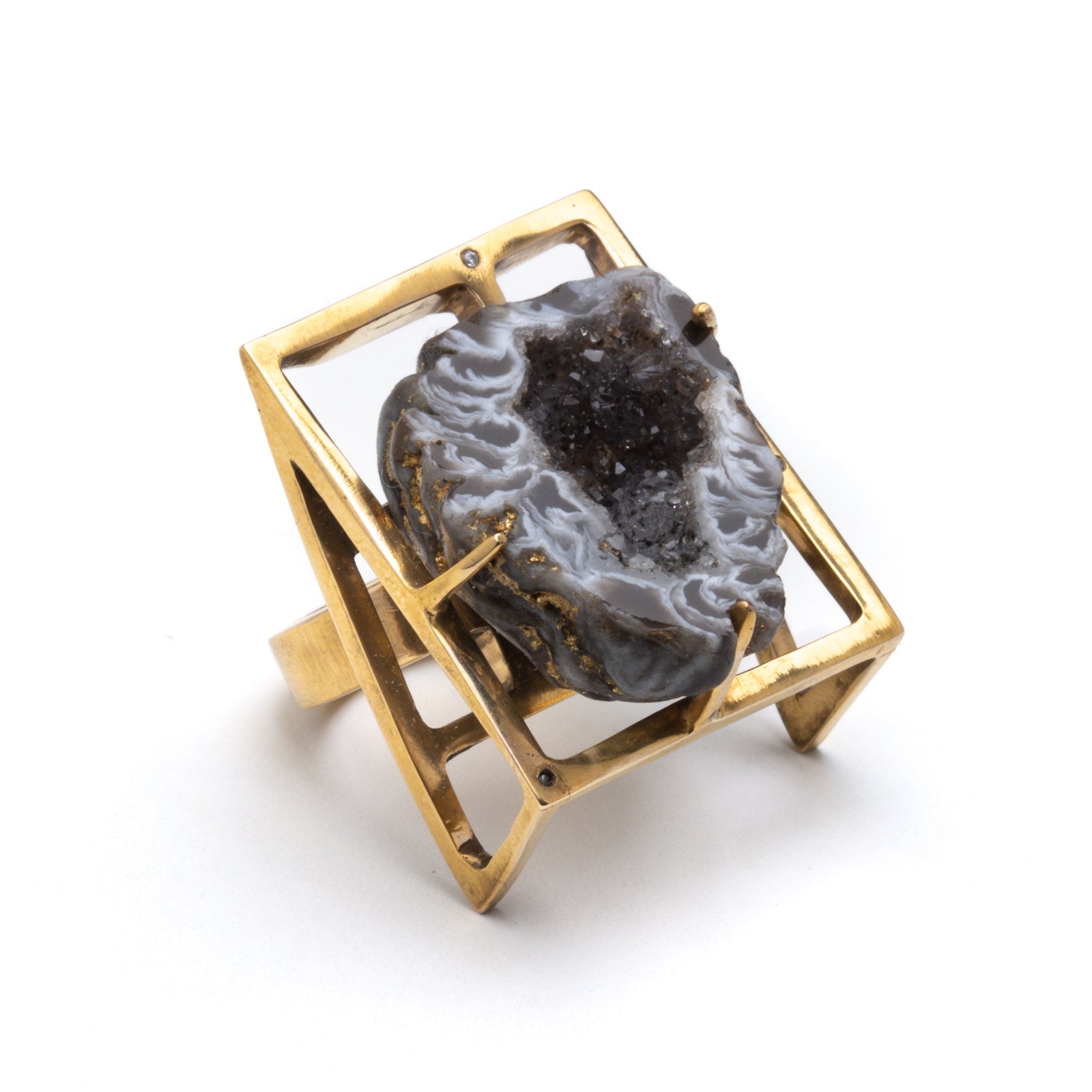 Artist Statement: The Framing Nature is one of the pieces I made as part of my Crystal Cage Collection. A beautiful acate crystal is caged in gold plated brass with three, 1mm zirkonia gemstones. This piece is minimal yet exciting in a contemporary approach to a statement ring. It embodies nature captured in time and framed as the art it is by geometric forms inspired by architecture.