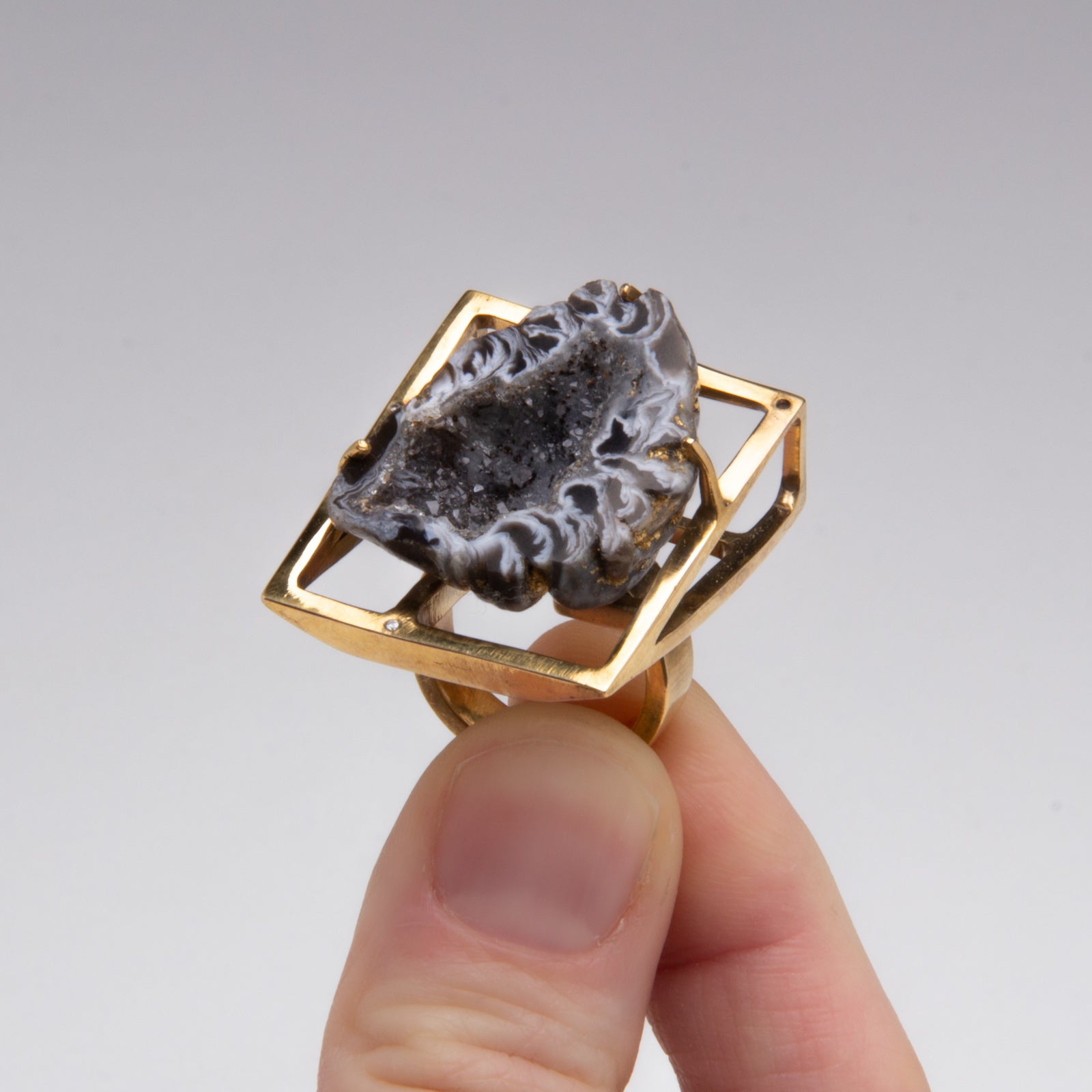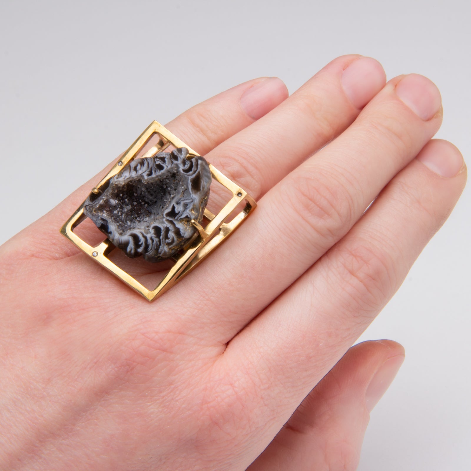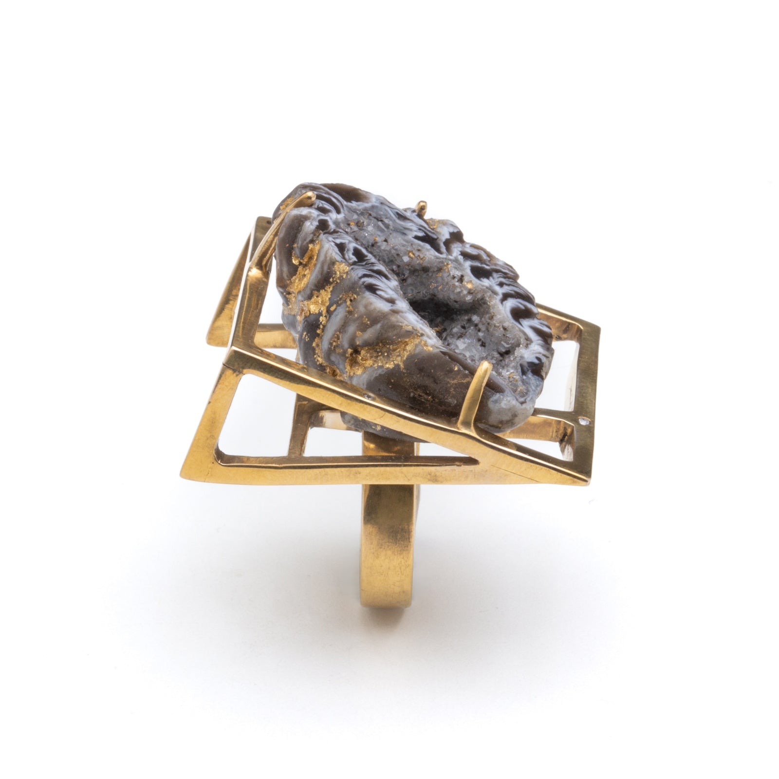 Artist Statement: The Framing Nature is one of the pieces I made as part of my Crystal Cage Collection. A beautiful acate crystal is caged in gold plated brass with three, 1mm zirkonia gemstones. This piece is minimal yet exciting in a contemporary approach to a statement ring. It embodies nature captured in time and framed as the art it is by geometric forms inspired by architecture.
