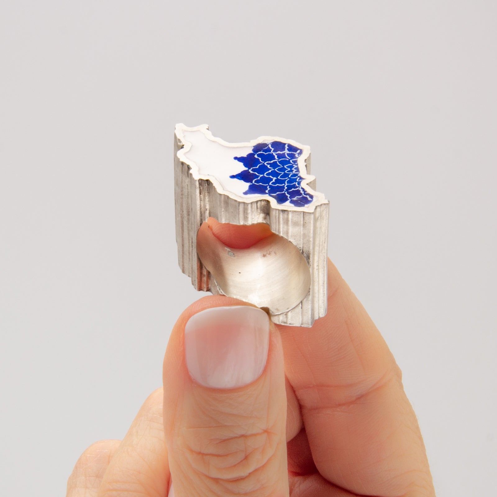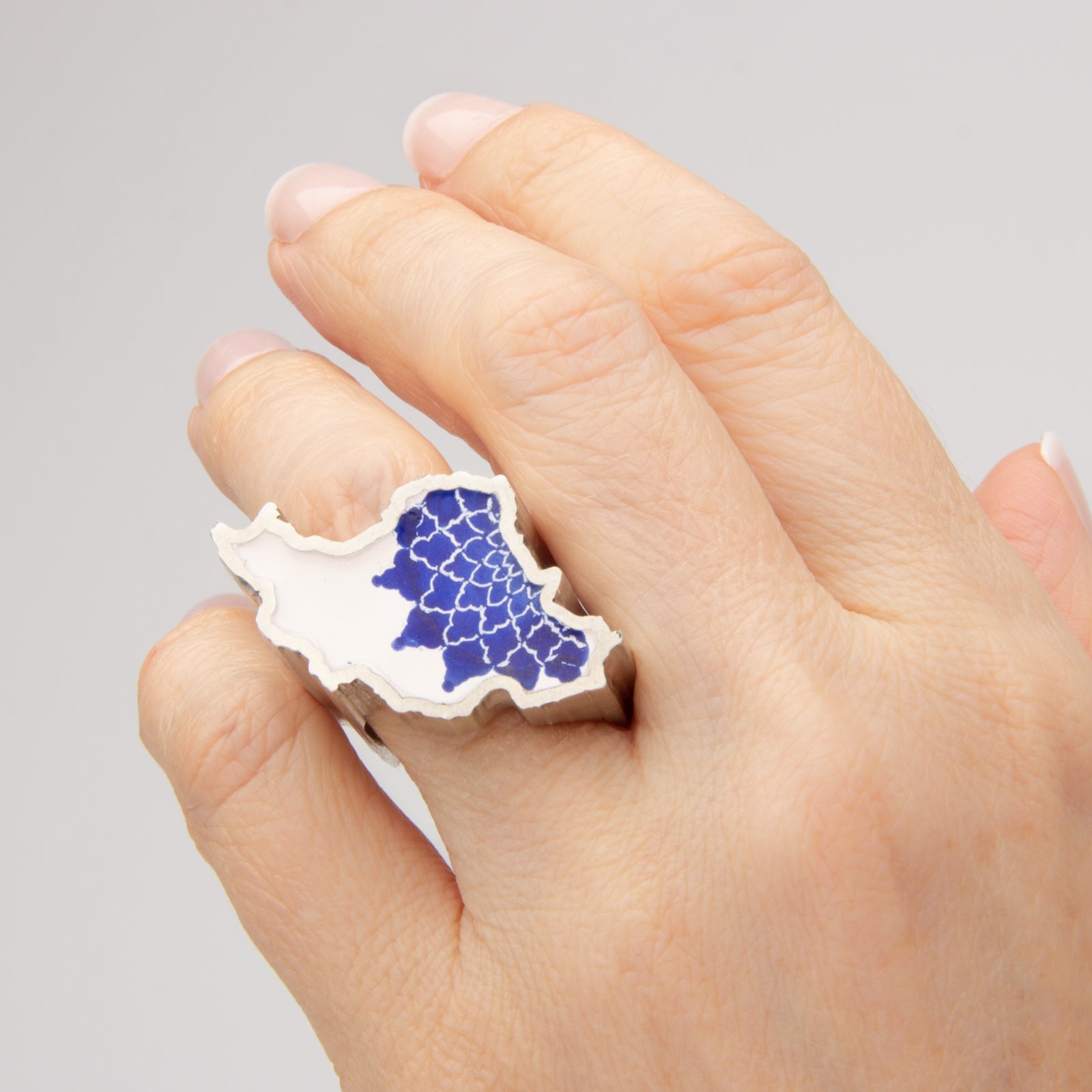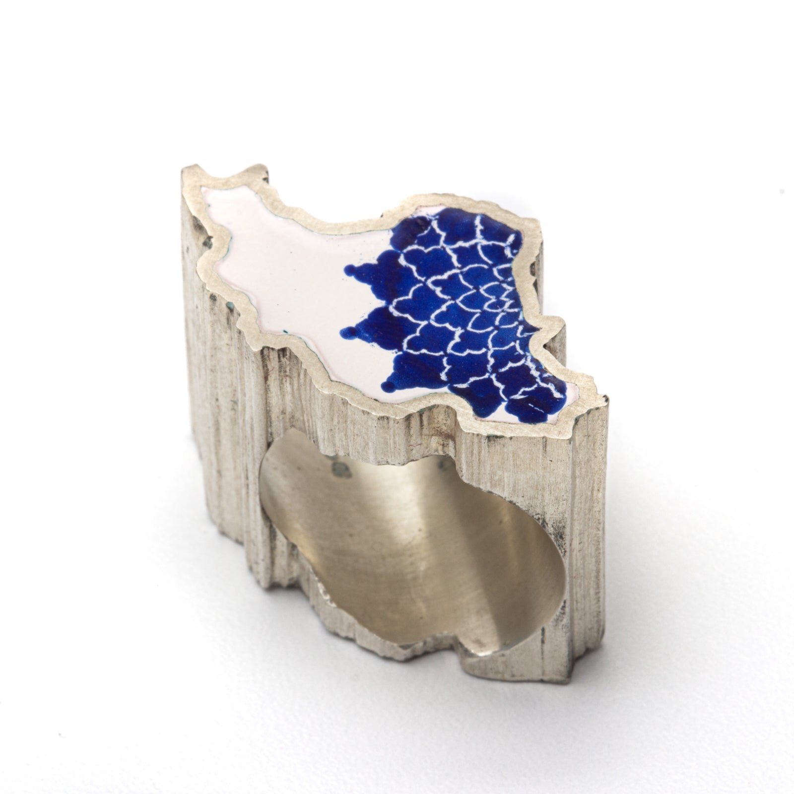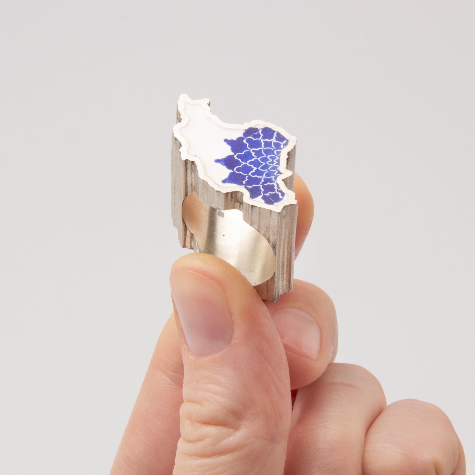 Artist Statement: I have immigrated 5 years ago and although it seems not so long for many, it is becoming intolerable for me to be away from my friends and family. Since September 2022, with the ongoing revolution in my home country, Iran, I felt an enormous longing for my homeland and my compatriots. I have created this ring in shape of Iran map and have architectural pattern design in enamel to remind me of my people and soothe the ache a little bit.