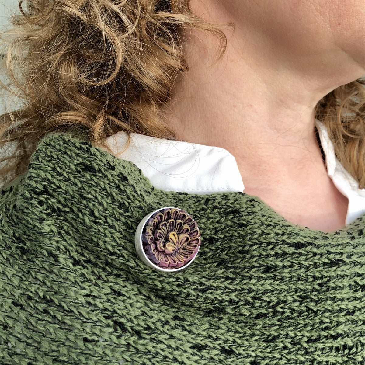 Artist Statement: The Japanese material I received has abstracted sunflower designs. Sunflowers represent loyalty and longevity. I was influenced by the colors and patterns of this fabric. The fabric petals and “seeds” are folded by hand (Tsumami) and painted. Japan has a long history of artisans practicing the art/craft of Tsunami Kanzashi. Tsumami, a traditional technique for making petals, and flowers from fabric for Kanzashi (ornamental hairpins). Tsumami Kanzashi has been worn by women for about 200 years to match the kimono. Now it is worn at festivals, such as New Years, for 3 and 7 year-old girls, Coming of Age Day and weddings. I have been practicing this technique off and on for a few years. Each petal or “seed” is folded from a ½” piece of fabric and glued in place with a rice starch, then painted. I find this process to be the fabric equivalent of my chasing and repousse in metal. It is meditative, takes great attention to detail, and is pattern oriented.
