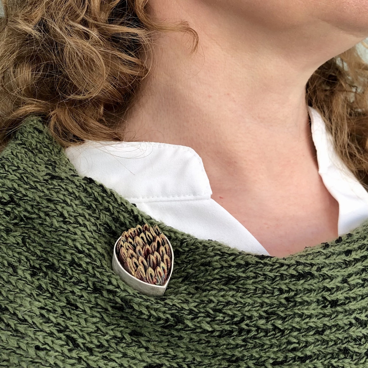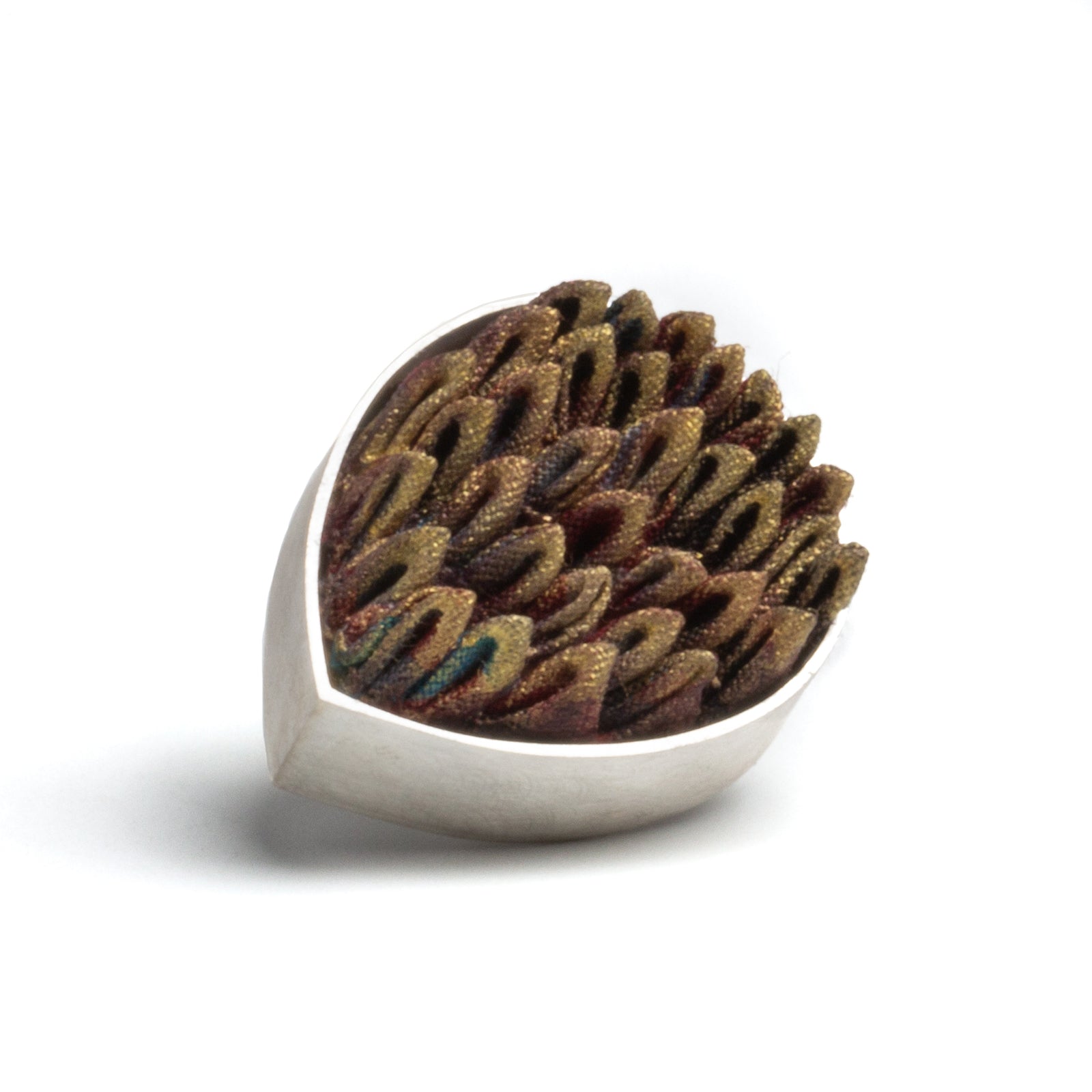 Artist Statement: The Japanese material I received has abstracted sunflower designs. Sunflowers represent loyalty and longevity. I was influenced by the colors and patterns of this fabric. The fabric petals and “seeds” are folded by hand (Tsumami) and painted. Japan has a long history of artisans practicing the art/craft of Tsunami Kanzashi. Tsumami, a traditional technique for making petals, and flowers from fabric for Kanzashi (ornamental hairpins). Tsumami Kanzashi has been worn by women for about 200 years to match the kimono. Now it is worn at festivals, such as New Years, for 3 and 7 year-old girls, Coming of Age Day and weddings. I have been practicing this technique off and on for a few years. Each petal or “seed” is folded from a ½” piece of fabric and glued in place with a rice starch, then painted. I find this process to be the fabric equivalent of my chasing and repousse in metal. It is meditative, takes great attention to detail, and is pattern oriented.