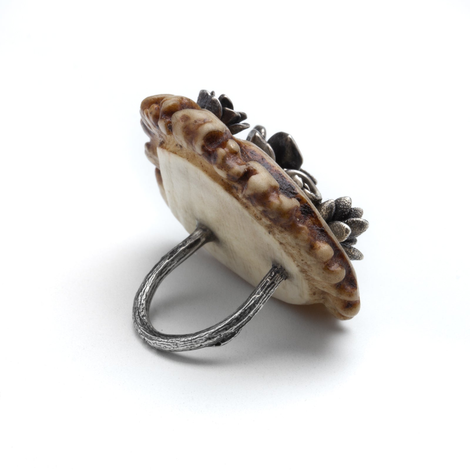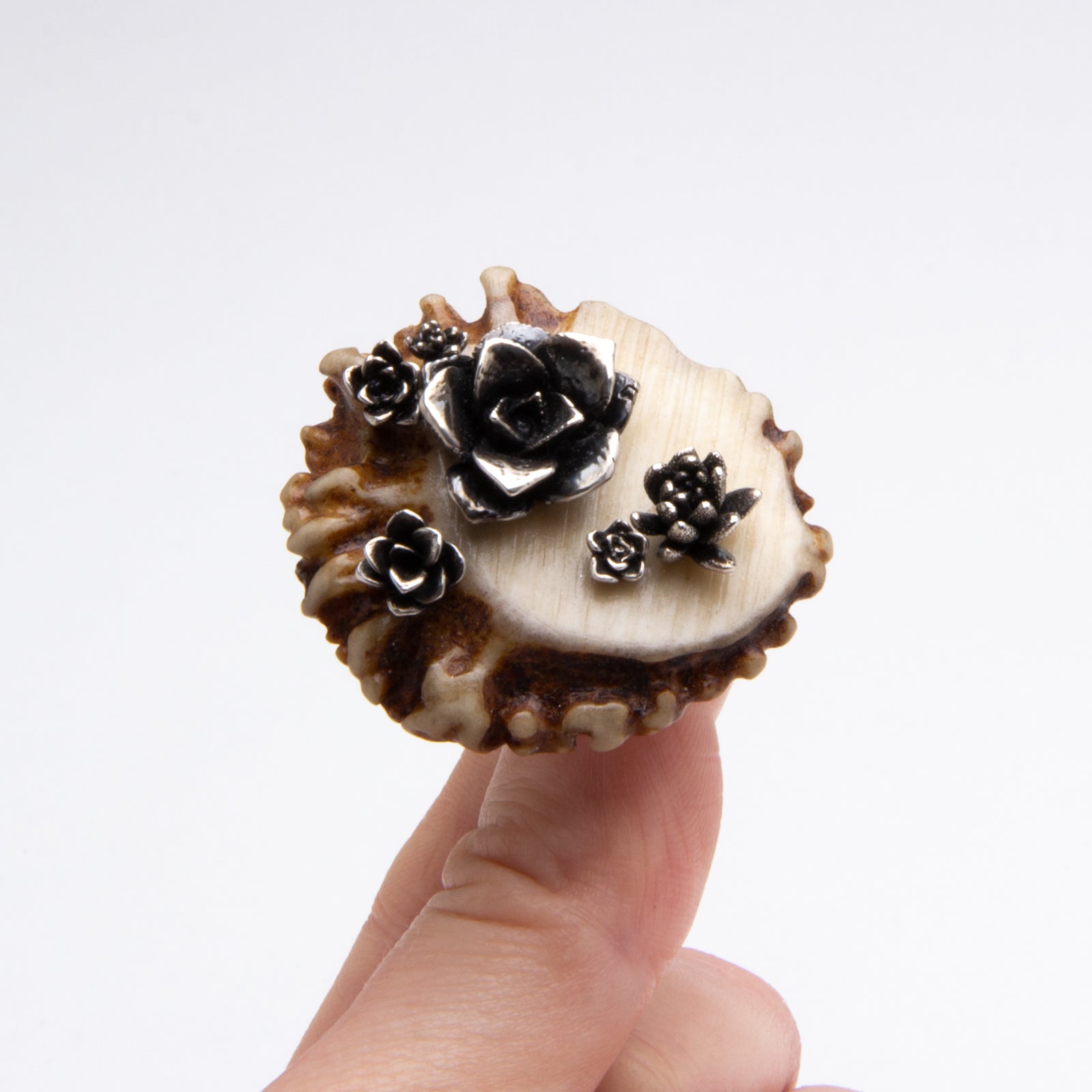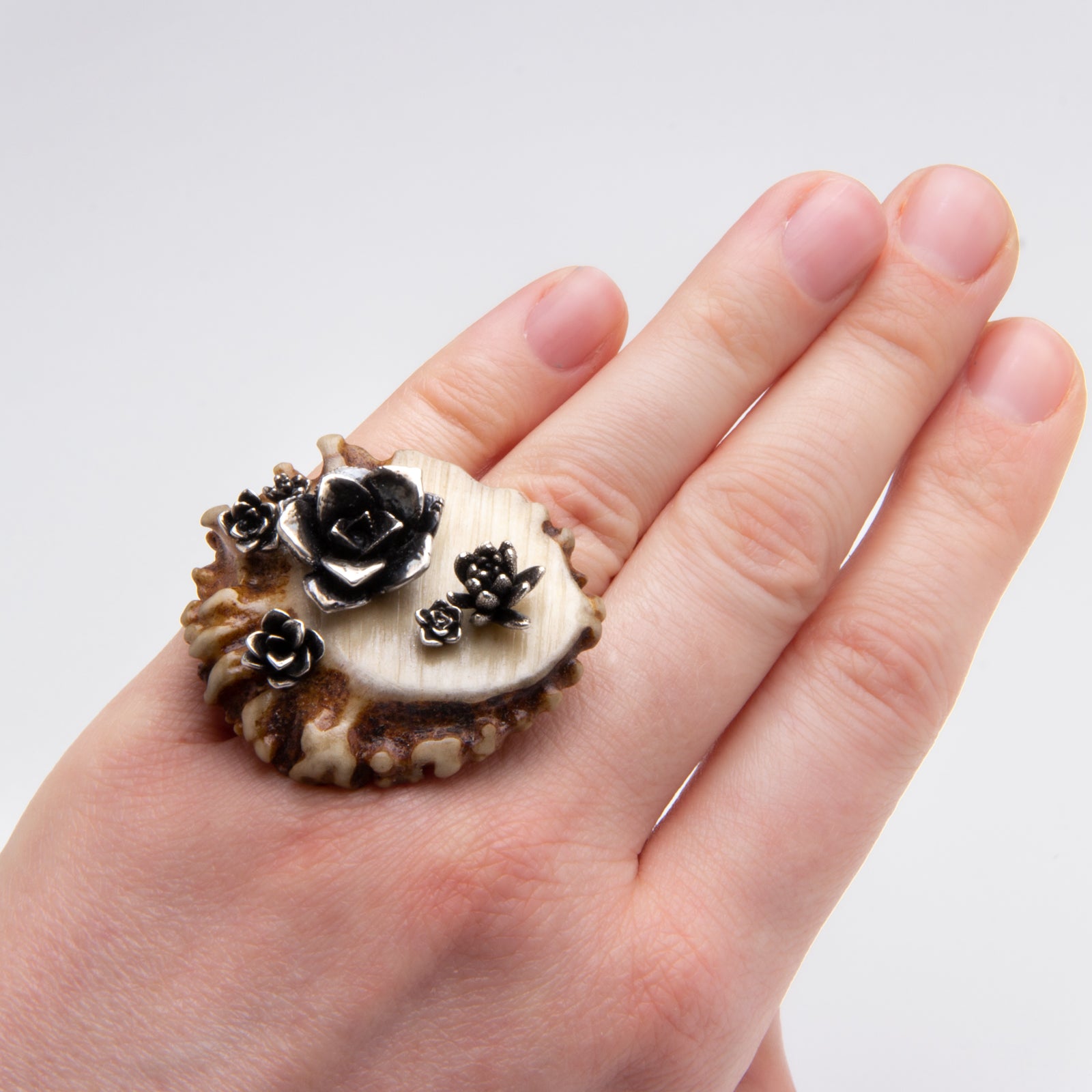 Artist Statement: This ring is a love letter to the beauty of nature. The contrast between the shiny sterling silver succulent rosette clusters against the earthy rough textures of the antler burr rosette is what really makes this piece stand out. Even though both elements are rosettes in shape and each were once growing and somewhat alive, they differ so much in material, texture, and size. My ring brings these opposites together in a stunning display showcasing the fascination that our earth creates.