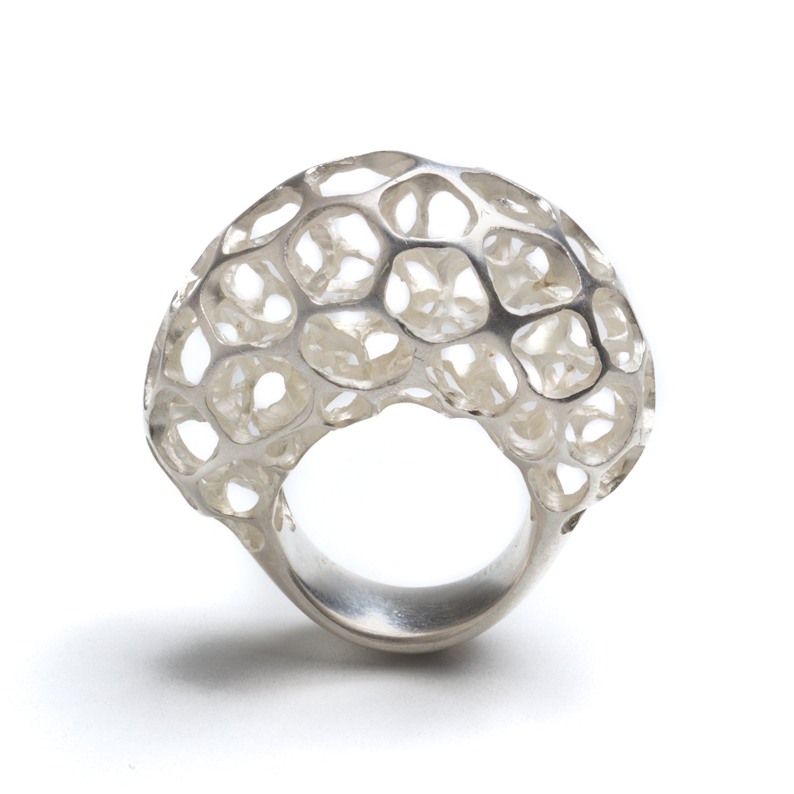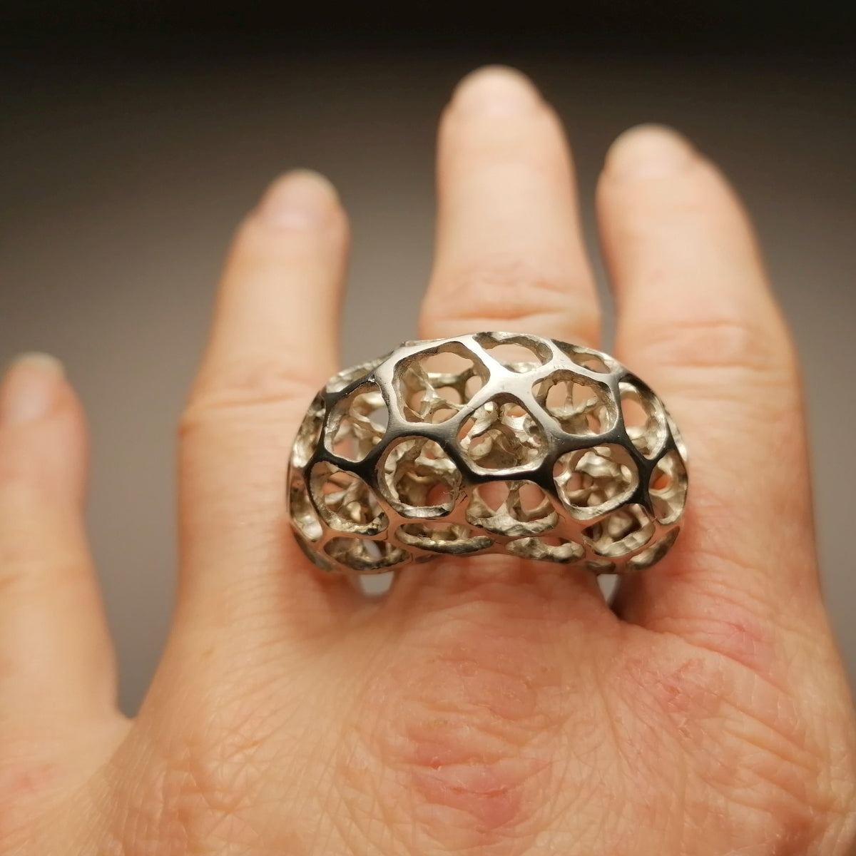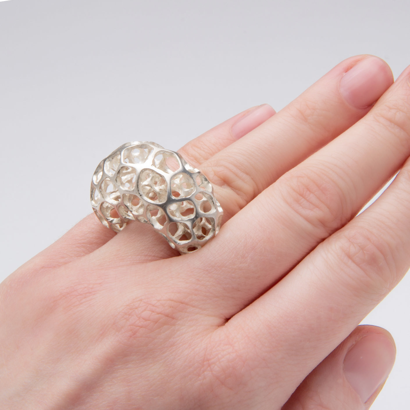 Artist Statement: This ring is about courage. How much wax I dare to carve away so, that the structure would not collapse. My intention was to create something strong but aerial in view. Something like foam, where a little fluid and a lot of air creates a strict geometrical, but still organic looking structure. This is a piece of hand carved foam, where every bit of wax that I carved away took me closer to the potential failing. When to stop? How much nothing keeps balance with how much something?