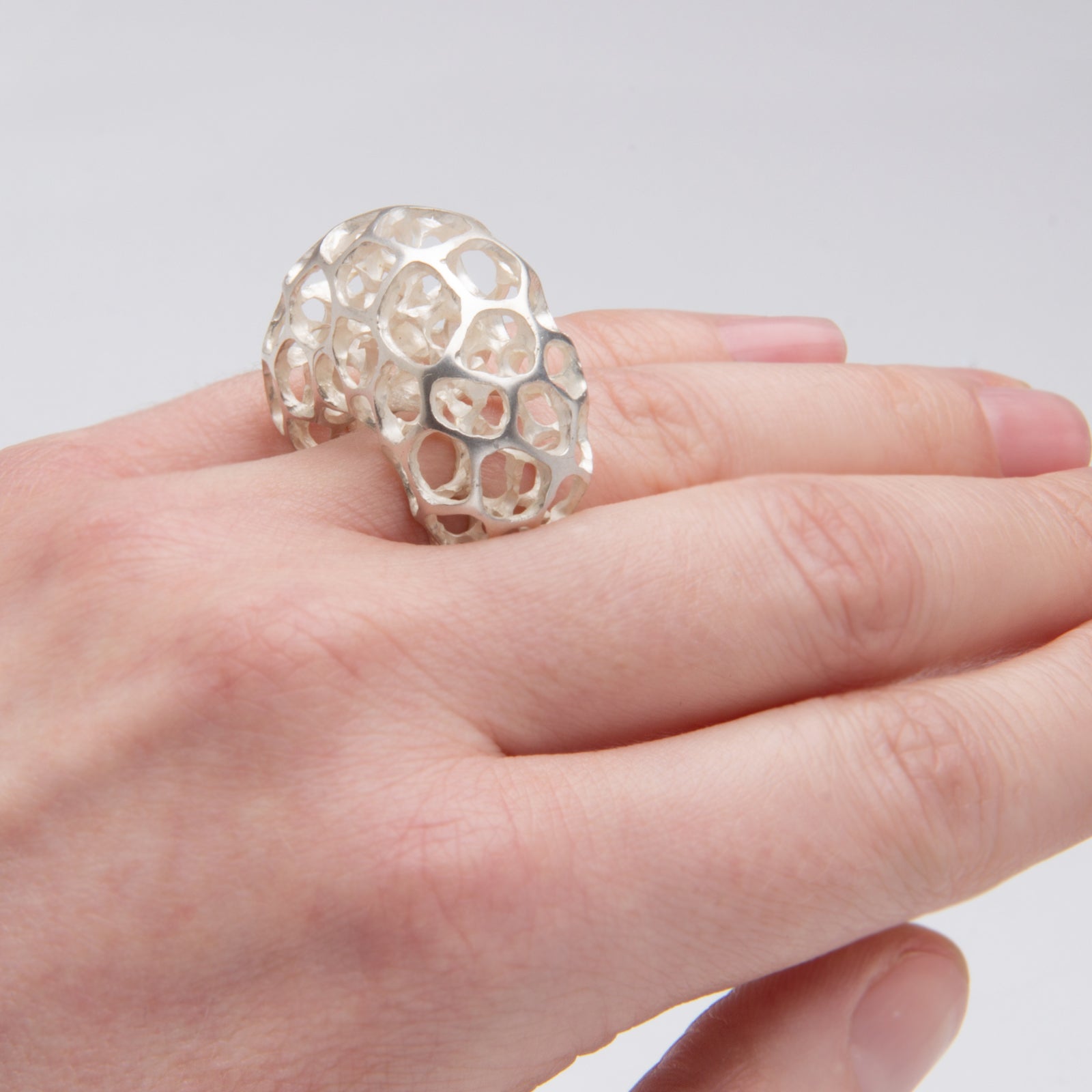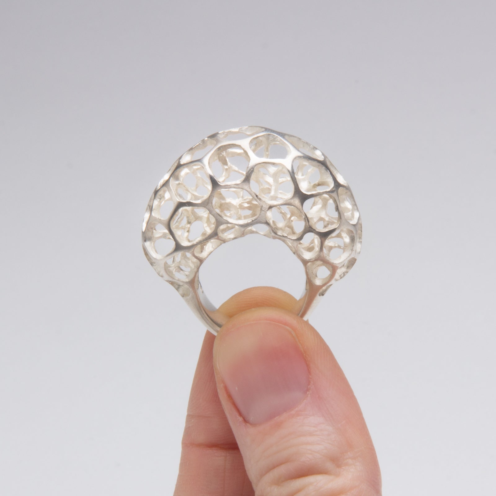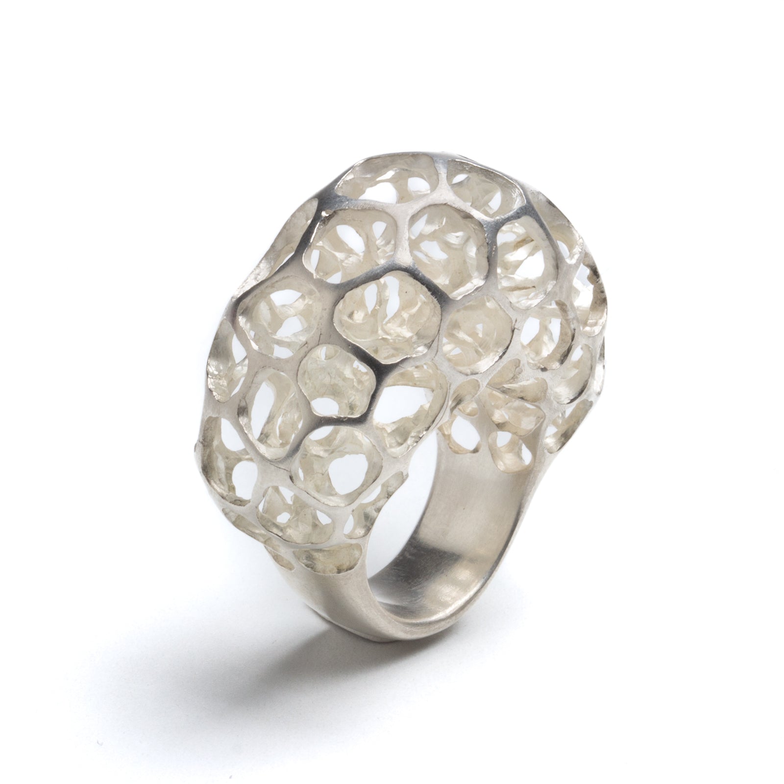 Artist Statement: This ring is about courage. How much wax I dare to carve away so, that the structure would not collapse. My intention was to create something strong but aerial in view. Something like foam, where a little fluid and a lot of air creates a strict geometrical, but still organic looking structure. This is a piece of hand carved foam, where every bit of wax that I carved away took me closer to the potential failing. When to stop? How much nothing keeps balance with how much something?