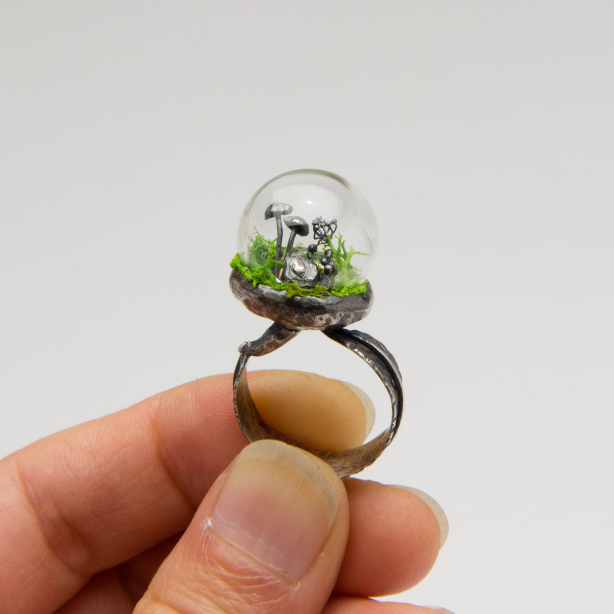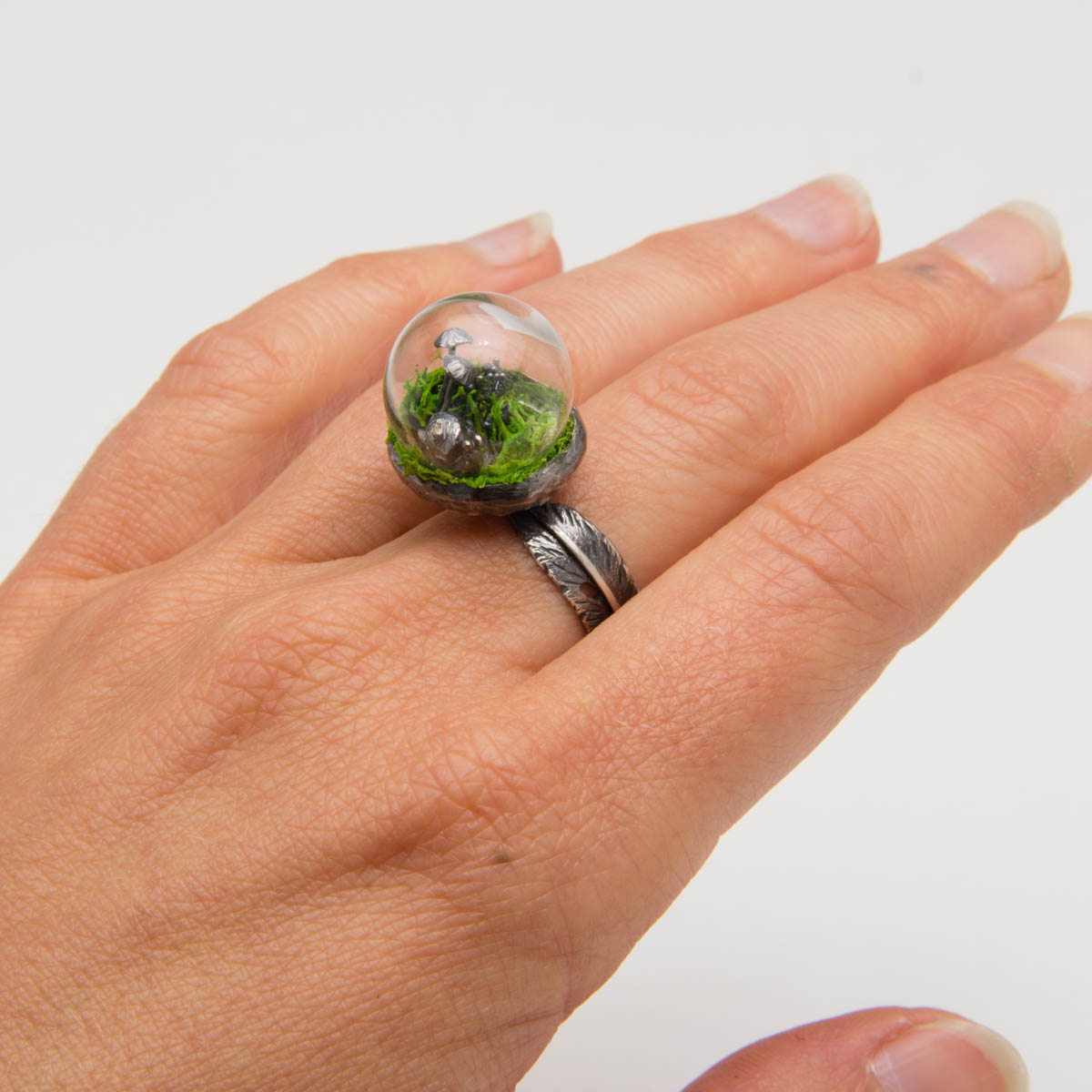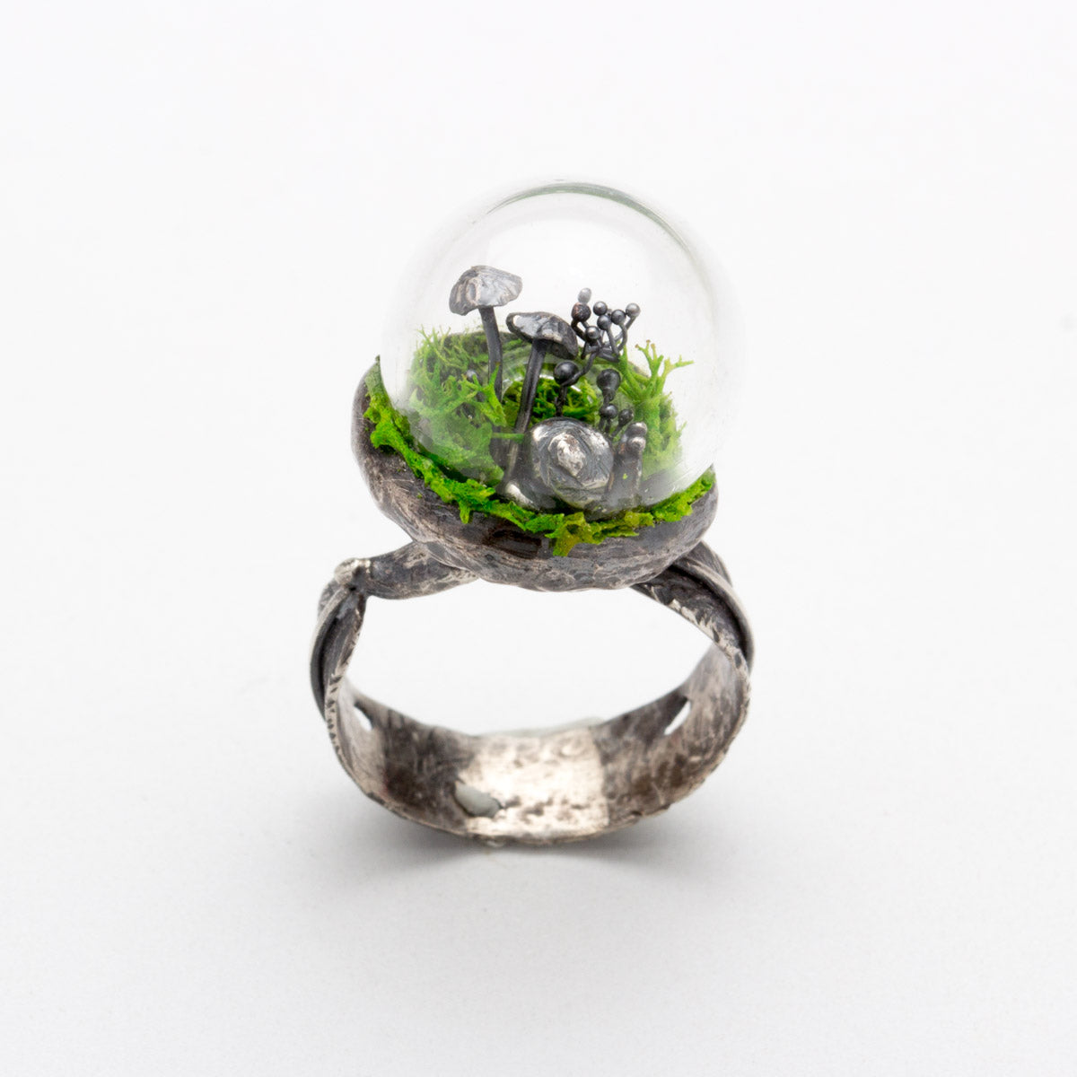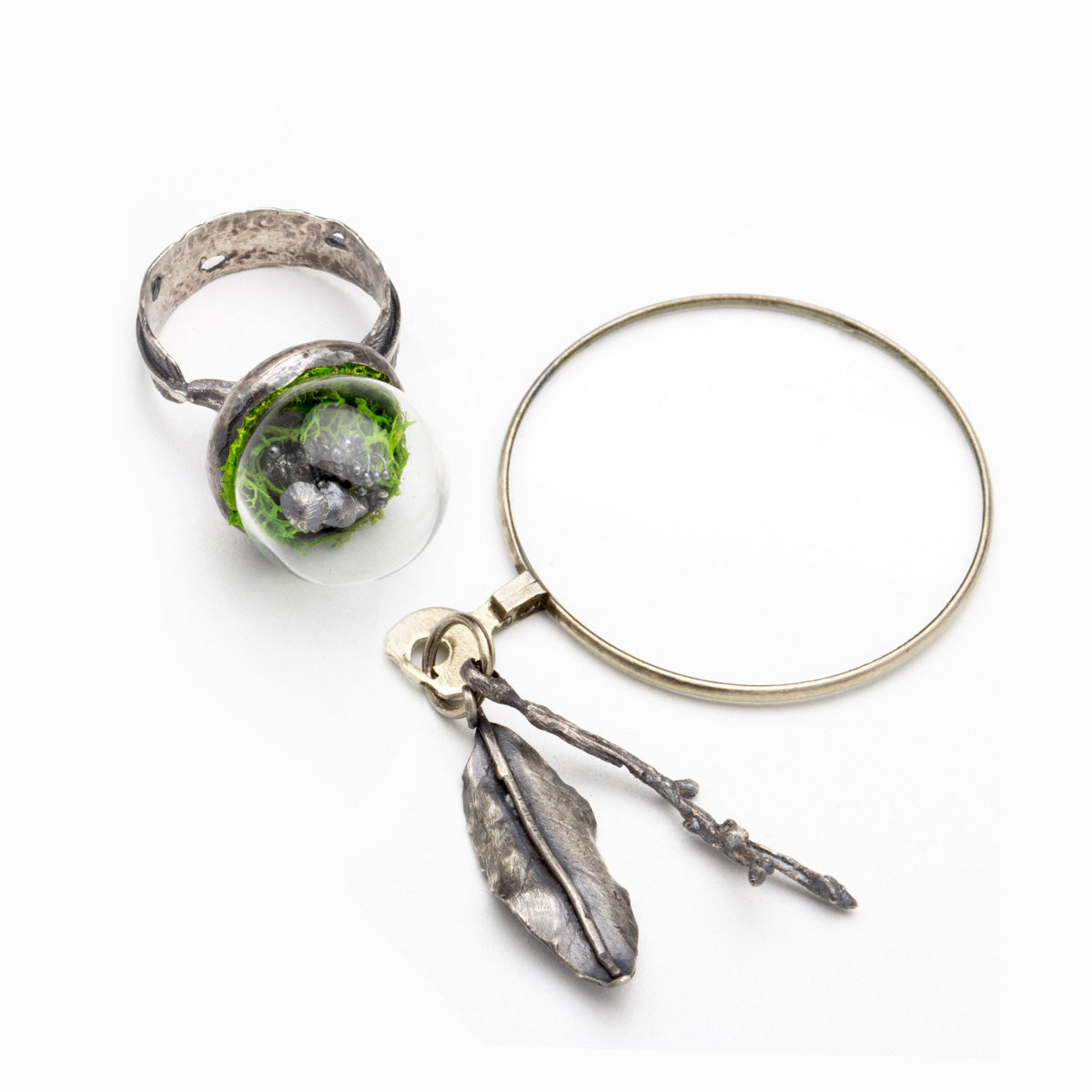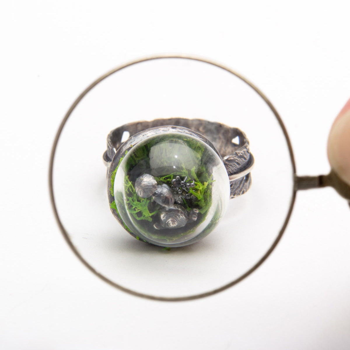Artist: Shino PoseyMaterials: sterling silver, glass, reindeer mossSize: 5
