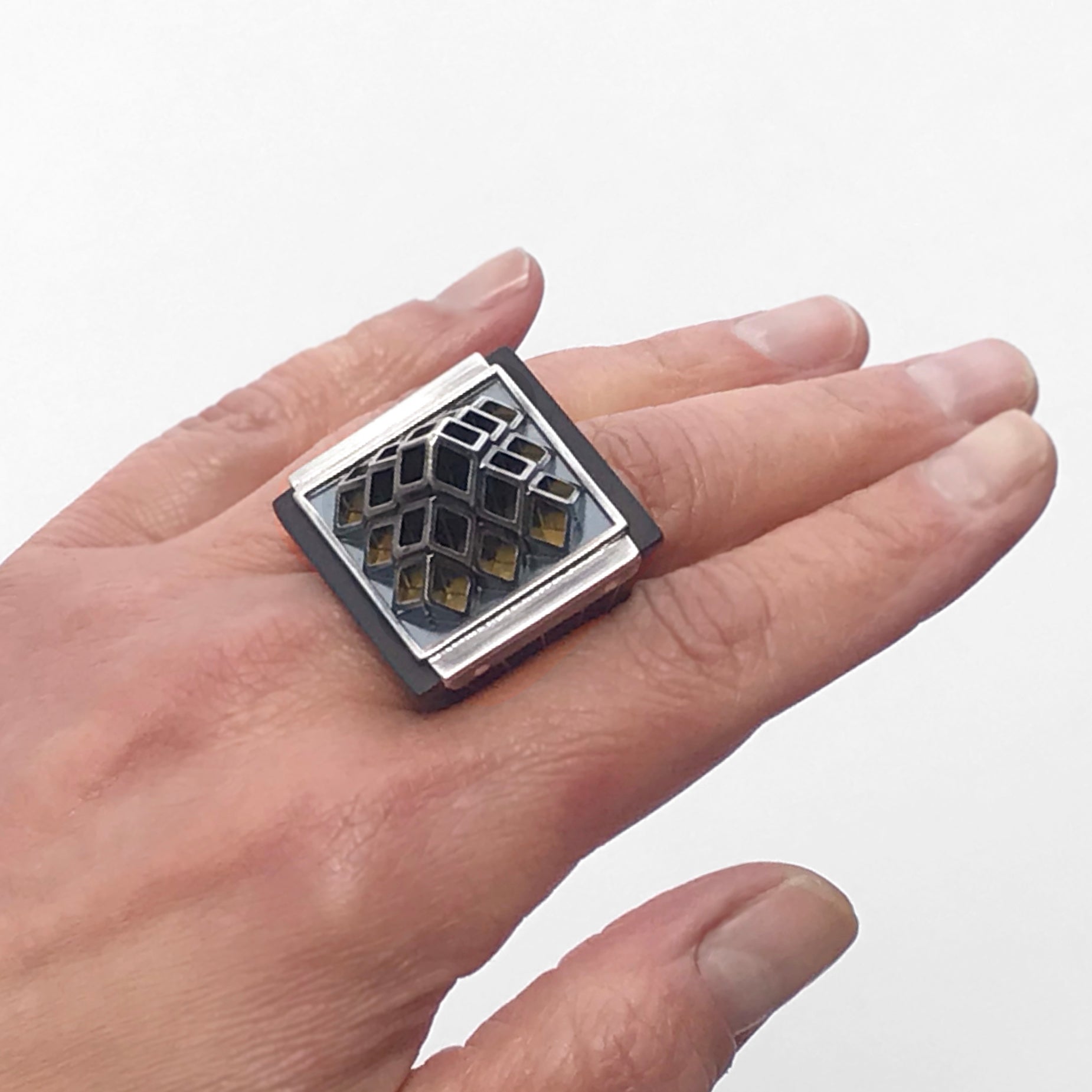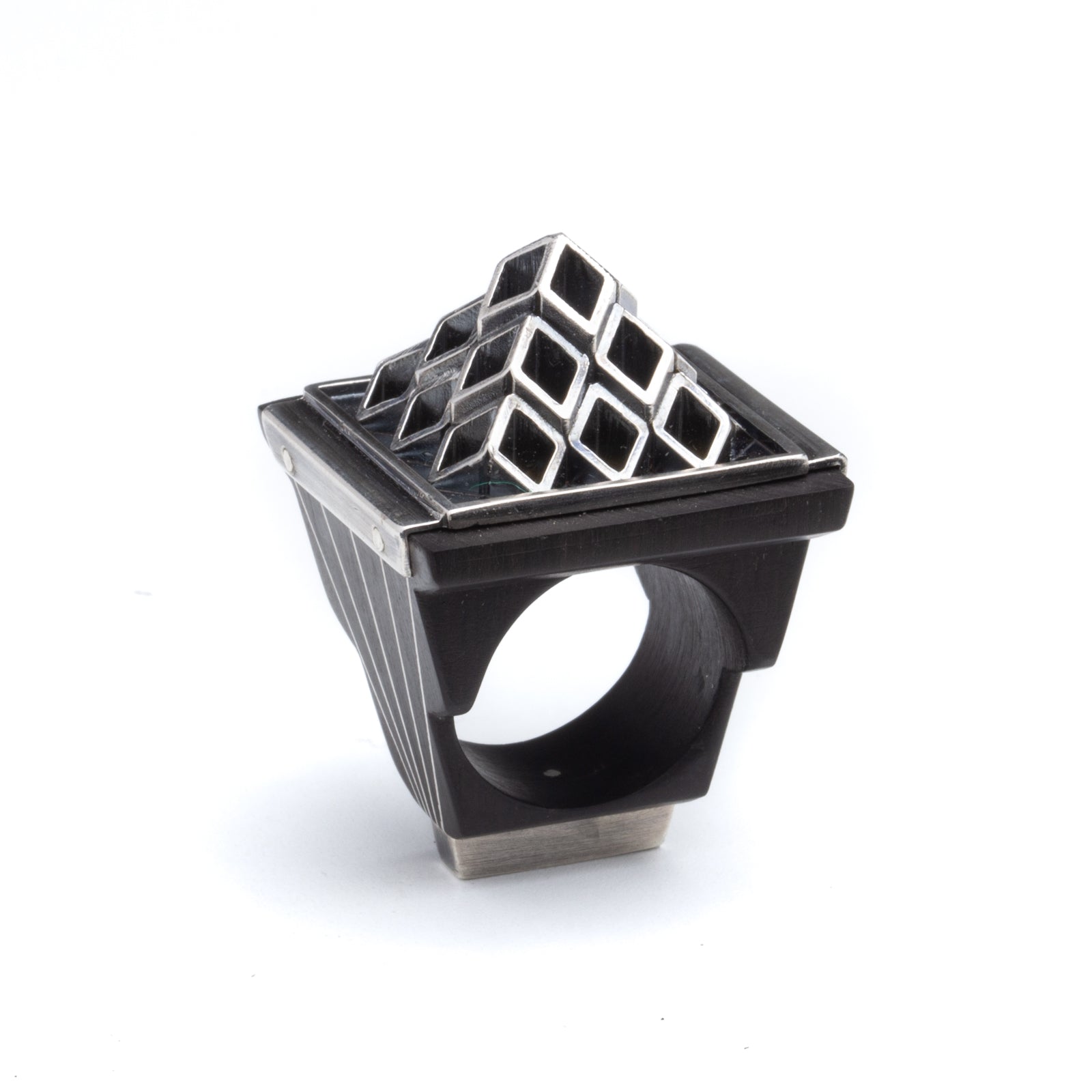 Artist Statement: Fabricated from wood and precious metal this ring is heavily influenced by architecture, especially the art deco era. The ebony base creates a vibrant contrast to the fine silver inlay radiating upward on both sides. This directional thrust is met at the top by a faceted pyramid created from sterling silver tubing. The hollow tubing invites your eye in and rewards the viewer with a luscious layer of gold nestled under the pyramid. Mixing materials gives me a chance to play with design and construct in a way not possible when only working in metal. RISE is a culmination of material research that began in graduate school and continues to grow with each piece.