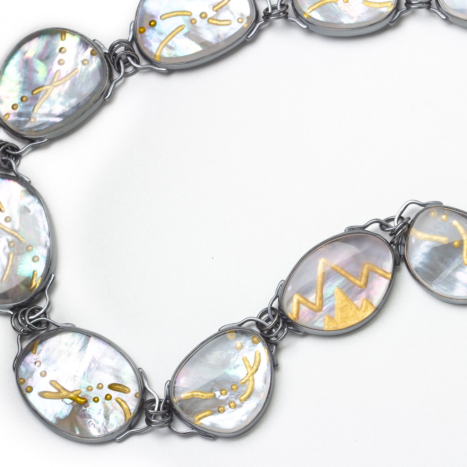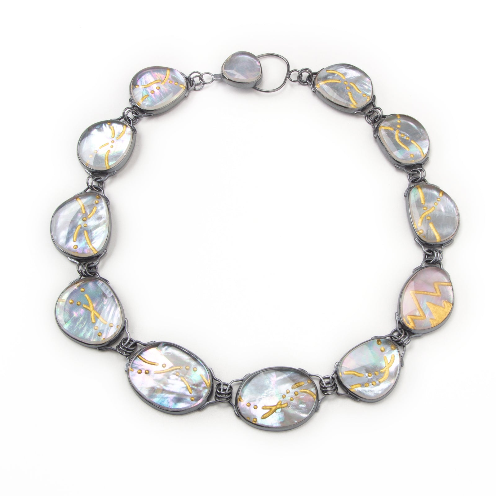 Artist Statement: This pieces features a series of hand cut and carved optical quartz and one rose quartz that have all been laminated to mother-of-pearl. Then the pattern inspired by the fabric was carved into the stones in way to give the appearance of the pattern flowing from one stone to the next. The carving was then filled with 23K gold leaf. The stones are set in a hand fabricated sterling silver necklace that has been oxidized to create contrast between the metal and the stones.
