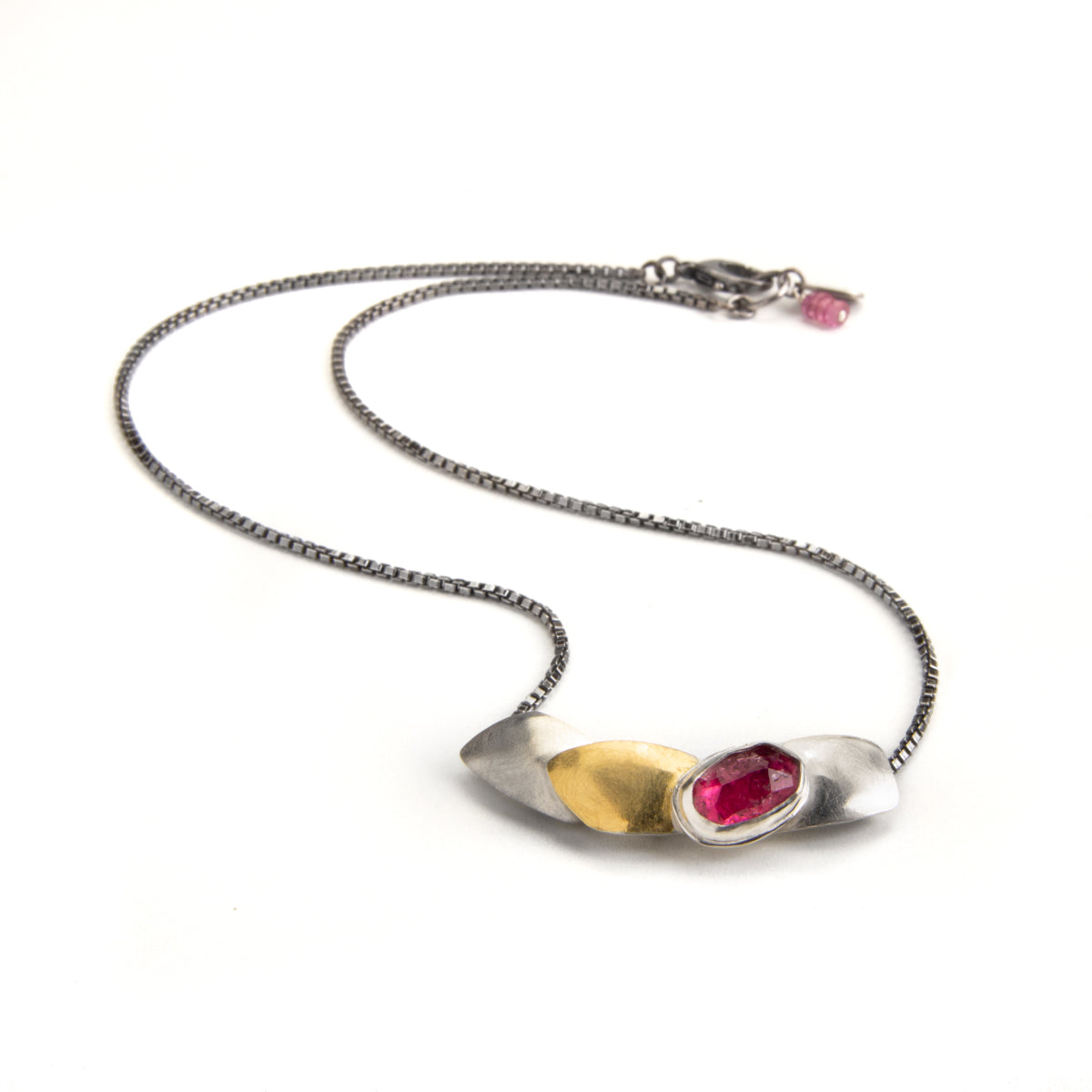 Materials: Argentium 935 silver, 24k gold foil, tourmaline, pink sapphire, sterling silver chain