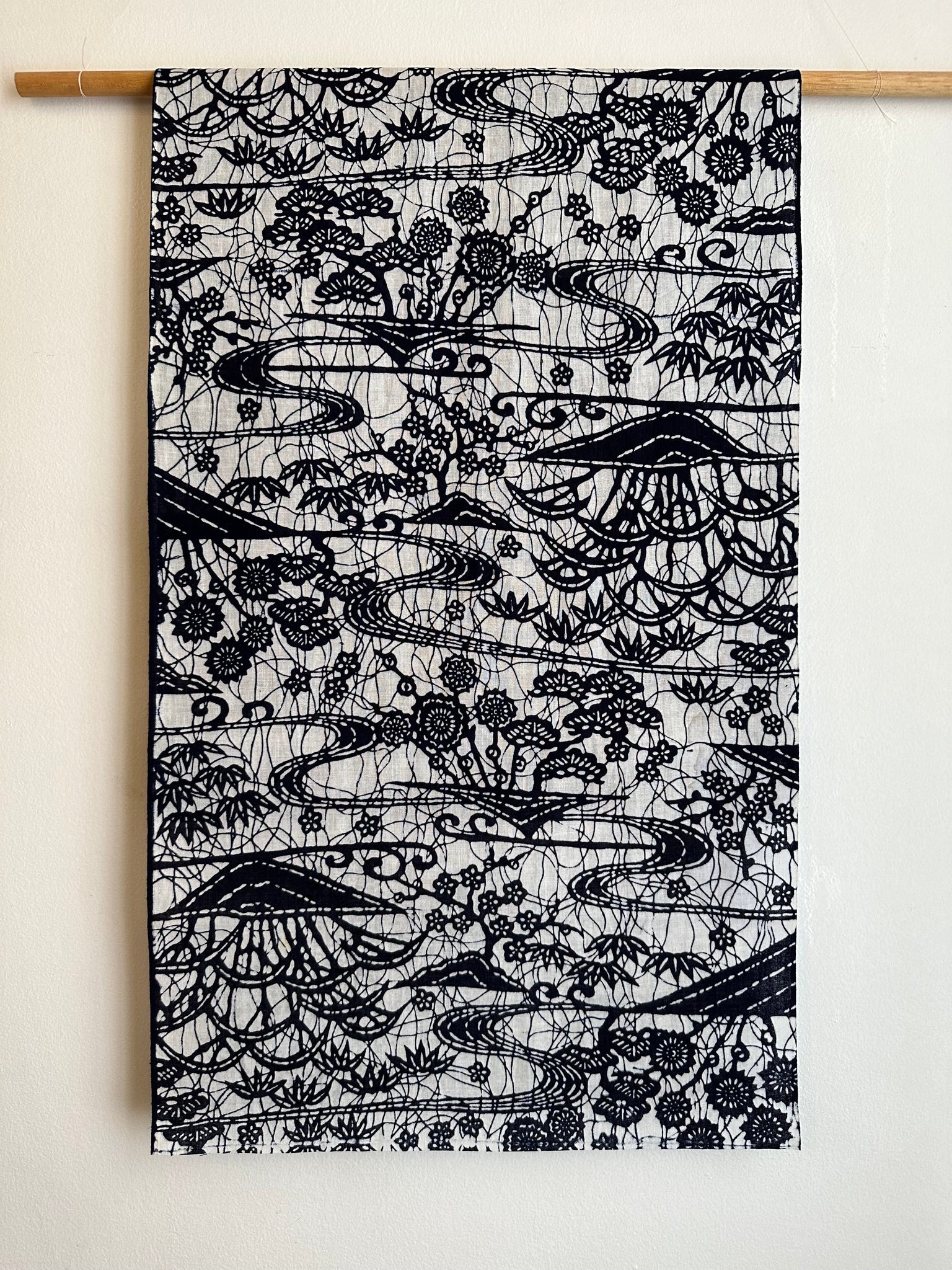 Fabric Motif: This fabric is packed with a plethora of Japanese traditional motifs, in indigo and white: plum blossoms, chrysanthemums, bamboo, pine trees, mountains and water.