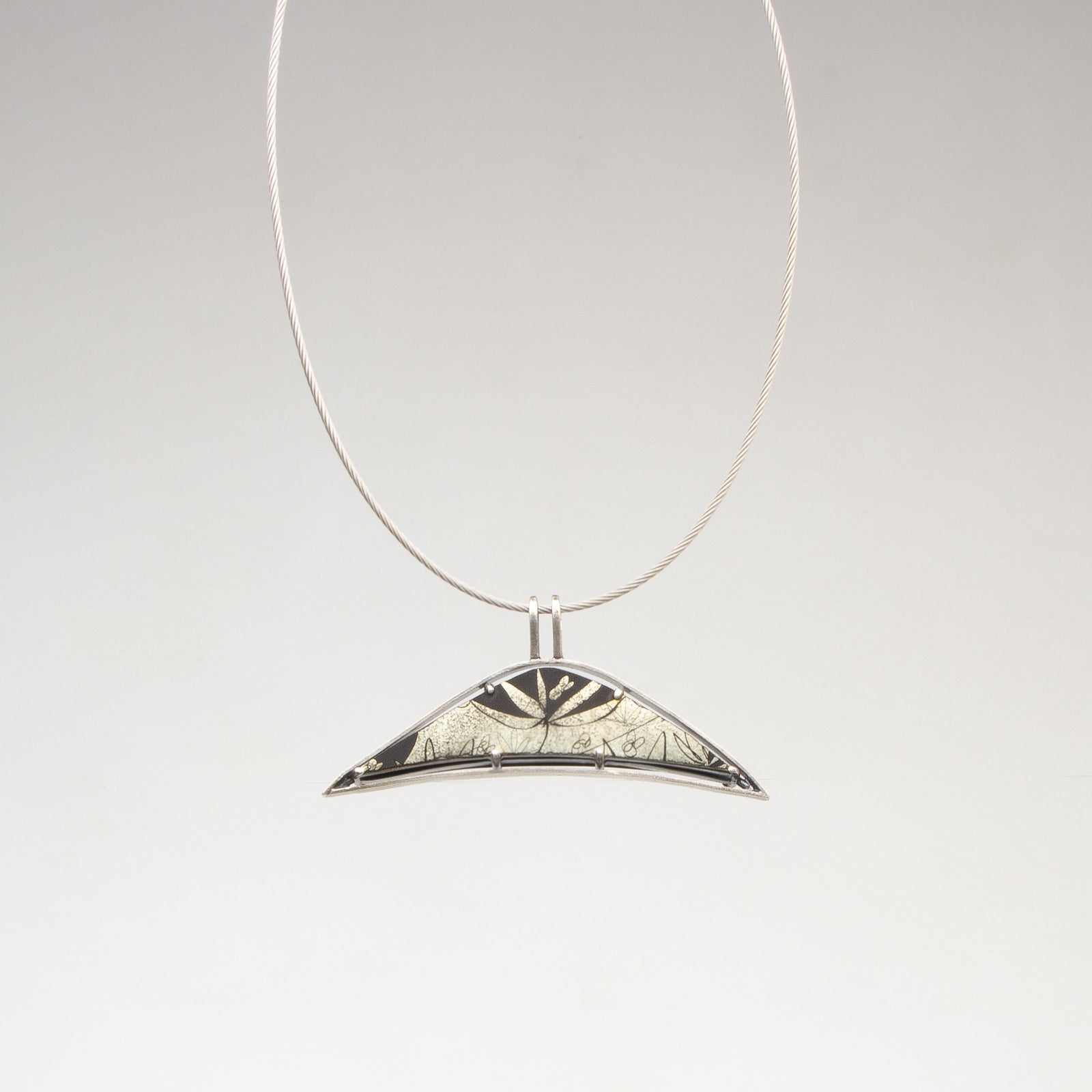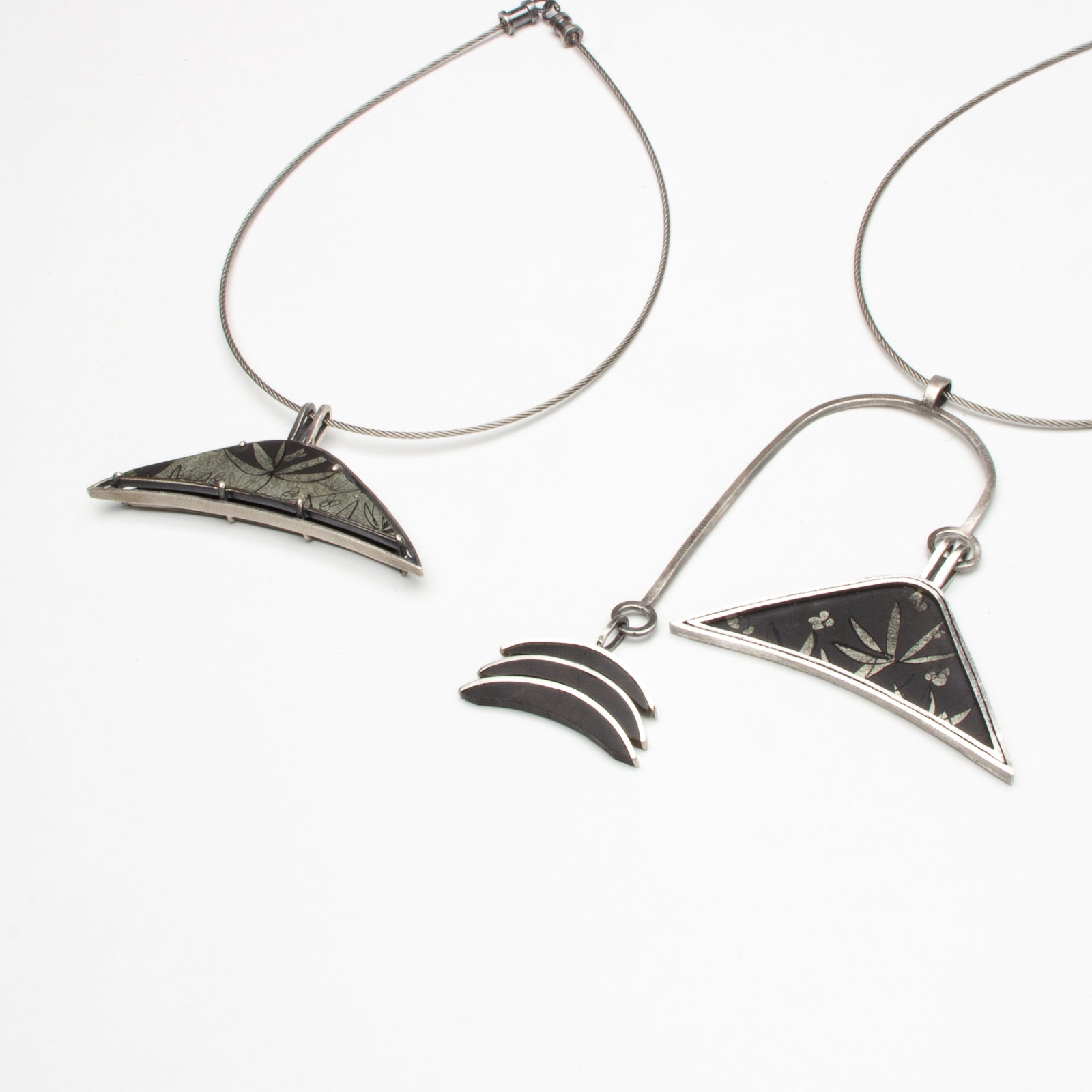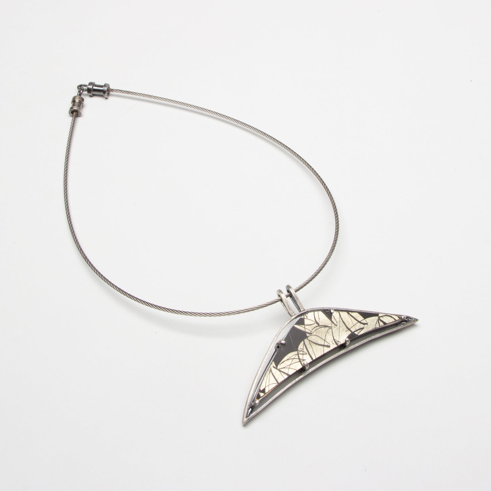 Materials: stainless steel cable, 12 kt white gold leaf enameled on pre-enameled steel, sterling silver