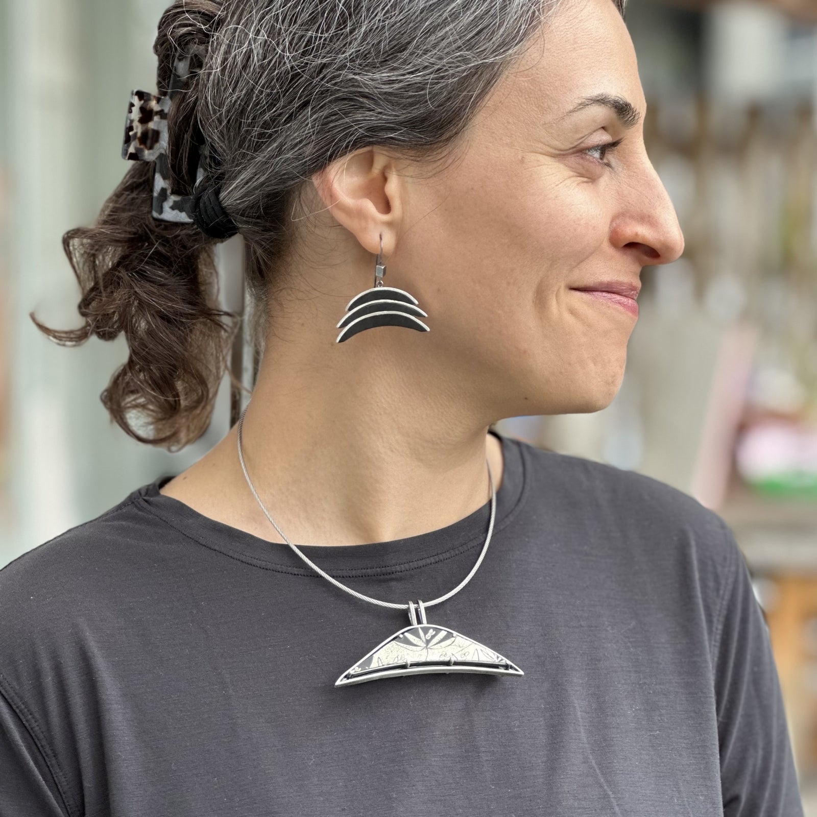Artist Bio: I am a narrative storyteller, and my jewelry is my voice. I could spend a lifetime learning, traveling, and exploring. Everywhere I go, I find meaning in each person I meet and the events in my life from master smiths in Mexico, a bus ride in Seattle, to living with a cherished grandparent. I have had incredible life experiences and opportunities. The work I create is all about people and experiences that have moved me and influences my life. Each piece I create has a story to tell inspired to by my own inner thoughts and beliefs, as well as meaningful interactions with people I meet. My work in each discipline I explore involves continual study that helps my proficiency. I love line, shape and form. Each of us leaves a mark in the world. My mark is to try to create a story for my personal encounters and experiences. My jewelry is my voice.