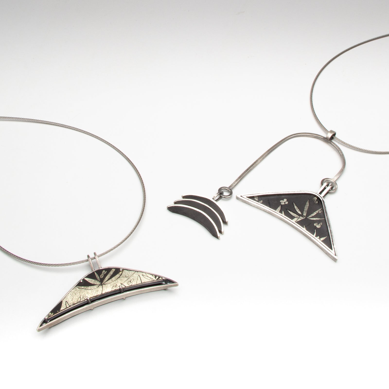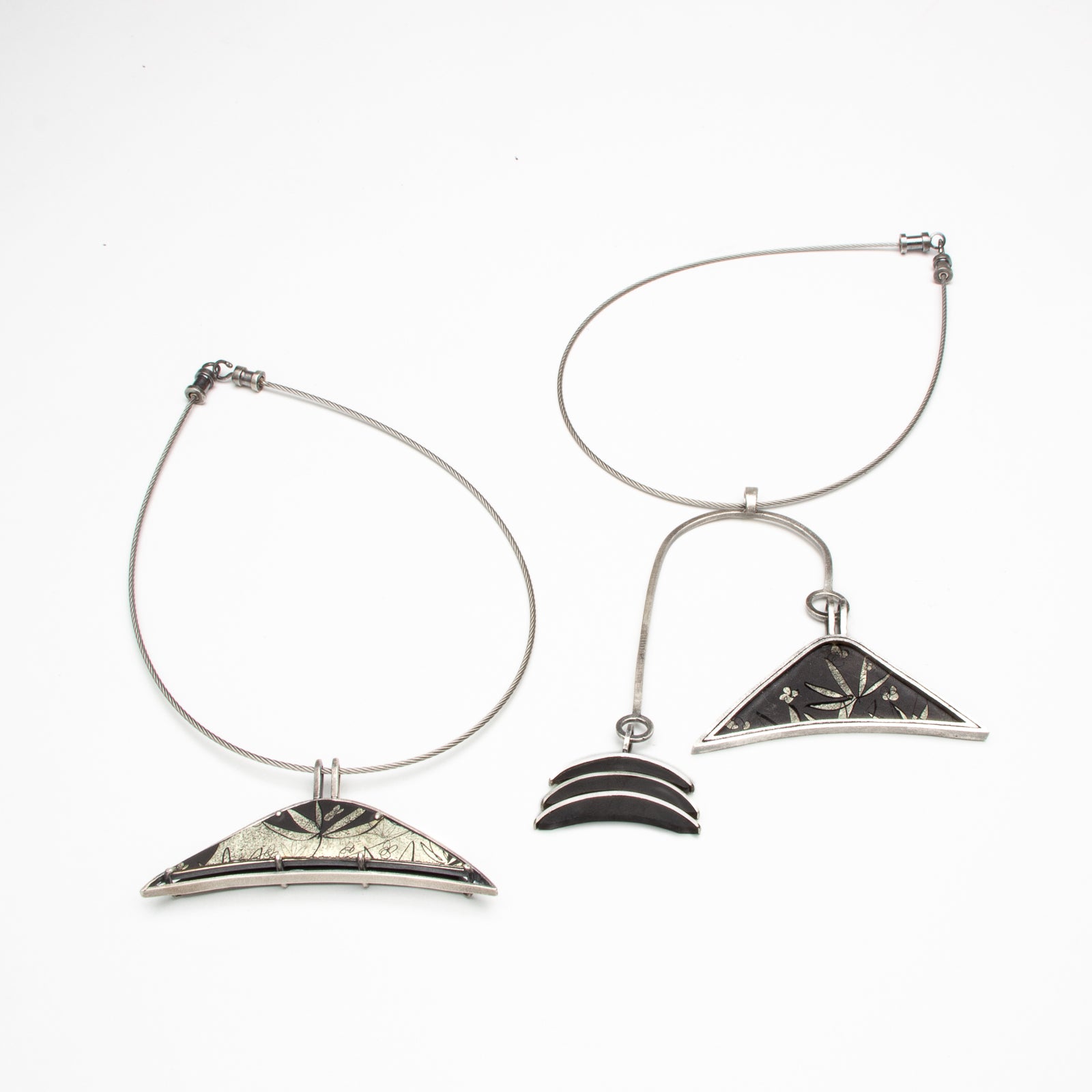 Materials: stainless steel cable, 12 kt white gold leaf enameled on pre-enameled steel, sterling silver