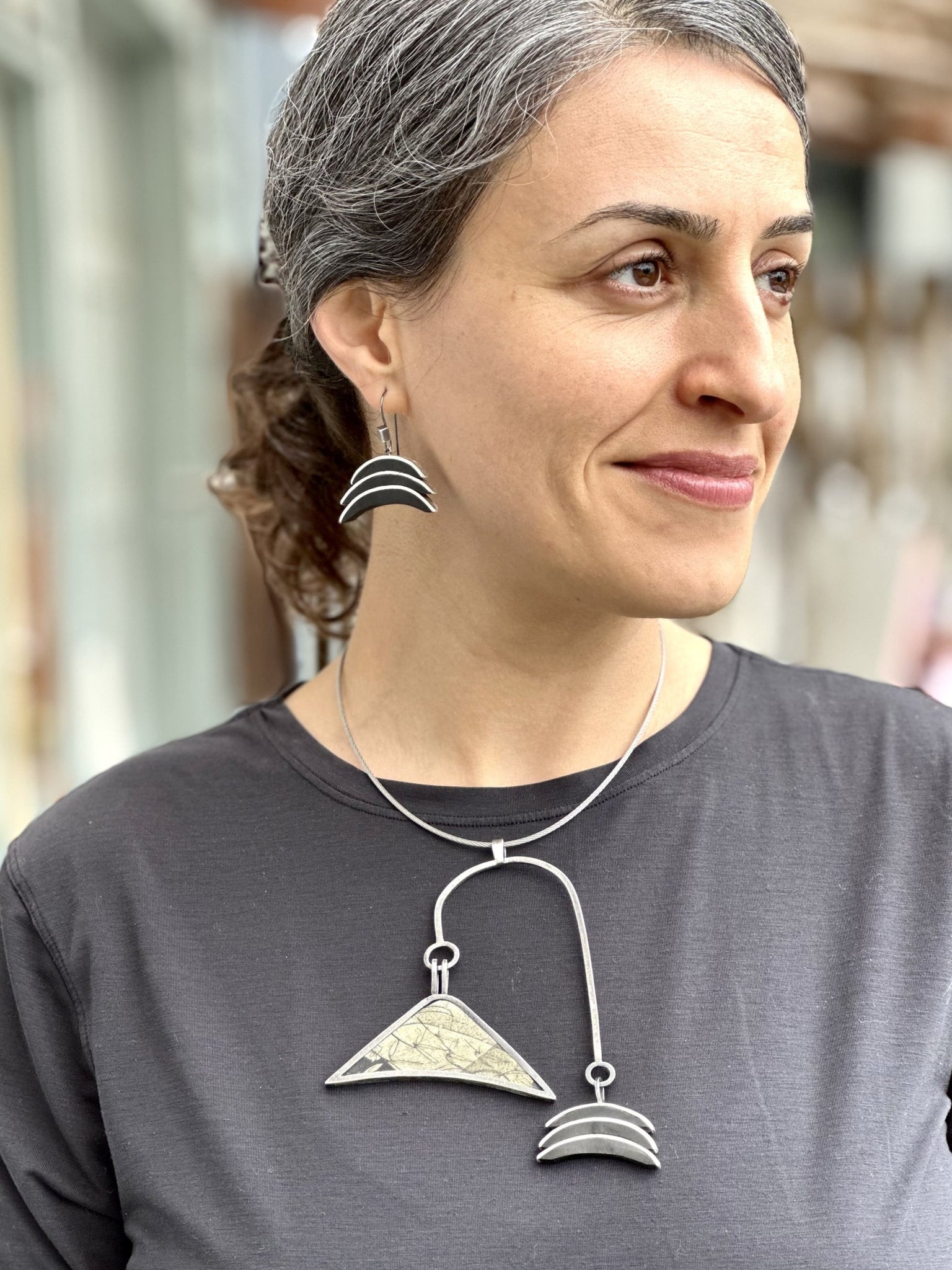 Artist Bio: I am a narrative storyteller, and my jewelry is my voice. I could spend a lifetime learning, traveling, and exploring. Everywhere I go, I find meaning in each person I meet and the events in my life from master smiths in Mexico, a bus ride in Seattle, to living with a cherished grandparent. I have had incredible life experiences and opportunities. The work I create is all about people and experiences that have moved me and influences my life. Each piece I create has a story to tell inspired to by my own inner thoughts and beliefs, as well as meaningful interactions with people I meet. My work in each discipline I explore involves continual study that helps my proficiency. I love line, shape and form. Each of us leaves a mark in the world. My mark is to try to create a story for my personal encounters and experiences. My jewelry is my voice.