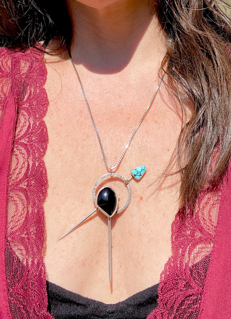 Hand forged and fabricated, this pendant features a freeform slice on Onyx to ground the design and an arrow of turquoise pointed toward the cosmos, with a touch of gold between the two for vitality. The tapered accents give a sense of strength and protection, yet have been sanded smooth to wear with ease and comfort against the skin. A celebration of duality and harmony.