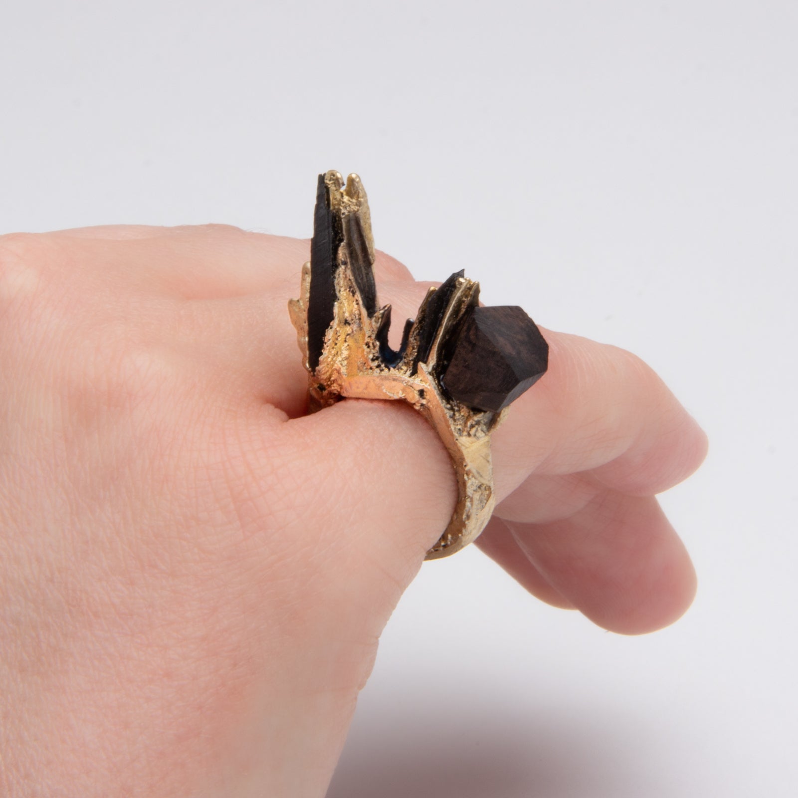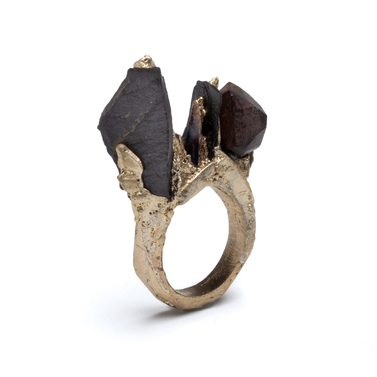 Artist Statement: Unique sand casted ring made in the Belgium countryside in the course of 2021. I had never tried this ancestral jewellery technique and was a bit frustrated in the beginning to see all my essays going wrong. Then, after days and dozens of essays pouring melted metal in sand, this ring came out and it was worth all the effort. A piece of slate was lost in process so I decided to replace it with that beautiful wood that is ebony.