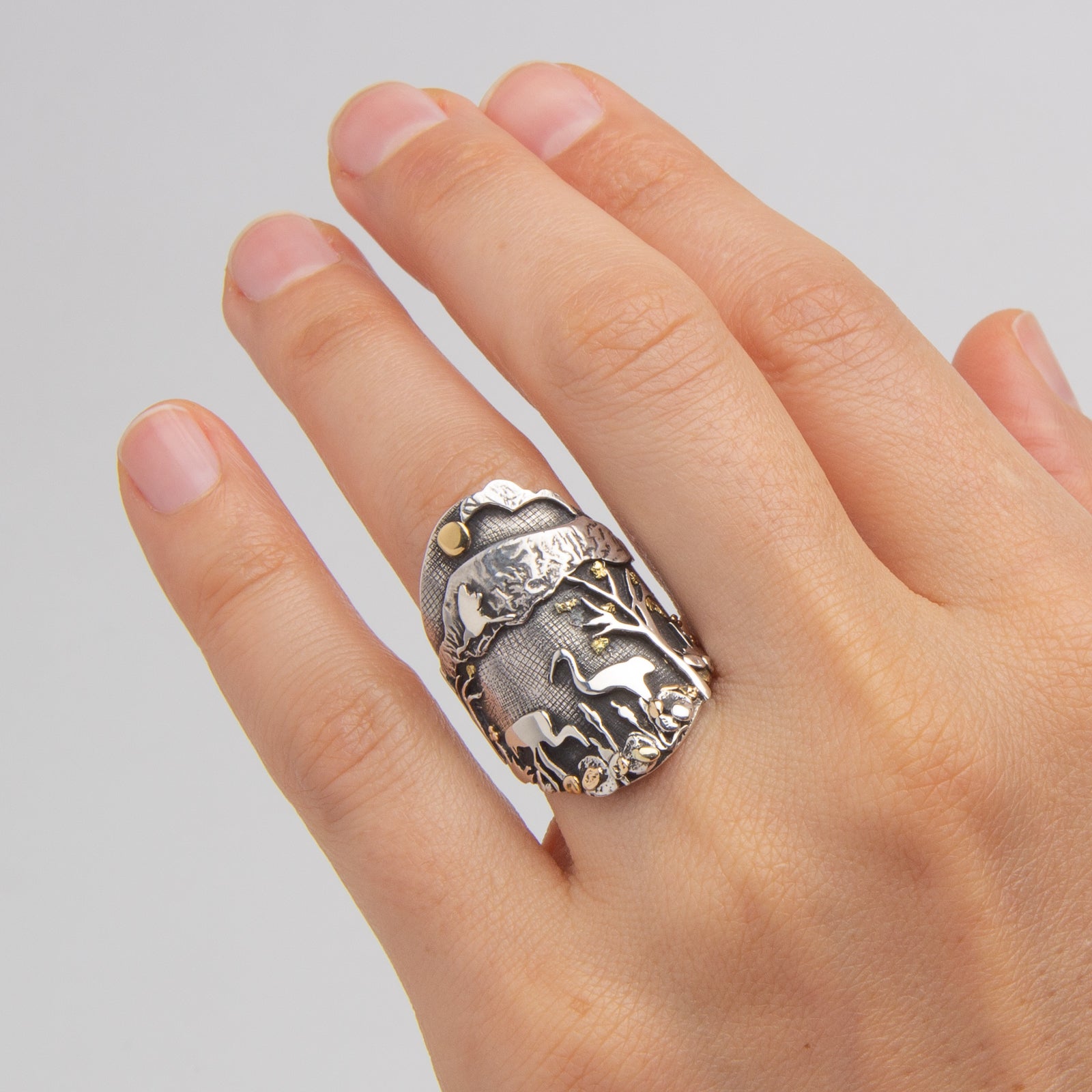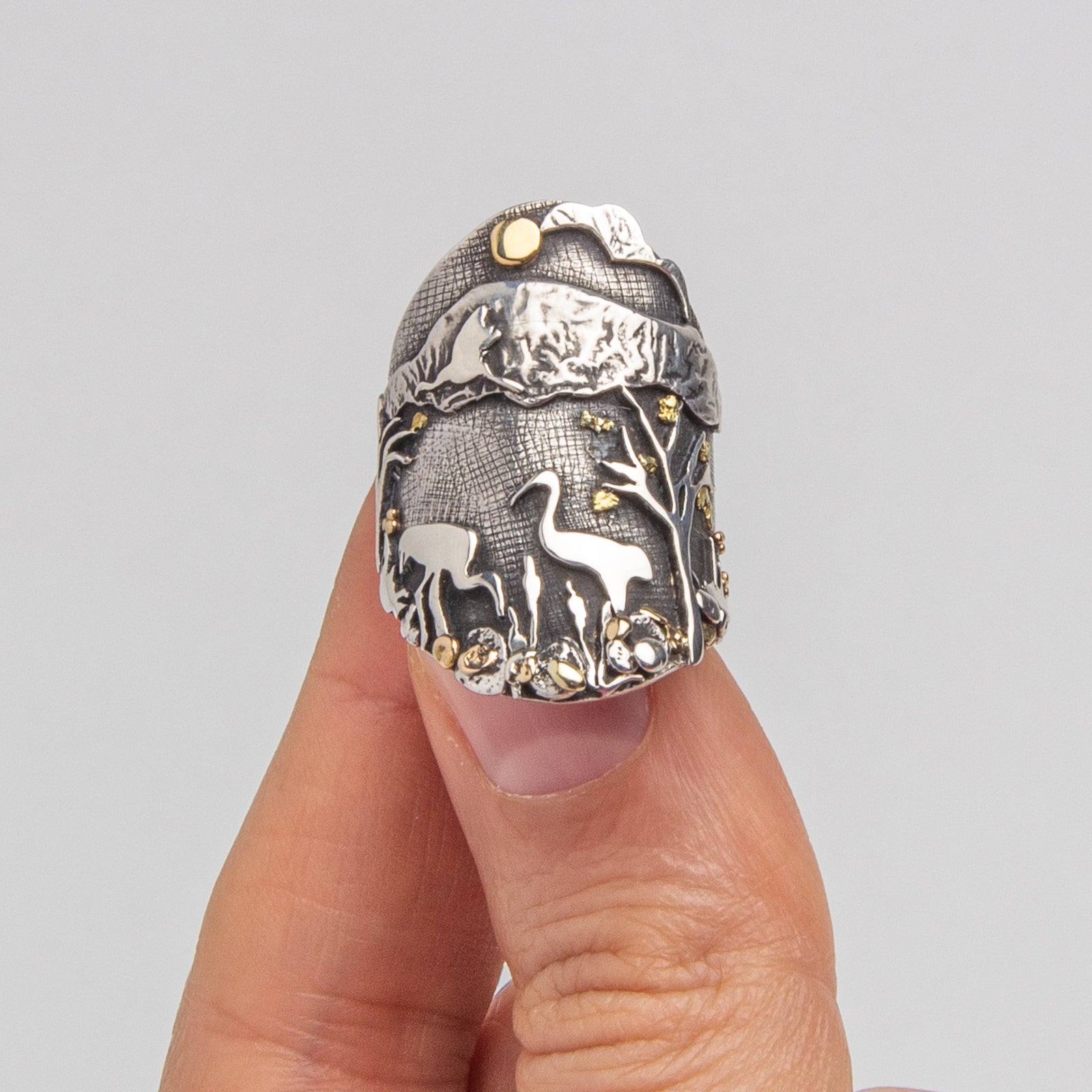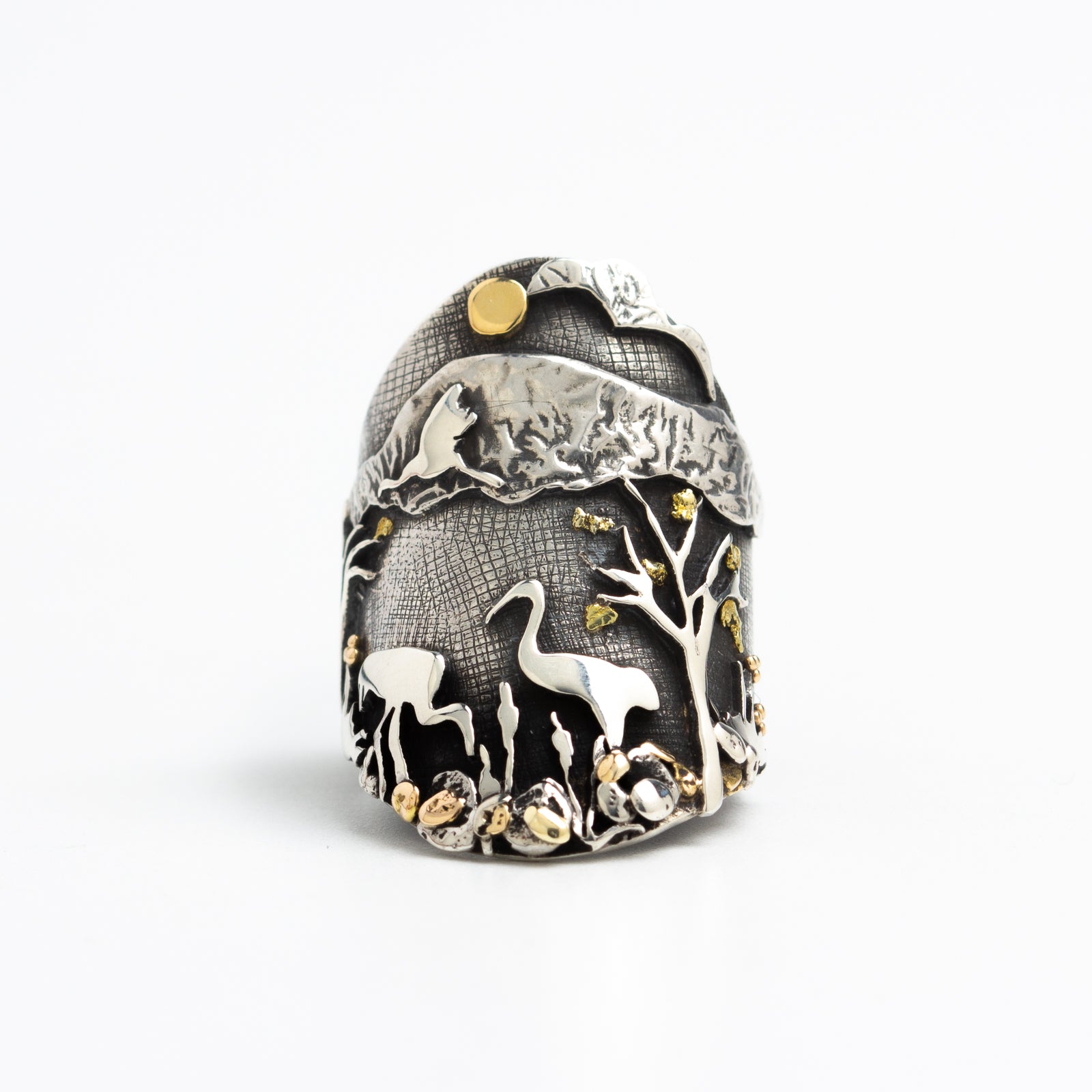 Artist Statement:  Sandhill cranes stop in the San Luis Valley in March on their way south for the summer. This depicts the Sangre de Cristo mountains in the east. The leaves in the trees are 24K nuggets from Alaska, the sun/moon is 18K and the rest of the trim is 14K on sterling silver. Each piece is hand cut with the jewelers saw and some pieces are very tiny! This is definitely a one-of-a-kind piece!