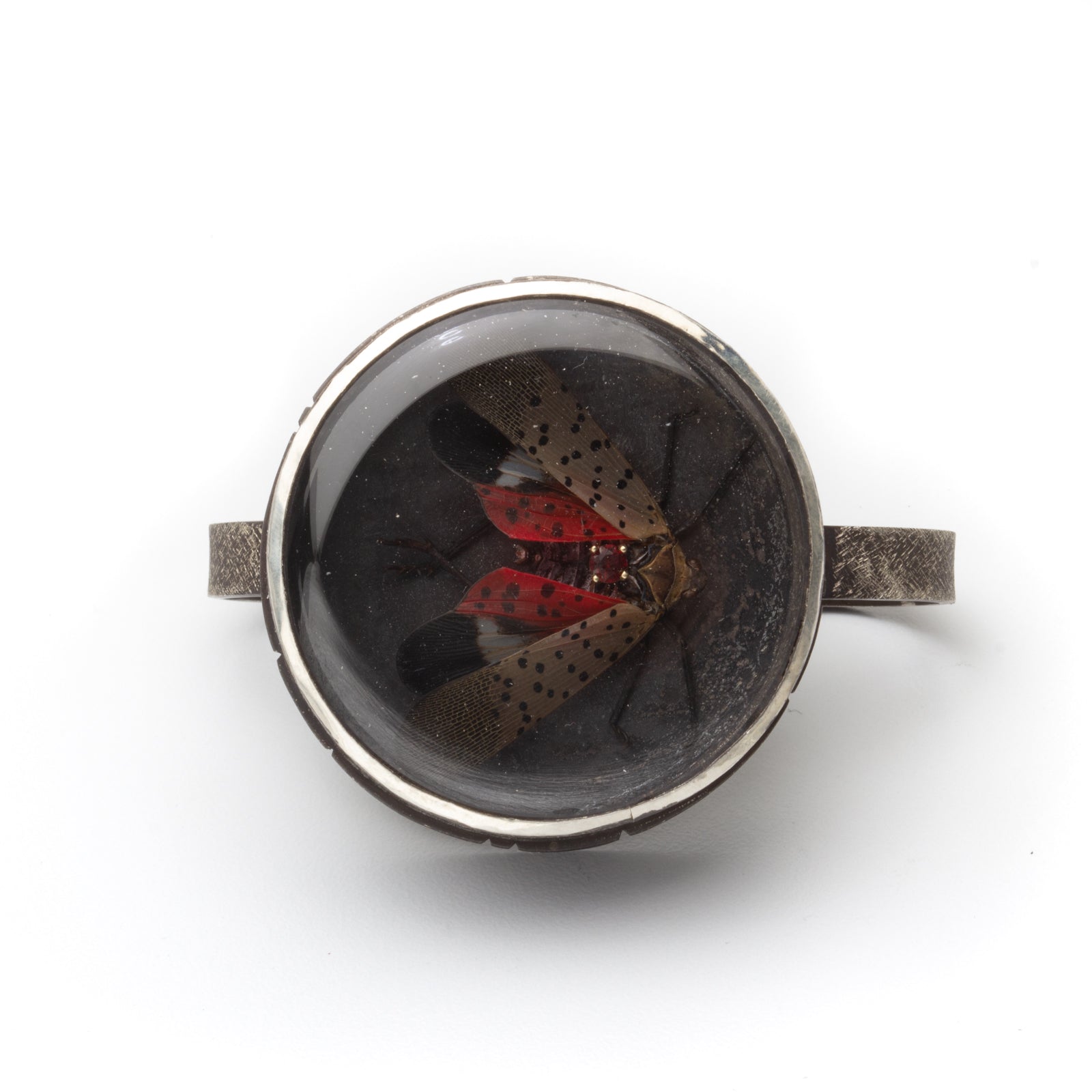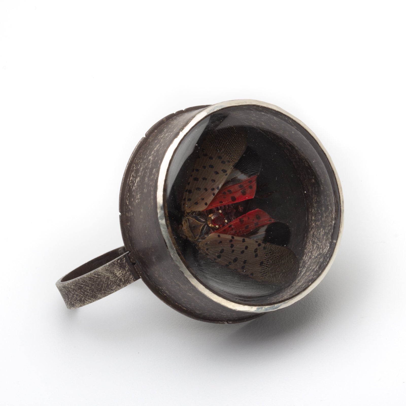 Artist Statement: Spotted Lanternflies are invasive insects from Asia taking a huge toll on the natural environment, affecting the Northeastern part of the USA and spreading rapidly! One of the only tactics in place to control these bugs is to squish them but encasing them in a shadow box is a better way to kill them, while also showcasing their beauty. This Spotted Lanternfly shadow box ring is fabricated in sterling silver, oxidized, and finished with a glittering texture. It is a three-finger statement ring with an adjustable band worn on the index and ring finger and would fit a size 5 to a size 10. The Lanternfly is held in place with a 14-karat gold and garnet pin in the shadow box and it's quite a stunner.