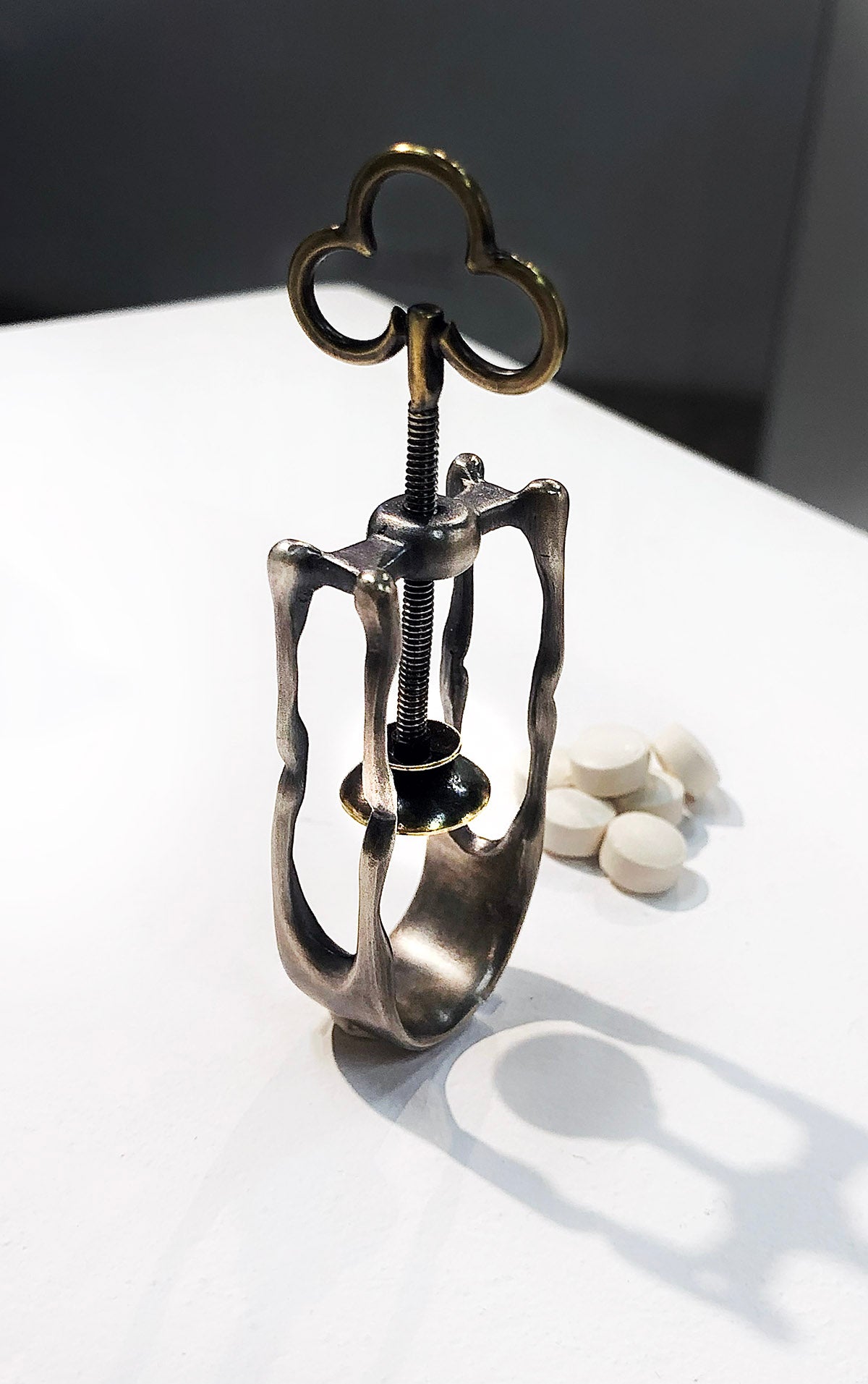 Artist Statement: Ever forget to take your medication daily? No need to worry anymore. With the new slick Pill Pusher you are able to take your pills anytime, anywhere. No water, no problem! Just place your pill in the Pill Pusher, slip the ring onto your finger of choice and twist done until snug.