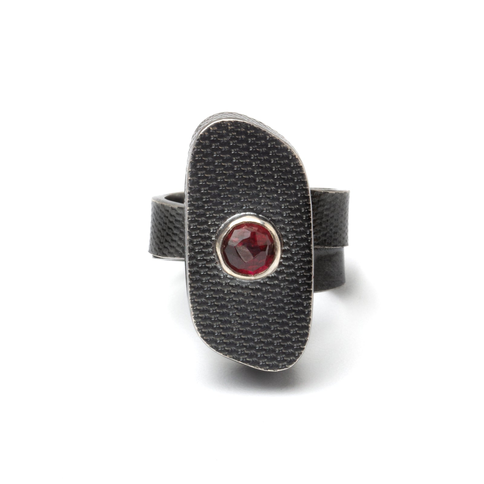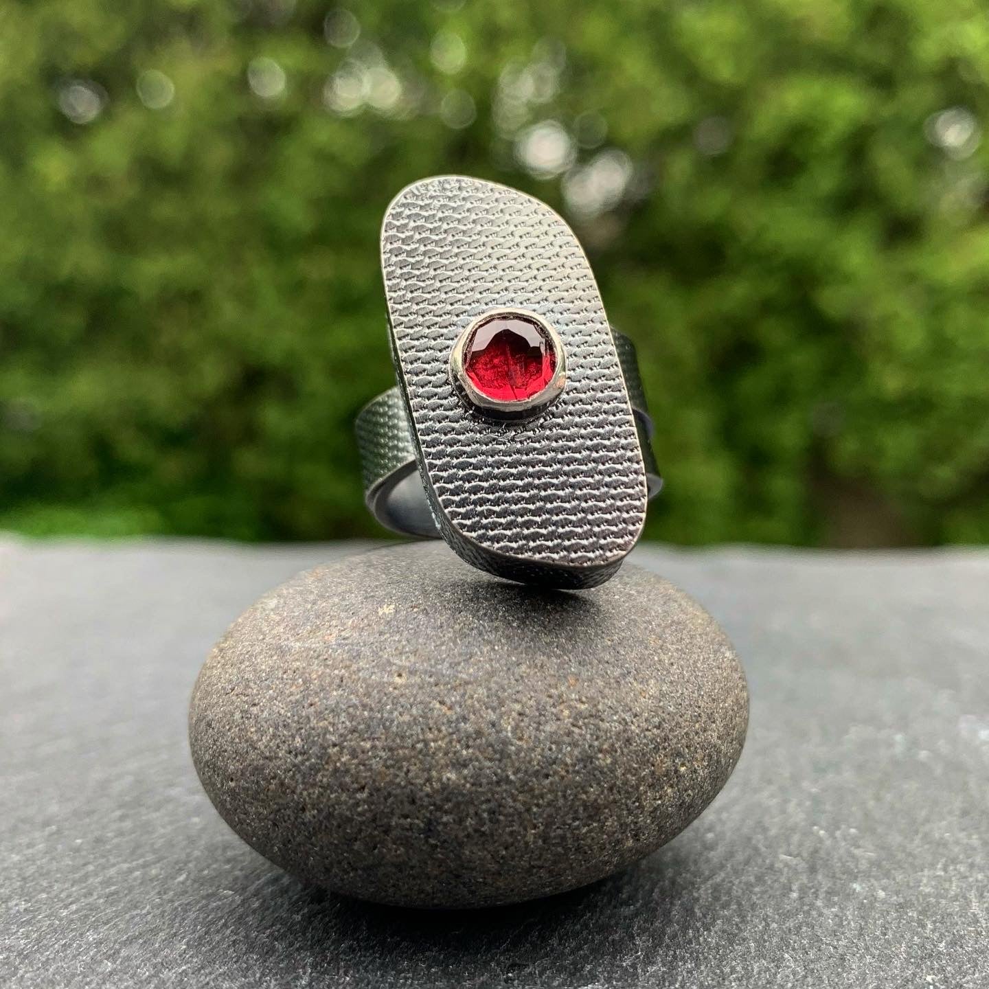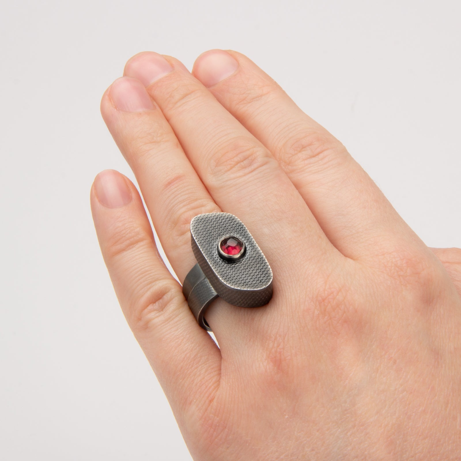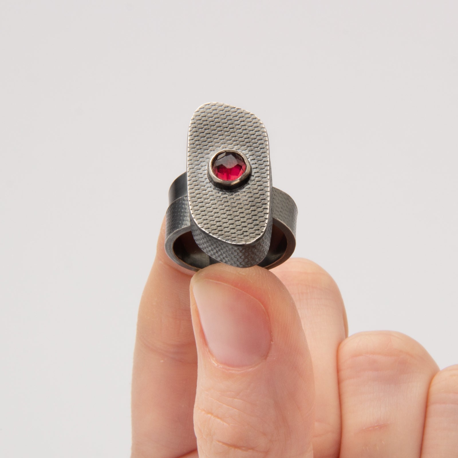 This platform is a hollow form construction built from sterling silver sheet. The face of the ring features a glowing Rhodolite Garnet cabochon, set in fine silver. The sterling silver has roller printed texture, adding an industrial element and more literal representation of the traditional railway platform. The double layer band is tapered, representing the ability of the spoken voice to travel far and wide.