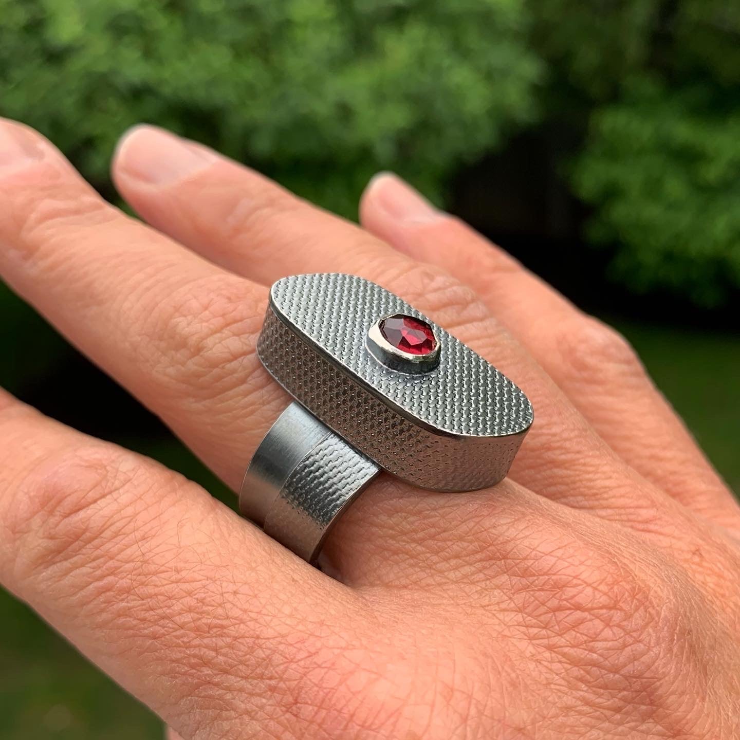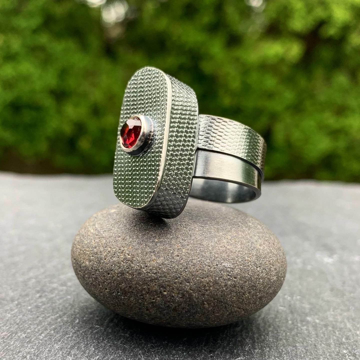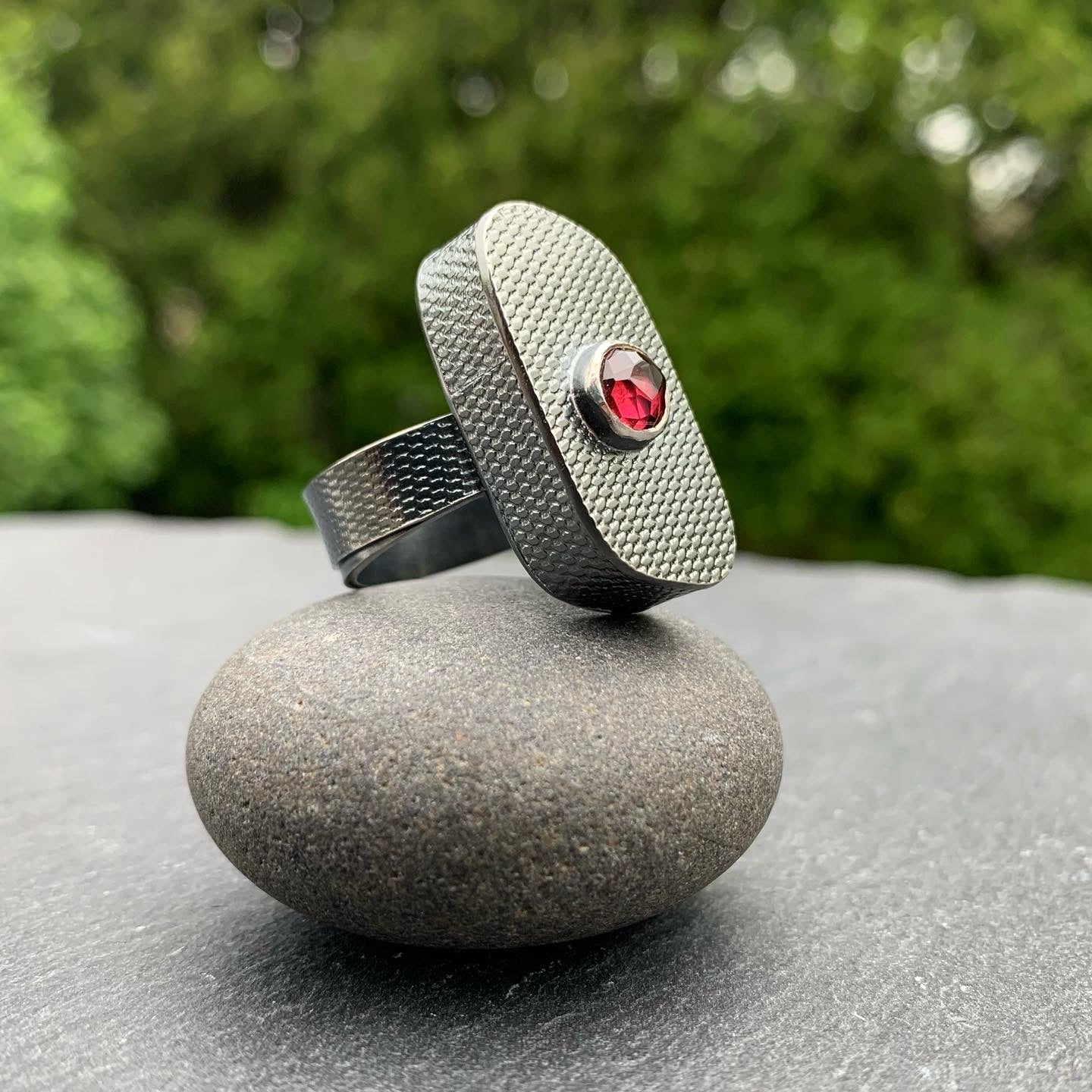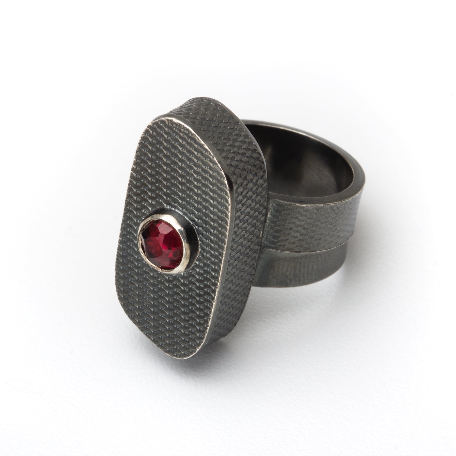 This platform is a hollow form construction built from sterling silver sheet. The face of the ring features a glowing Rhodolite Garnet cabochon, set in fine silver. The sterling silver has roller printed texture, adding an industrial element and more literal representation of the traditional railway platform. The double layer band is tapered, representing the ability of the spoken voice to travel far and wide.