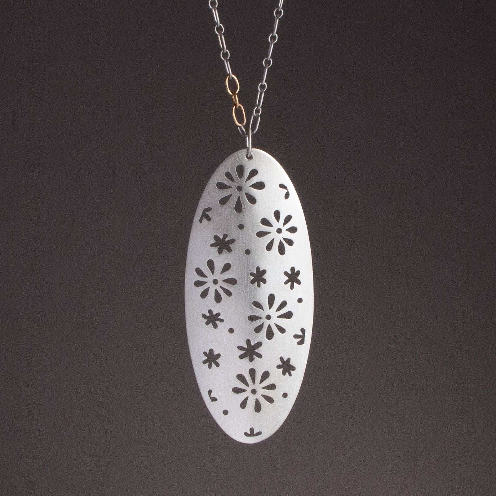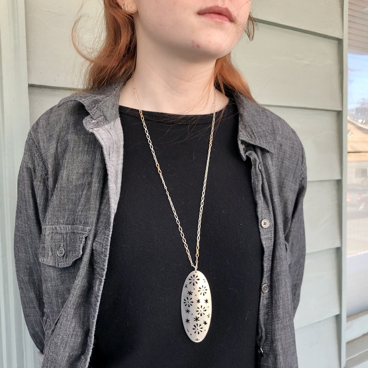 By integrating traditional metalsmithing techniques with more experimental surface treatments, I create jewelry from precious metals and other materials. Using favorite tools – heat, hammers, hands – I fabricate sculptural silver canvases on which I create pattern and texture by alternately adding and removing materials. Pairing graphic patterns with curving silver shapes whose edges would otherwise be undefined, I create a dichotomy between fixed and dynamic elements; the shapes establish boundaries for the patterns. These unique surfaces invite study, asking the wearer to not only put a piece on their body, but to look closely at it, to be moved by it.