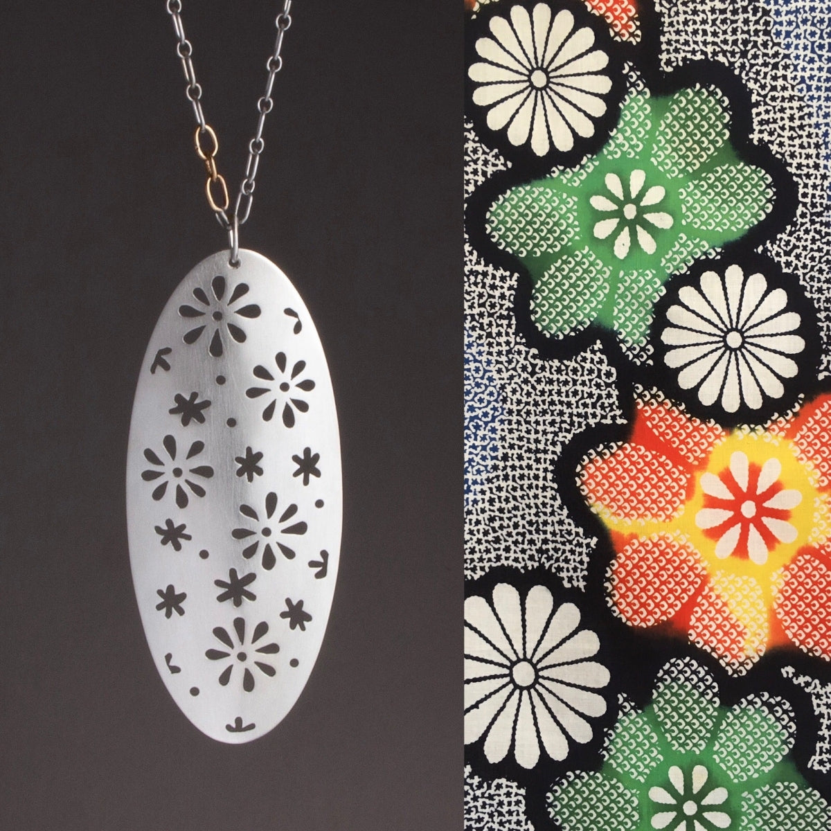 Artist Statement: Sometimes it's nice approach making a piece with no other motivation than to be decorative. This necklace is inspired by the chrysanthemums on my chosen fabric and allowed me some peace and relaxation while creating it. In our current chaotic world, that feels like enough inspiration.
