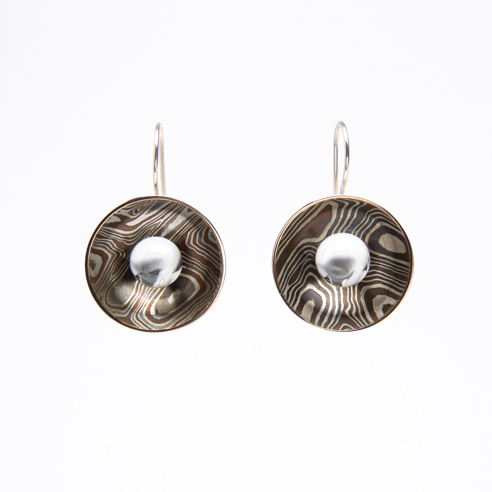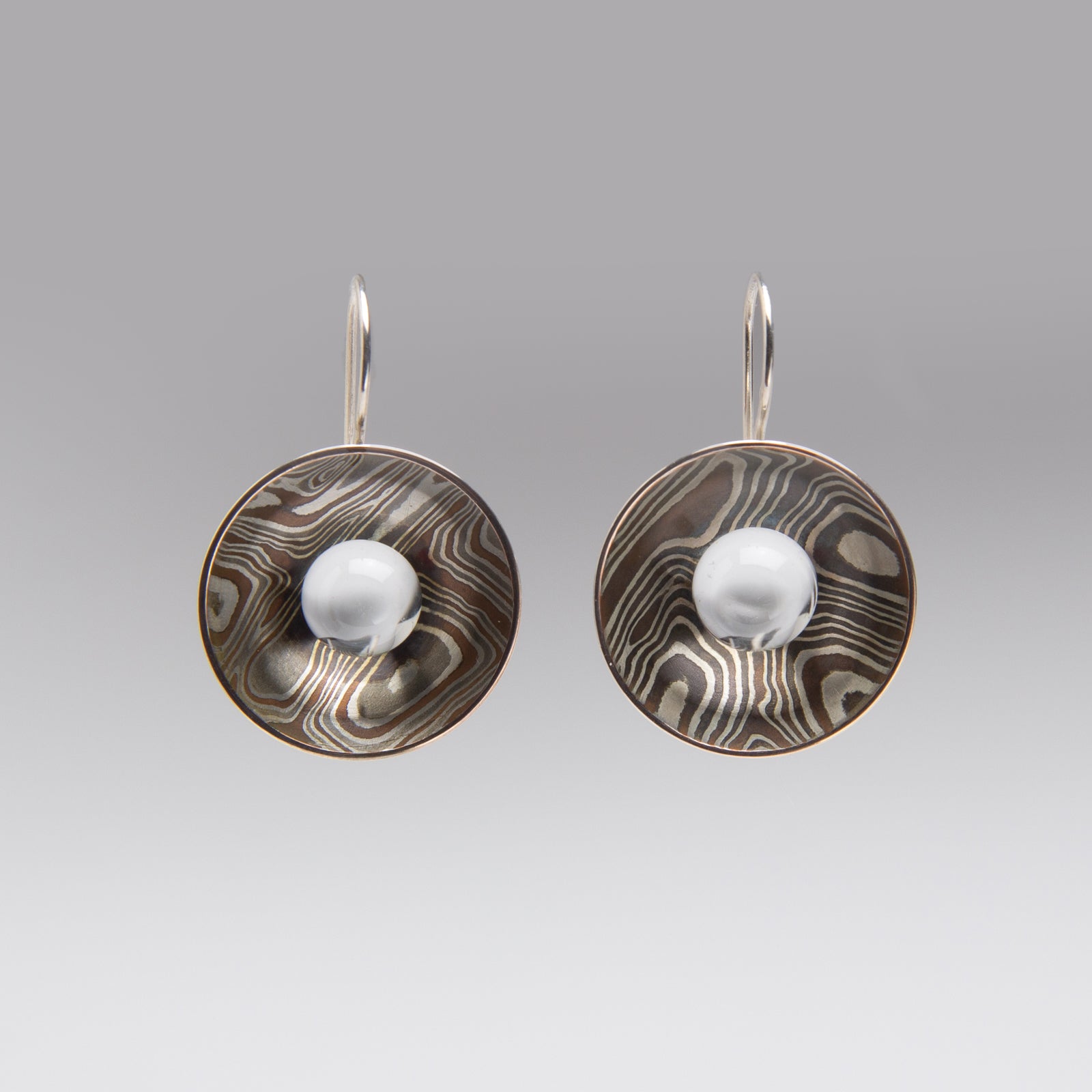 Story behind the piece: The mokume-gane patterns are so beautiful, I wanted to make simple earrings with a clear glass focal point in the center to catch the eyes of the viewer so as to draw them in to appreciate the flowing lines of the mokume-gane.