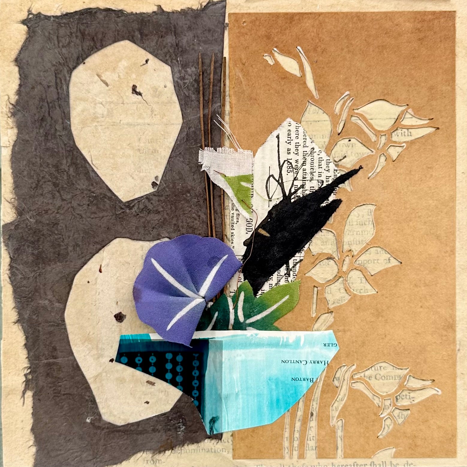 Artist Statement: The fabric patterns I received related to florals: ikebana (the art of flower arranging) and morning glory. My mother was an artist and landscape designer who studied Japanese gardens and took several ikebana courses, so I decided to create my pieces as a tribute to her and her work. This pair of mixed-media ikebana compositions uses handmade and printed papers, stencils, and gestural ink sketches, combined with organic material, floral wire, and free-form blossoms from my kimono material. These flowers won’t fade, and they serve as a lasting reminder of the beauty of the ordinary, the everyday, the commonplace—a breath of calm in our busy world.
