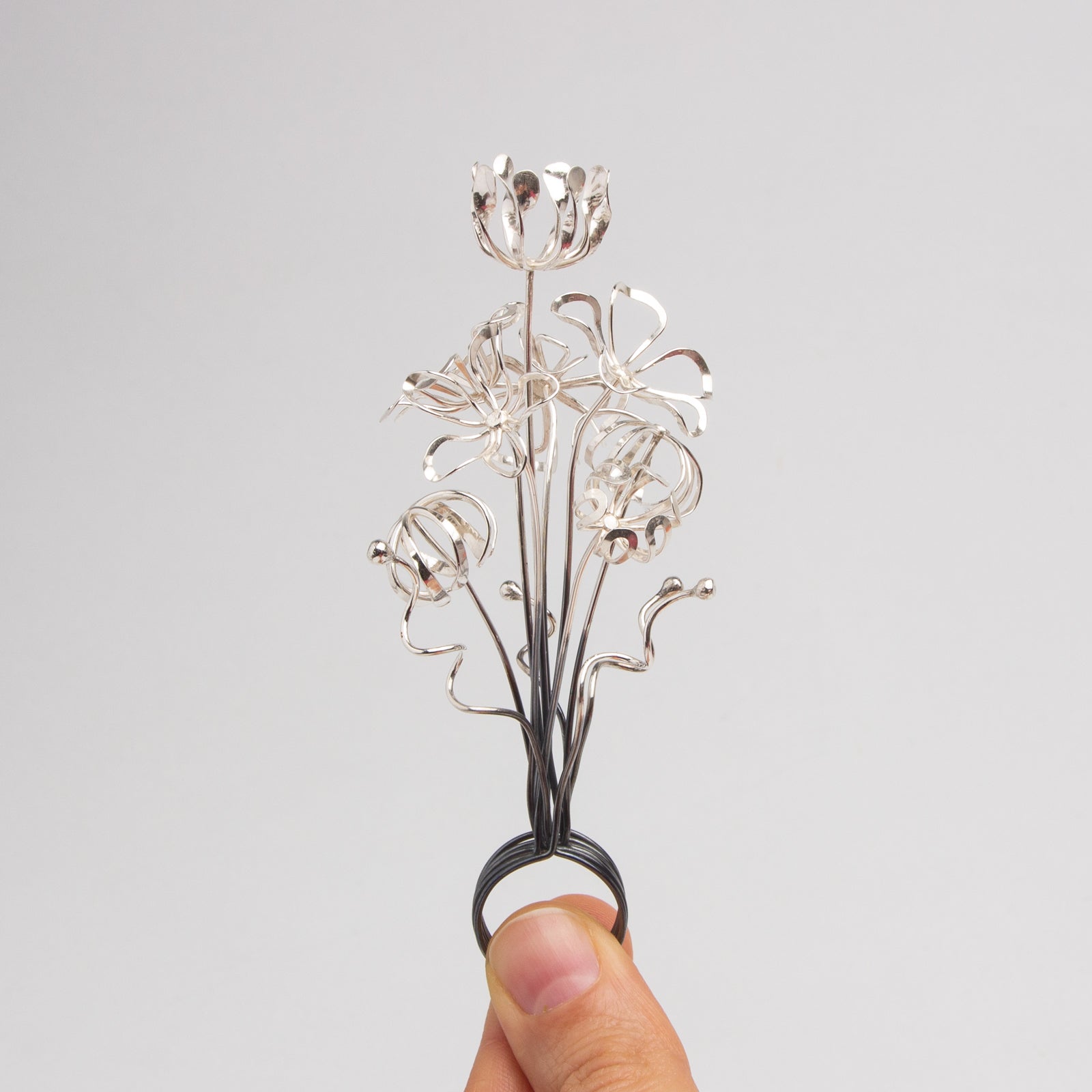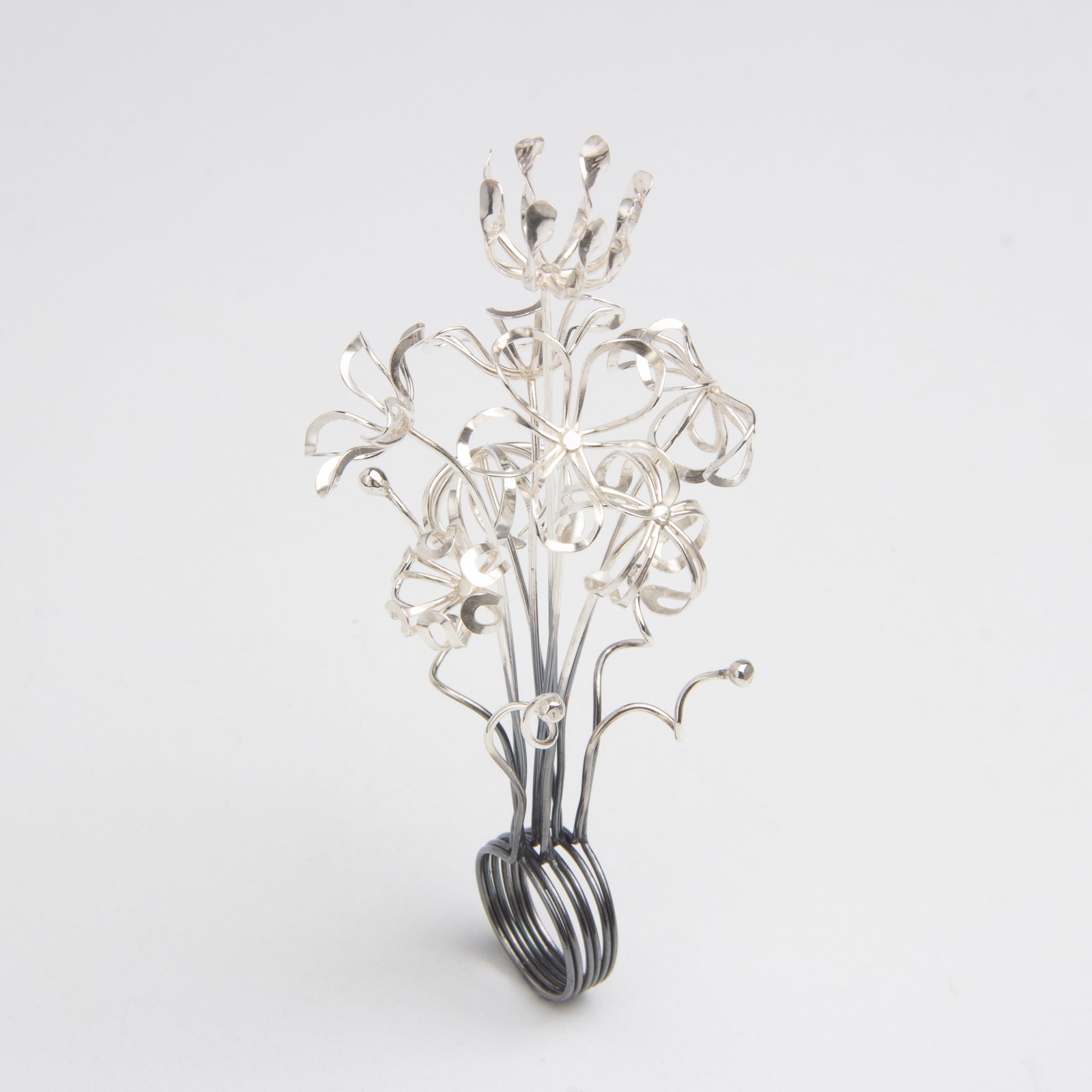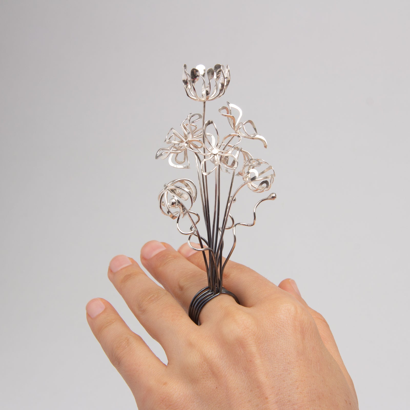 Artist Statement: This ring is a wearable bouquet, the perfect accessory for a garden party, soiree, or any event where you need an excuse to not shake hands. When not adorning your fingers, it lives on as a forever bouquet that will never wilt or mold.