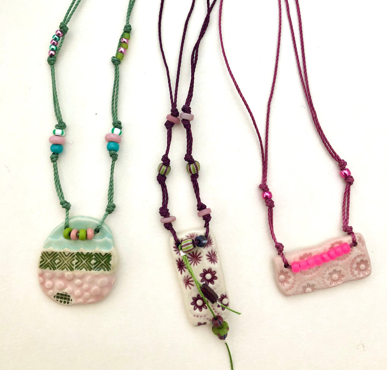 Small textured wobbly oval necklace in blue, pink, and green with green, pink, and blue beads.