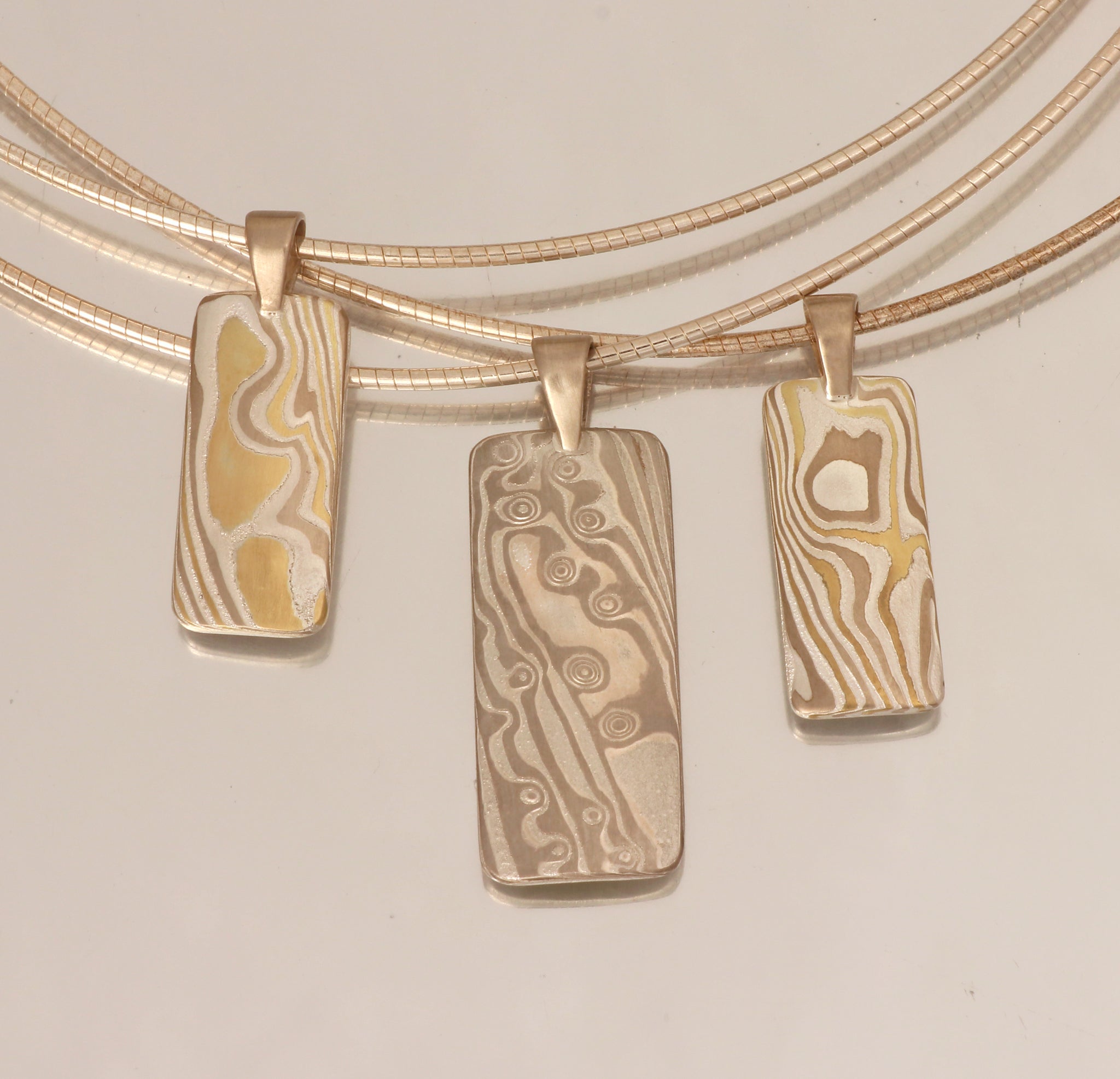 Suspended from a sturdy cable chain, this refined pendant showcases an exquisite etched mokume design that captures the organic beauty of wood grain.