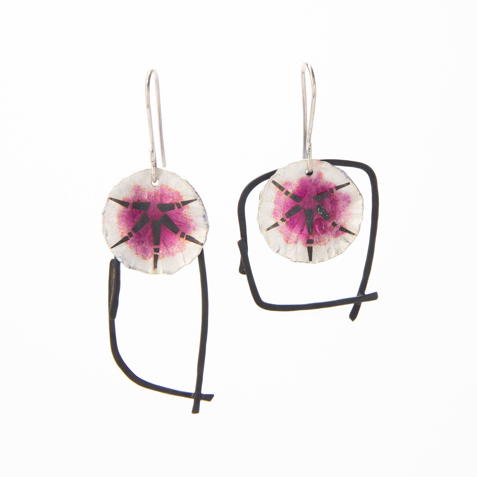 Earrings 2 : Fine Silver, Vitreous Enamel, Sterling Silver, Sterling Silver Ear Wires., 3/4" W x 2-1/4"L x 1/8" D; Earring 2 - 1" W x 2" L x 1/8" D inches