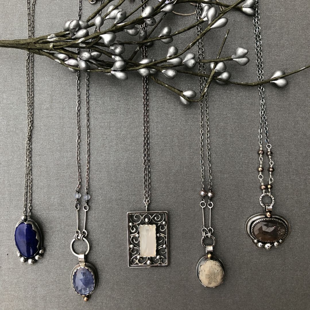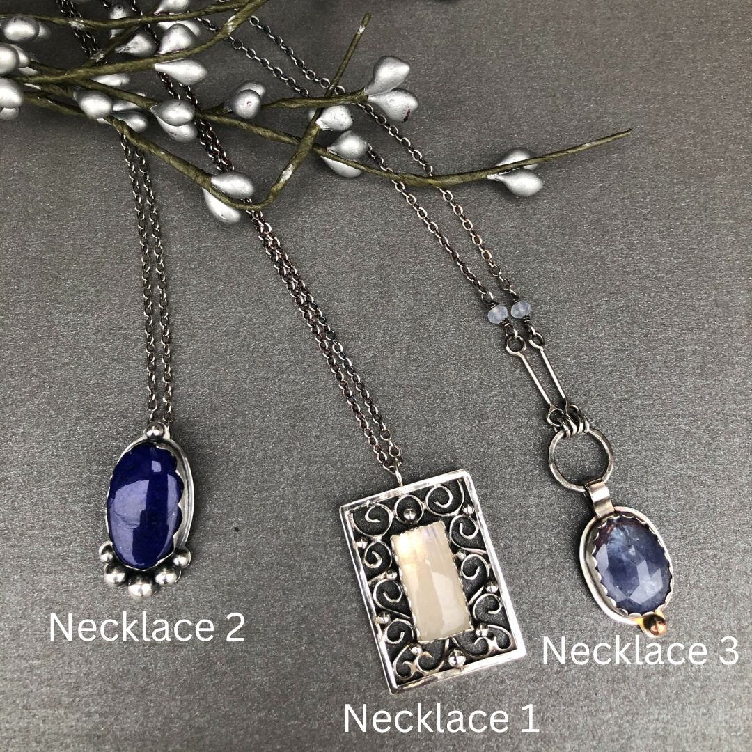 - Necklace 3: Tanzanite and sterling with brass accent and chalcedony beads, length 19"