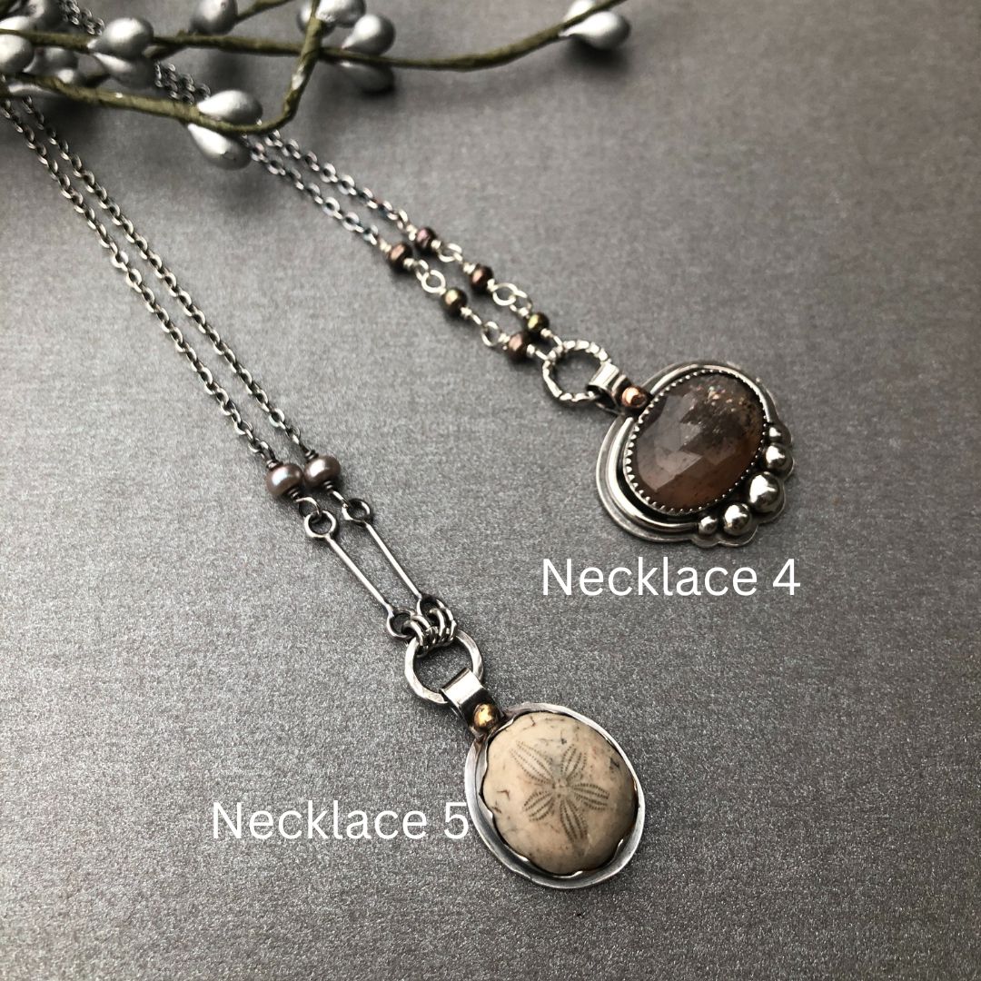 - Necklace 5: Fossilized shell and sterling with brass accent and pearl beads, length 19""