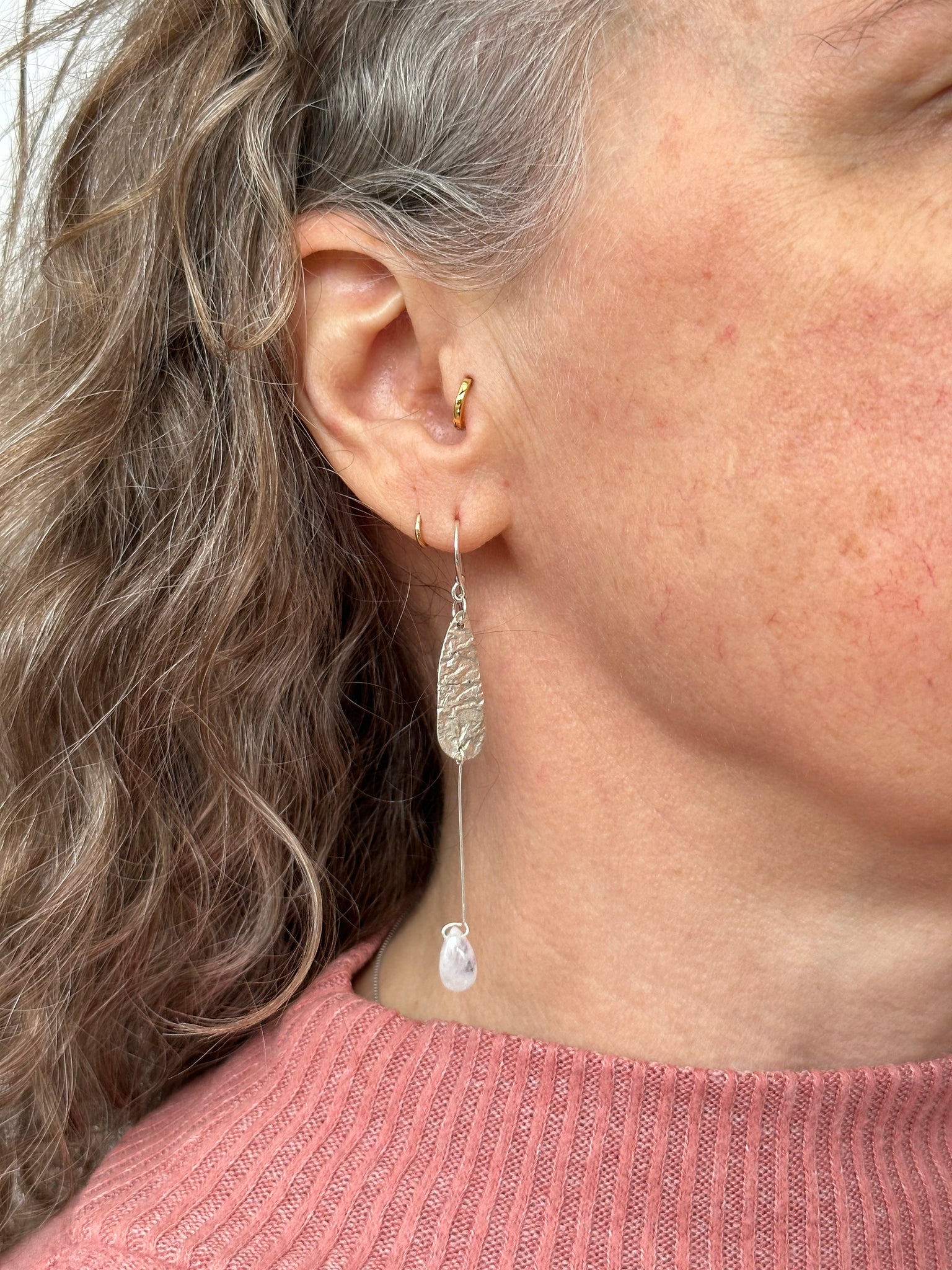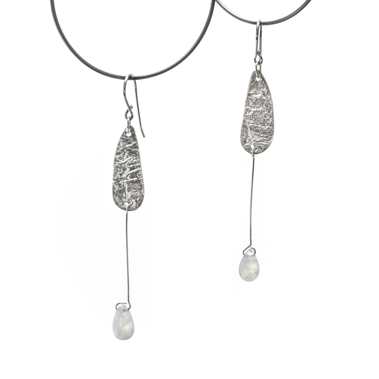 Experimenting to see if 'moon texture' silver pairs well with moonstones. Each earring has its own character thanks to the textures in the metal (both from the same piece of reticulated silver, made in class this past summer!) and the occlusions in the stones.