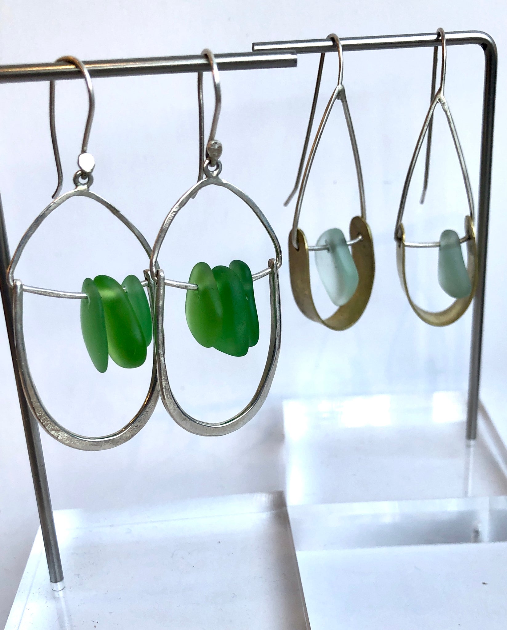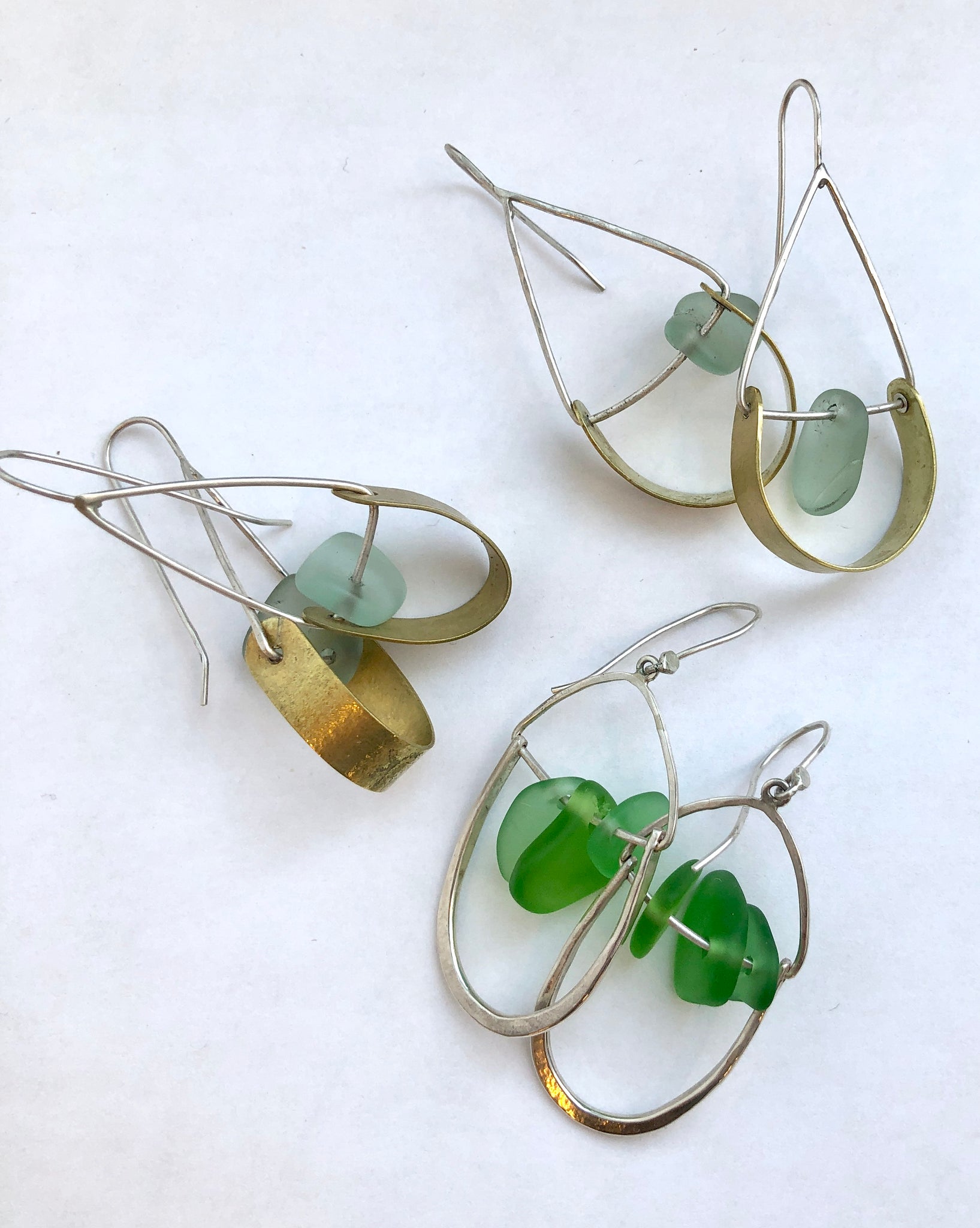 - Earrings 1: Brass, silver and sea glass, length 2.5"