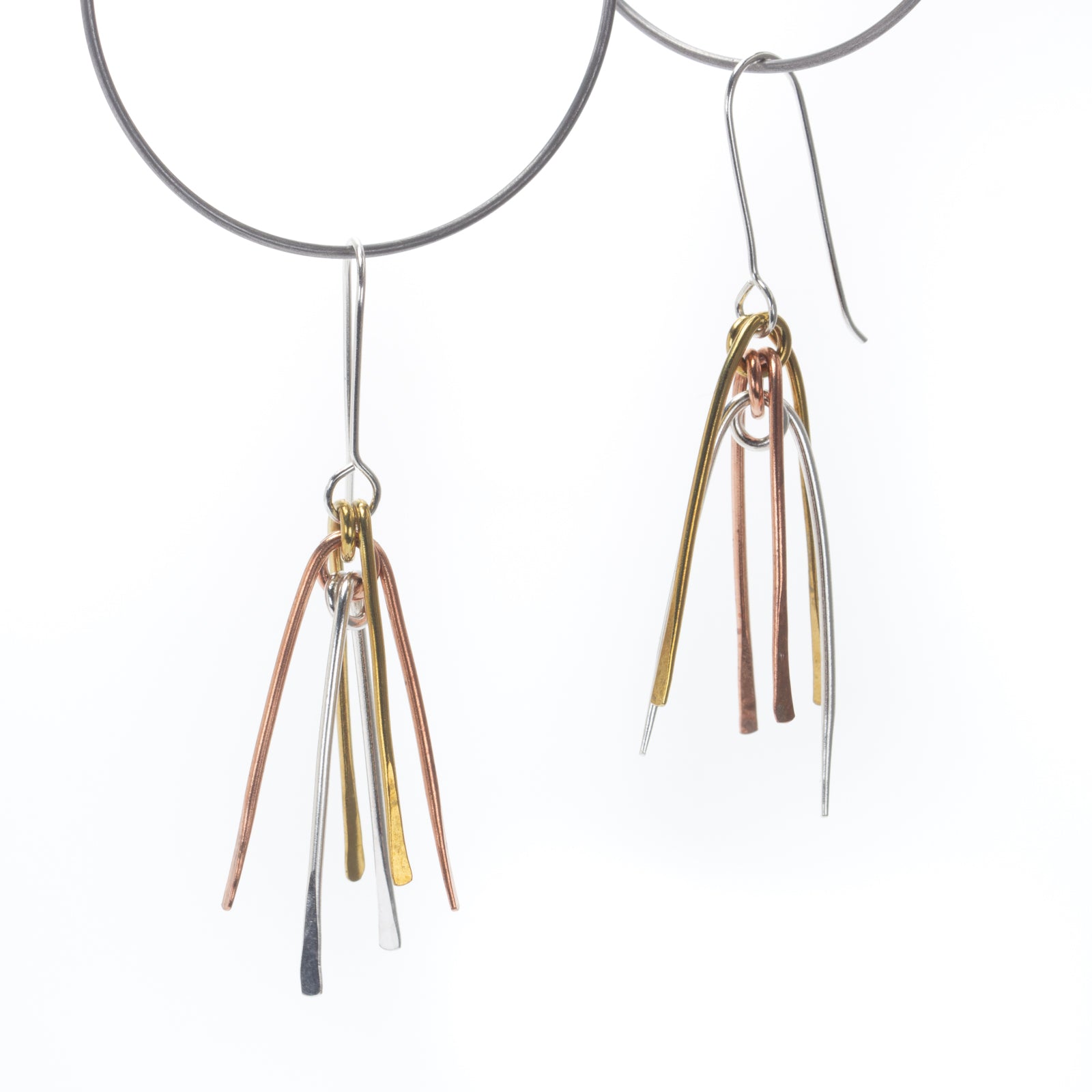 Description: I wanted to create some Calder inspired earrings from wire that had movement. After several iterations, I landed on this one. Using different metals added interest.