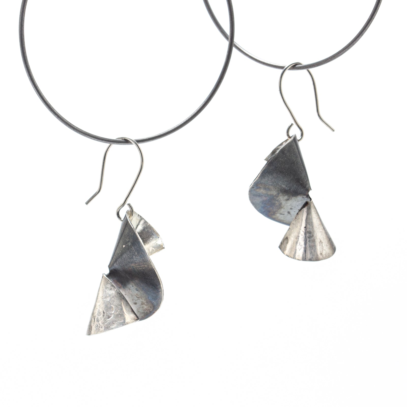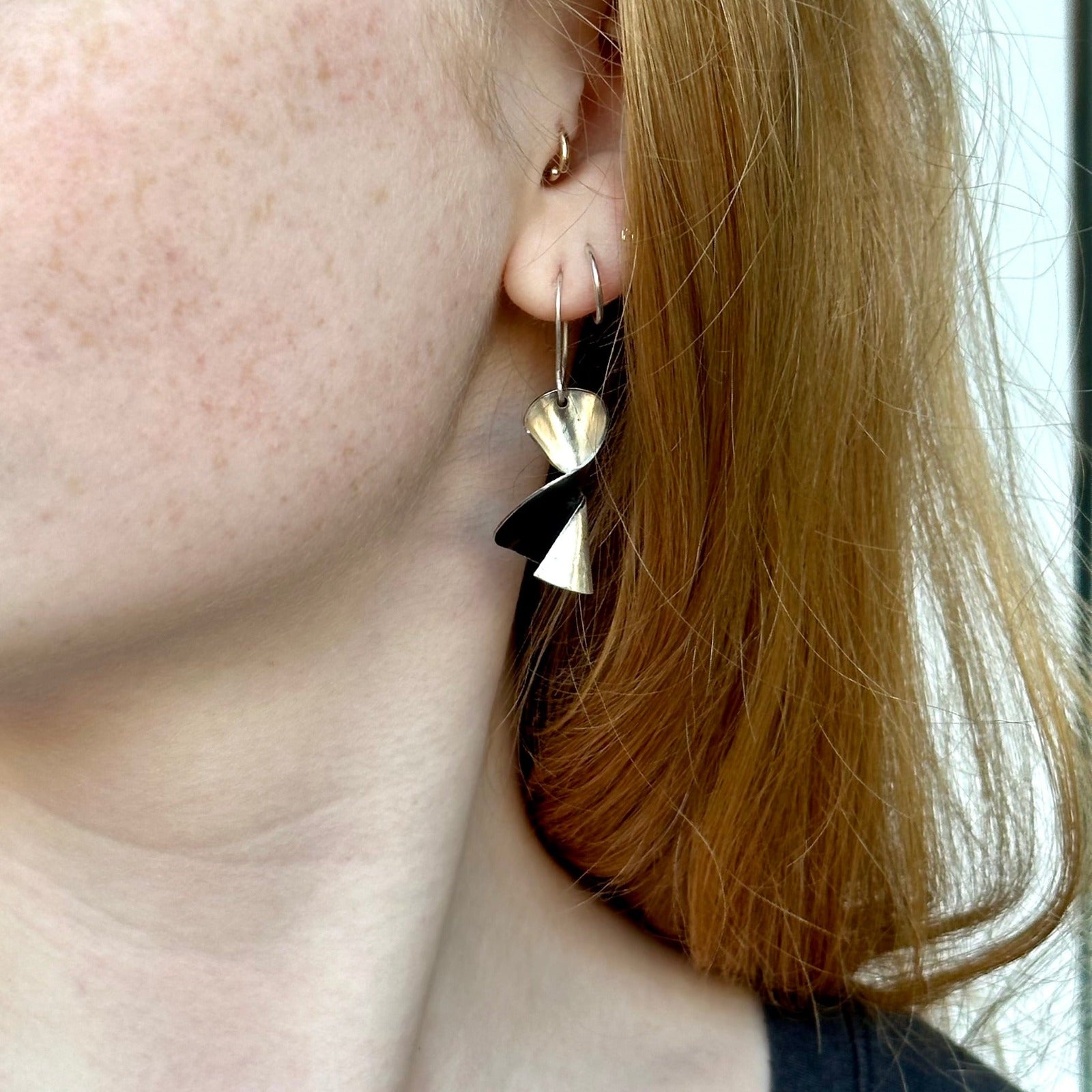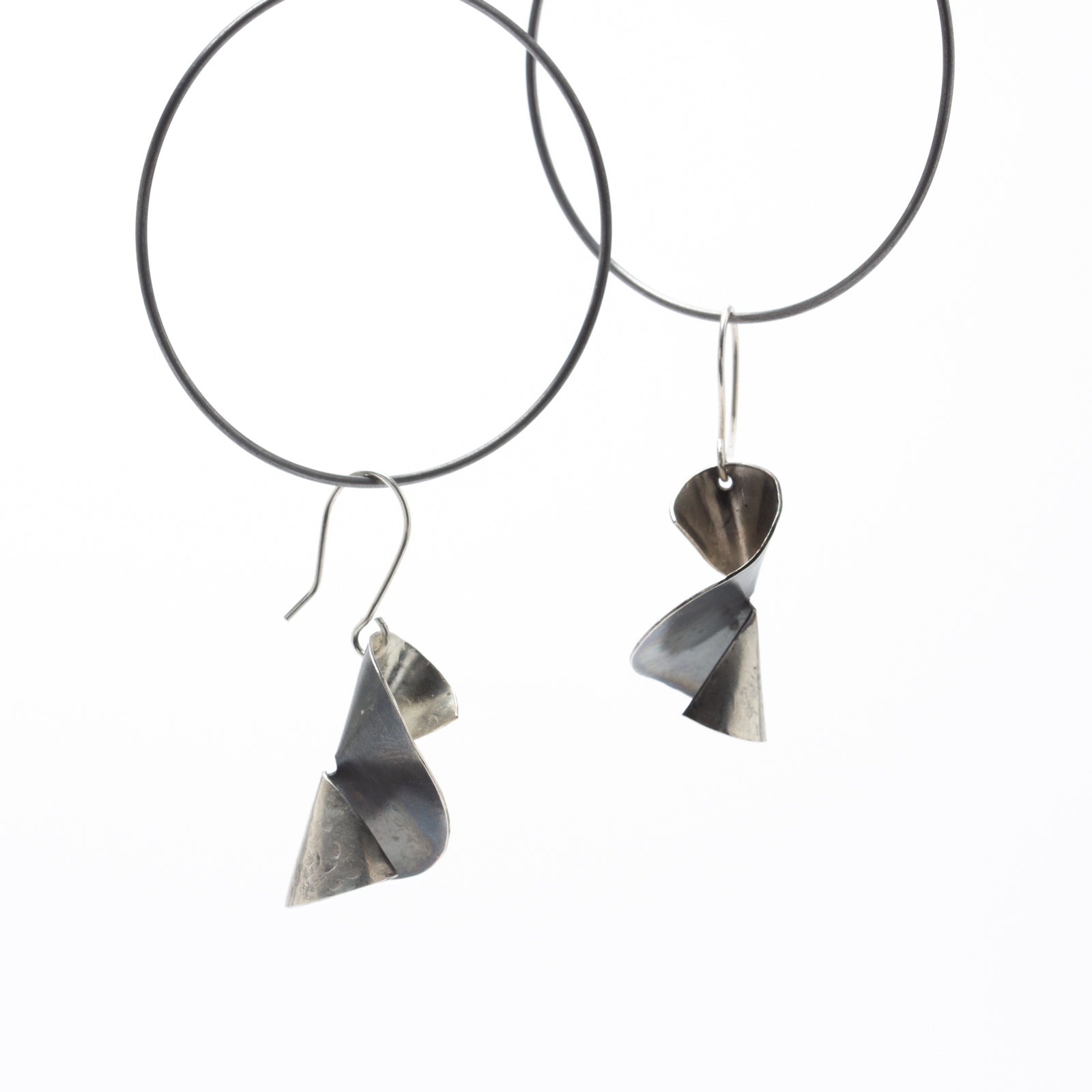 Beginning with a 1.25" silver disc, I cut to the center and twisted ends. Then polished one side and other side has dark patina.