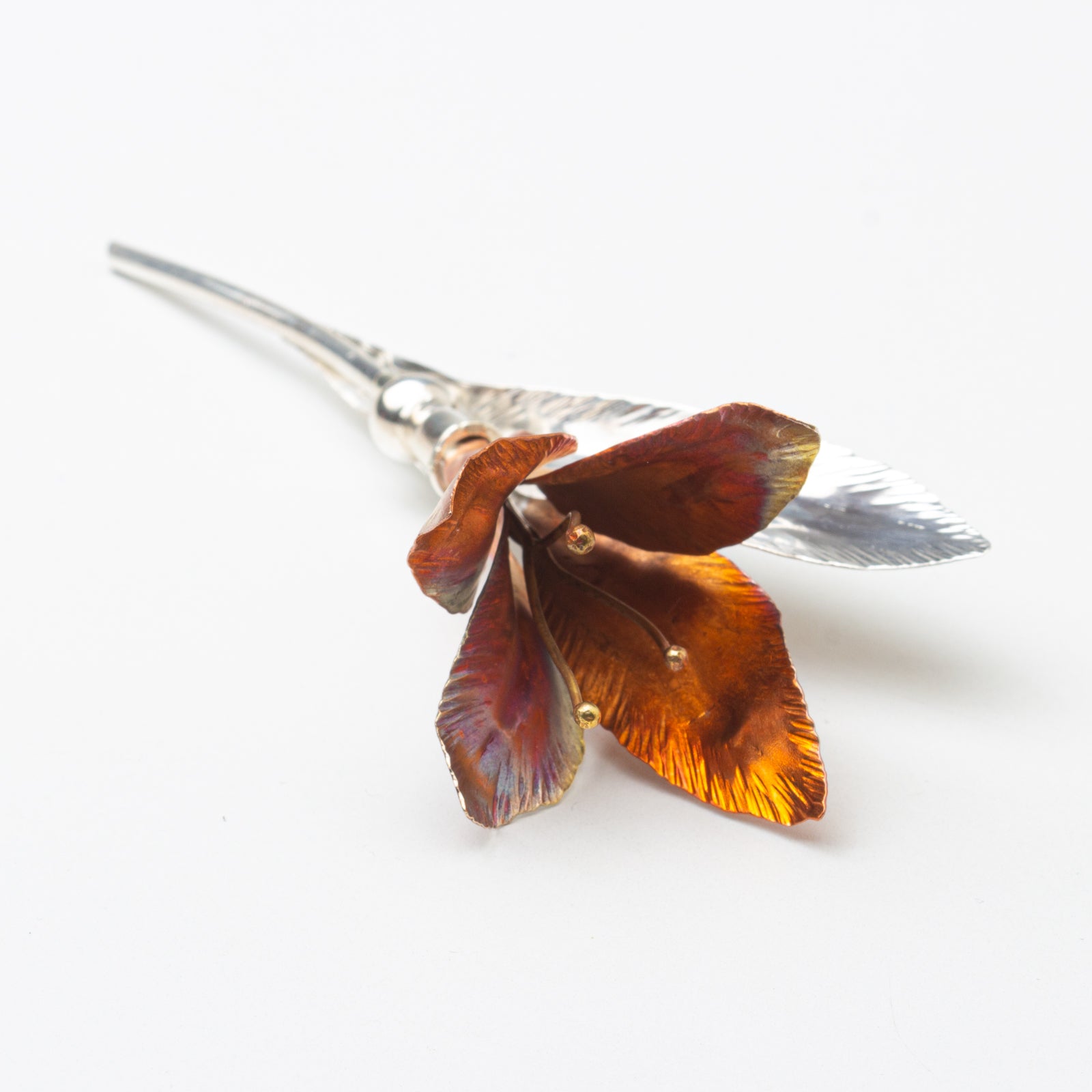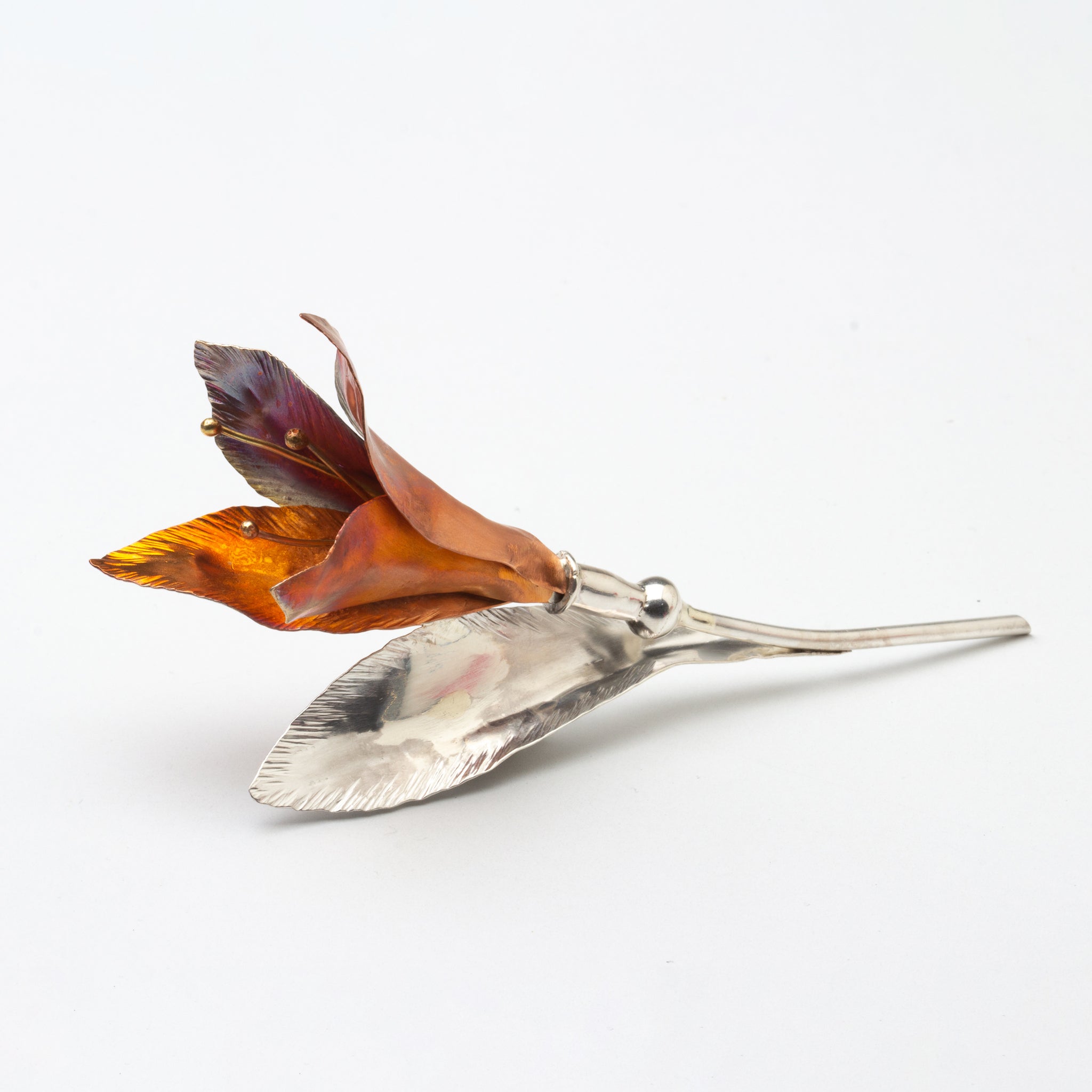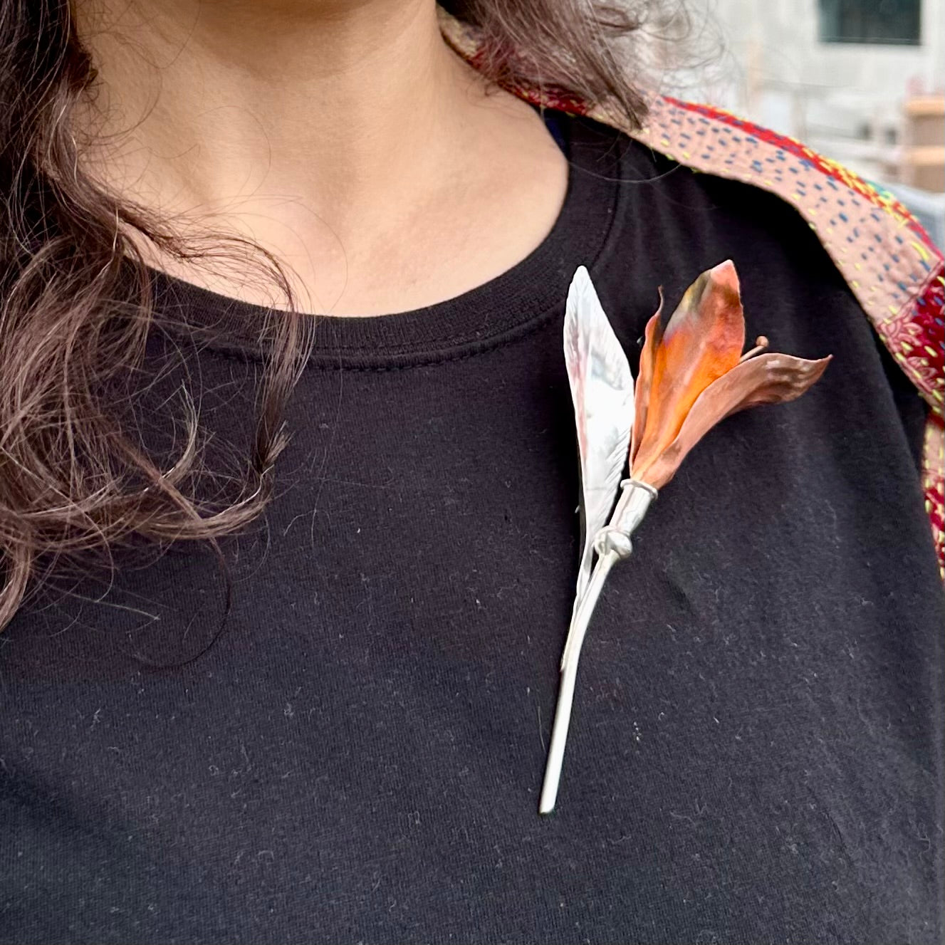 The brooch is hand fabricated from mixed metals. I always love mixing colors in metals, and copper is one of my favorites, for its warmth and the colors you can create from oxidizing the metal.
