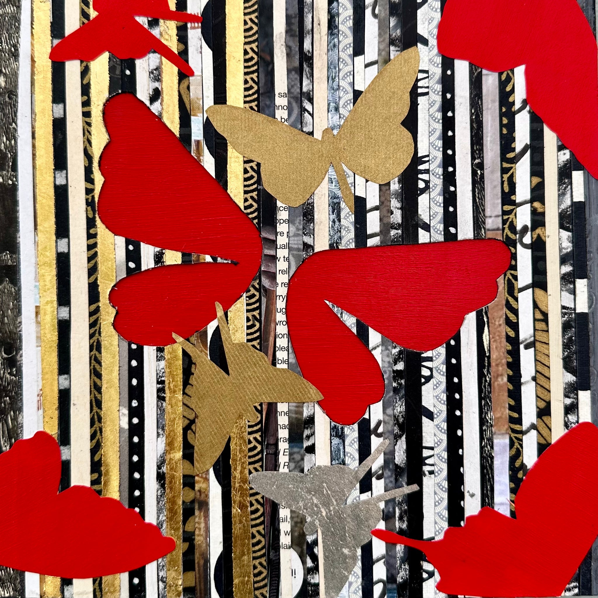 Artist Statement: I sought to replicate the essential fabric design using paper and gold leaf.